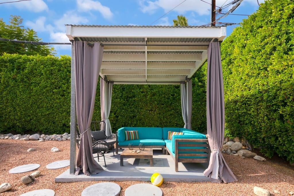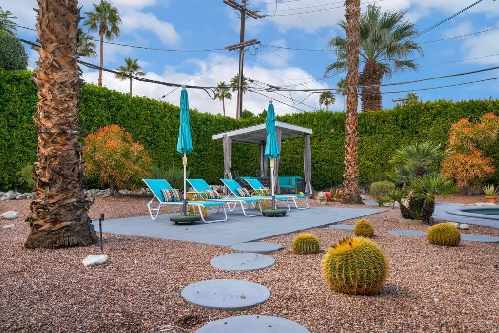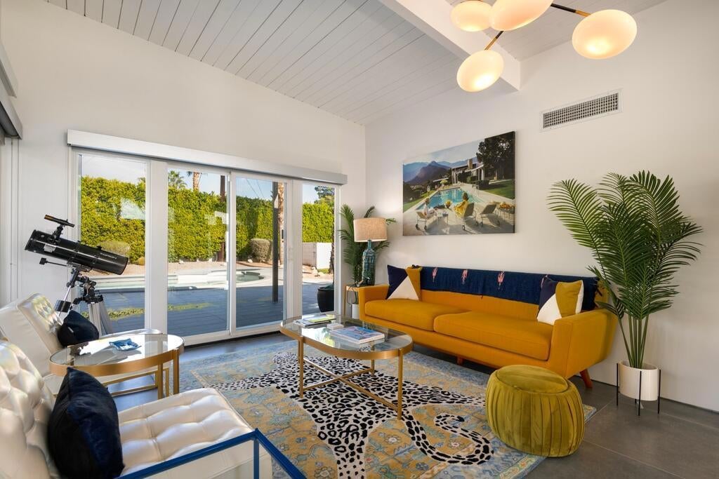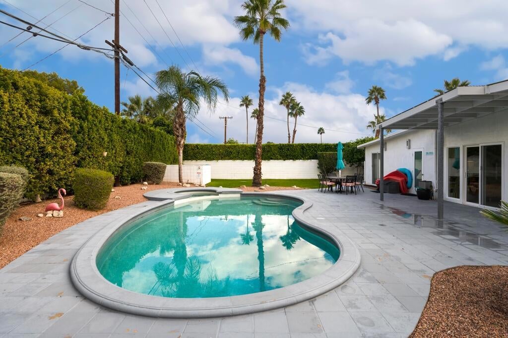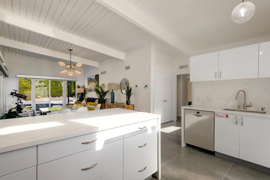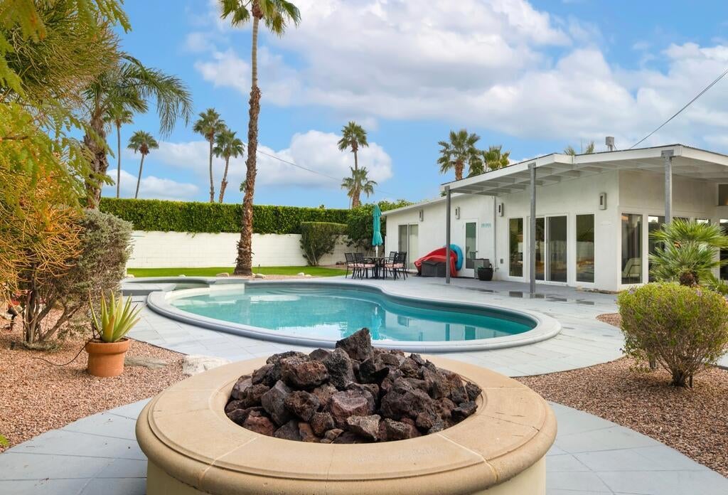Simply gorgeous and move-in ready, this iconic mid-century modern Alexander single-level home has been tastefully updated to offer today's modern amenities while preserving its classic architectural appeal. Stunning curb appeal welcomes you into a light-filled, open-concept living space featuring vaulted, beamed ceilings, beautiful light fixtures, tile flooring, dual-pane windows, and expansive sliding glass doors that seamlessly bring the outdoors in throughout the home.The living room showcases an eye-catching feature wall and a cozy corner fireplace, flowing effortlessly into the dining area and family/media room--perfect for entertaining or relaxing. Just off the main living space is the updated kitchen, complete with white cabinetry, stainless steel appliances, bar seating, and a striking quartz waterfall counter ideal for casual meals or morning coffee.All three bedrooms feature private sliding glass door access, creating an exceptional indoor-outdoor connection. The spacious primary suite offers backyard access with pool views and a private ensuite bathroom. The two guest bedrooms open to a charming side yard with mature citrus trees. Both bathrooms have been updated with full-size showers, and a convenient stackable laundry closet is located in the hallway. Step outside to a large, private backyard oasis designed for relaxation and entertaining. Enjoy the in-ground saltwater pool and spa (recently updated in 2023), well-manicured desert landscaping and rockscaping, lush privacy hedge, built-in awning for shaded lounging, and a built-in firepit. The expansive yard even offers room to build an ADU or casita. Additional features include a large two-car carport and ample driveway parking. Whether you're seeking a full-time residence, part-time getaway, or excellent vacation rental opportunity, this home delivers. Ideally located just minutes from Downtown Palm Springs, fine dining, shopping, golf courses, casinos, museums, and all that Palm Springs has to offer. Schedule your private tour today!