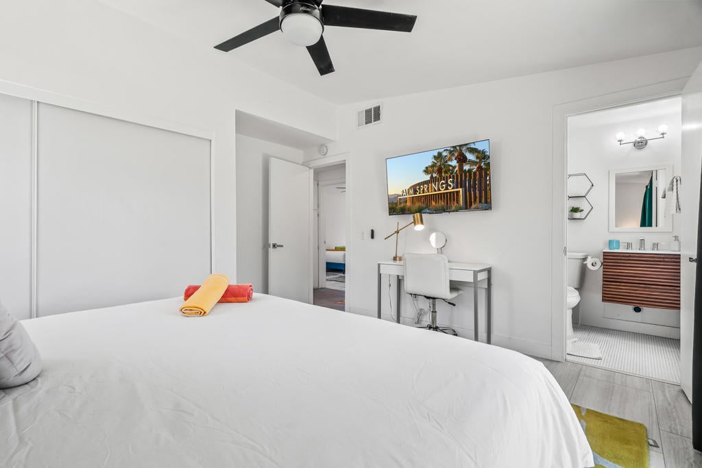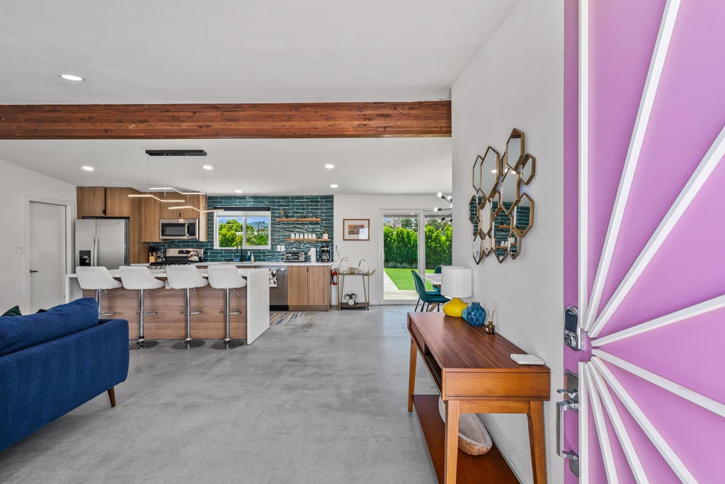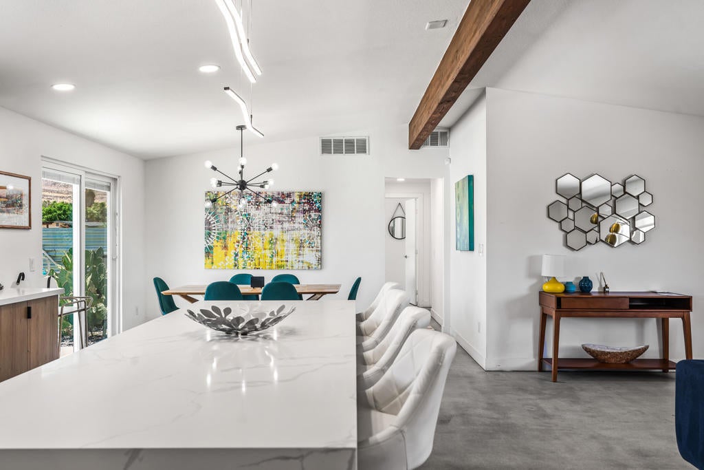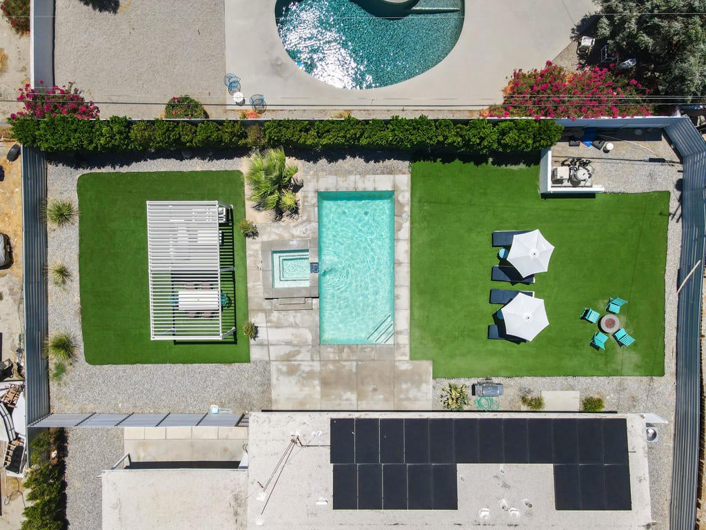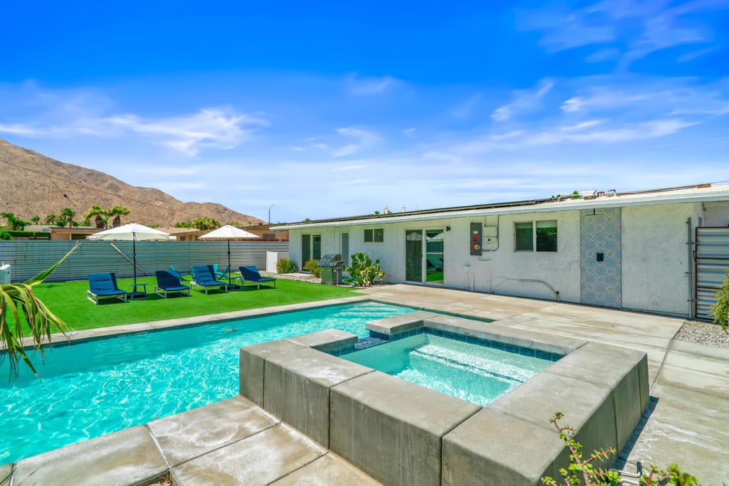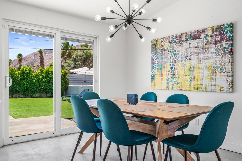 835 Rosa Parks Drive delivers a modern Palm Springs experience with unobstructed mountain views, clean architectural lines, and a quarter-acre lot designed for indoor-outdoor living. This updated 3-bedroom, 2-bath home offers nearly 1,300 square feet of comfortable, efficient space and stands out as a highly successful short-term rental, producing close to $100,000 in gross revenue over the last 12 months with a CAP rate above 9 percent. Whether for full-time living, a seasonal getaway, or an income-producing investment, the property offers flexibility, style, and strong long-term value.Step inside to an open living area that feels bright and relaxed, centered around a modern kitchen with slab-style cabinetry, stainless appliances, statement lighting, and a large island that anchors the space. Polished concrete floors, neutral finishes, and natural light create a clean backdrop that works with a variety of design styles. The living and dining spaces flow easily for hosting, movie nights, or quiet weekends at home.The bedroom layout is thoughtfully designed, with a serene primary suite that opens directly to the backyard through sliding doors. Views of the San Jacinto mountains and the outdoor living spaces provide a resort-like atmosphere from the moment you wake. Two additional bedrooms offer flexibility for guests, remote work, or creative use.The backyard is the heart of the property. A large pool and spa sit against the backdrop of Palm Springs' iconic mountain range, creating a striking setting day and night. Expansive turf areas offer space for lounging, games, and gatherings, while a shaded pergola is ideal for outdoor dining. A firepit and outdoor shower enhance the experience and make the home functional for year-round desert living. The layout supports both privacy and play, making it equally appealing for personal use or vacation rental guests.Owned solar panels and EV charging add value and efficiency, contributing to low operating costs and sustainable living. The home is set in a quiet residential neighborhood just minutes from downtown Palm Springs, offering quick access to dining, shopping, hiking, golf, and the airport.With modern style, strong income potential, and panoramic mountain views, 835 Rosa Parks Drive delivers an exceptional Palm Springs lifestyle in one of the desert's most sought-after destinations.