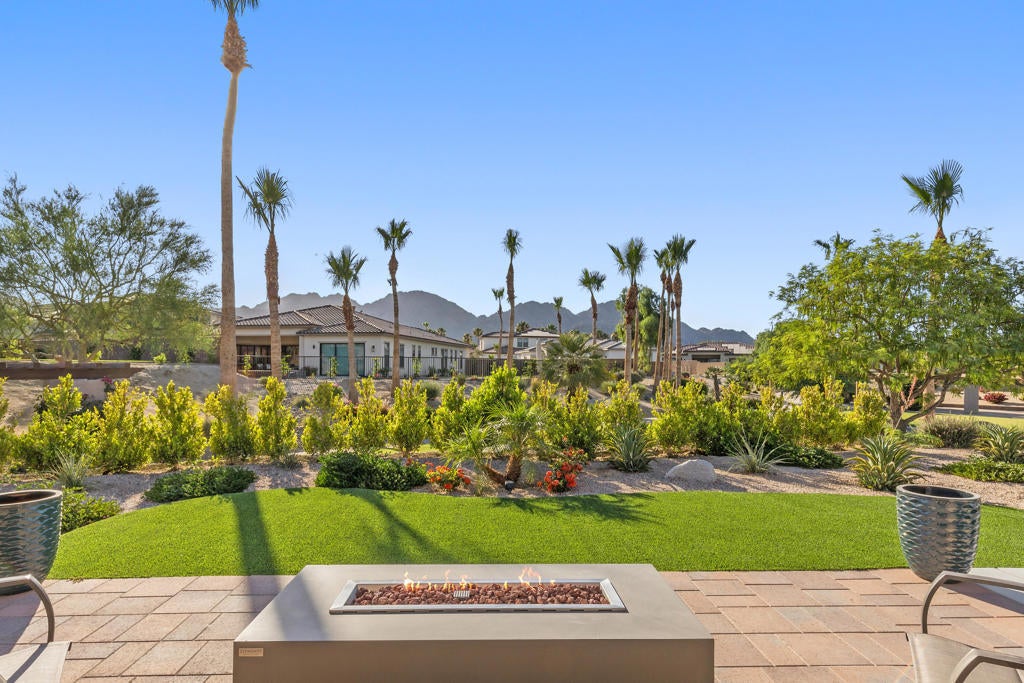 Welcome to your dream home in the prestigious community of Stone Creek Ranch, where luxury meets serenity. Nestled in a lush park-like setting with waterfalls, a tranquil pond, and tree-lined gardens, this beautifully appointed 2879 sq. ft. residence sits on an oversized lot in one of the most desirable areas of the community with stunning mountain views.This 3-bedroom plus office/den (optional bedroom), 3.5-bath home is designed for both relaxation and entertaining. The spacious great room flows seamlessly into a sleek, modern chef's kitchen--complete with clean lines and a contemporary color palette of whites, greys, and blacks. Expansive pocket doors open to a resort-style backyard where mountain views take center stage.Outdoor amenities include a private pool and spa, an oversized built-in BBQ station, fire pit, TV above an outdoor fireplace, and even a putting green--perfect for hosting unforgettable gatherings or enjoying peaceful desert evenings.Additional features include custom baseboards, owned solar, and tasteful furnishings included per inventory.This is more than a home--it's a lifestyle. Schedule your private tour today and discover why Stone Creek Ranch is one of the desert's hidden gems. It is located close to world class golf/country clubs, Lake Cahuilla, the 'Coachella' & 'Stagecoach' festivals and numerous walking and hiking trails