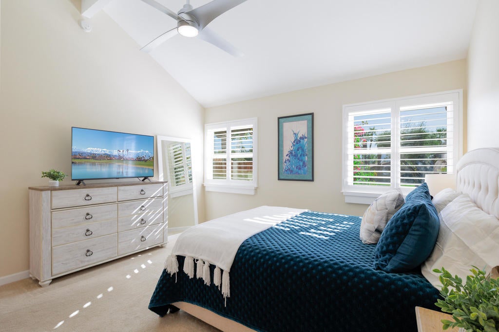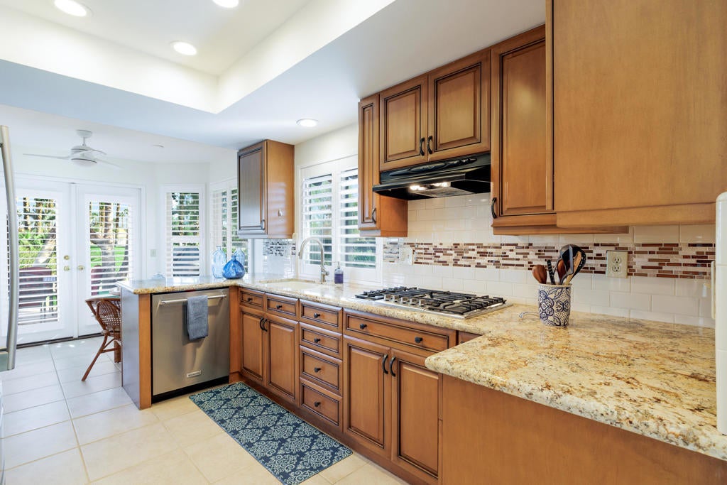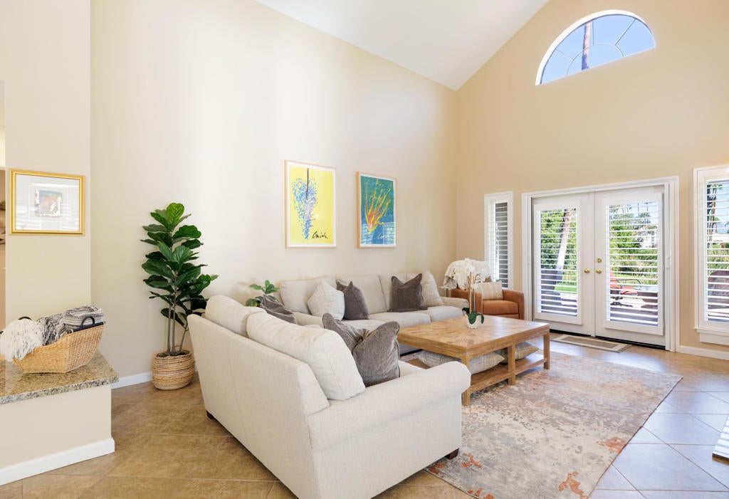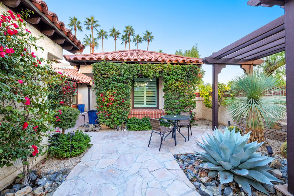 Located behind a dedicated gate in the Barcelona homes cul de sac (the original Desert Falls model-home enclave with its own private pool and spa), this beautifully remodeled, east-facing residence offers the views and desert lifestyle you'll love. A custom landscaped, flagstone tiled courtyard, welcomes you -- an ideal spot for morning coffee or evening entertaining. Inside, the home has been remodeled throughout with neutral tile in the living areas and timeless finishes.This beautiful 3 bedroom 3 bath condo is light and bright with, 5 sets of French doors and an abundance of shutter framed windows. Two primary suites and a 3rd bedroom currently used as a den/office. Each bathroom has been stylishly updated. The primary bath features white quartz countertops, white cabinets, expanded walk-in shower, and walk-in closet. Secondary primary suite features whirlpool tub and frameless glass shower. Remodeled guest bath continues with white quartz countertops, white cabinets, and dramatic floor to ceiling star tiles.The living area boasts cathedral ceilings, a floor to ceiling granite tiled surround fireplace, built-in cabinets, and floating shelves. The kitchen shines with newer cabinetry, high-end granite countertops, and an eat-in dining area. Step out back to an expanded paver-tiled patio and take in serene golf course and lake views--perfect for enjoying the morning sun. Unbeatable location--just steps to tennis, pickleball, fitness, and the Desert Falls Country Club. Enjoy a resort-style experience with extensive services and amenities included in your HOA dues: 24-hour guard-gated entry, tennis & pickleball courts, fitness center, and community pools. Located minutes from El Paseo, fine dining, and world-class retail. Close to the Acrisure Arena--home of the Coachella Valley Firebirds and a venue for major concerts and events. The privately owned Desert Falls Country Club offers pay-as-you-play or membership options.