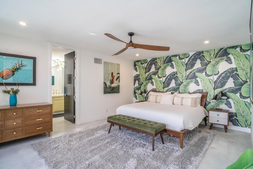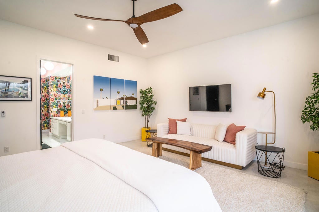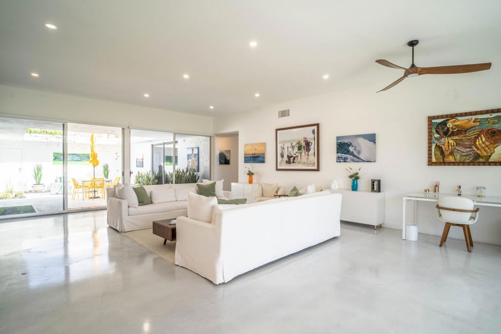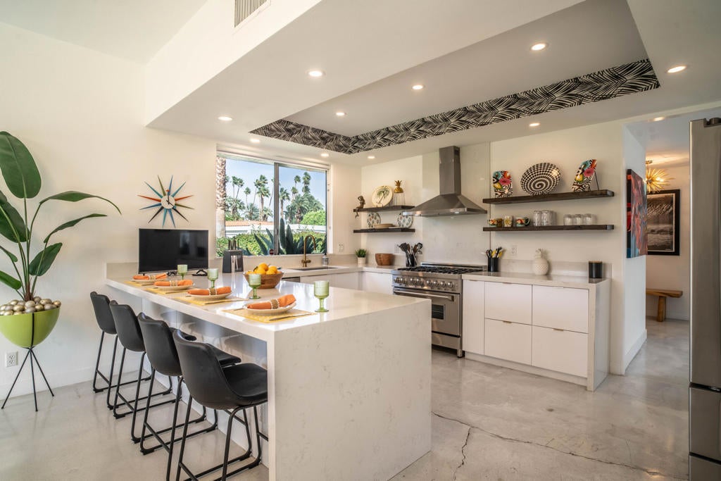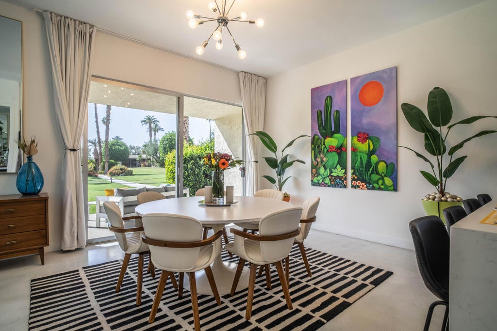 Stunning remodeled William Krisel-designed Mid-Centry Modern Indian Wells Villa located within the highly-sought Sandpiper Community at Indian Wells Country Club. This condo has been tastefully updated to restore the mid-century vibe and honor the history that inspired the allure of desert living. A true masterpiece combining the past with modern luxuries and amenities. The over-sized living room has been enhanced with a floor-to-ceiling stone fireplace and custom lighting updates. The sleek kitchen is complete with stainless steel appliances, quartz countertops, a breakfast bar, custom cabinetry and has been opened to the dining room. Stained & polished concrete flooring blend the spaces throughout the home seamlessly. All bedrooms have ensuite baths, large walk-in closets and open to either the atrium or rear covered patio. The center atrium provides beautiful natural light to the entire floor plan and offers private outdoor gathering space. 2-car garage PLUS golf-cart space with ample storage space. Newer HVAC, on-demand hot water heater and new doors throughout the interior (raised to 8'}. The Laundry room was updated and redone. Located in close proximity to the clubhouse on a lush greenbelt overlooking the community pool surrounded by swaying palm trees.