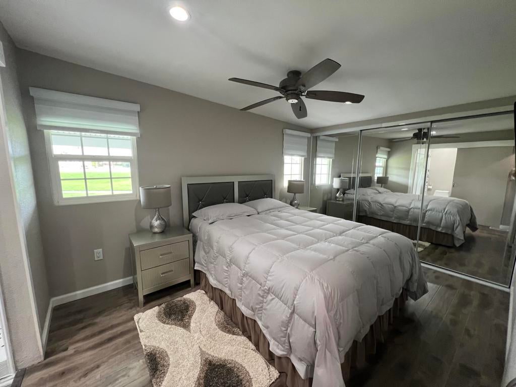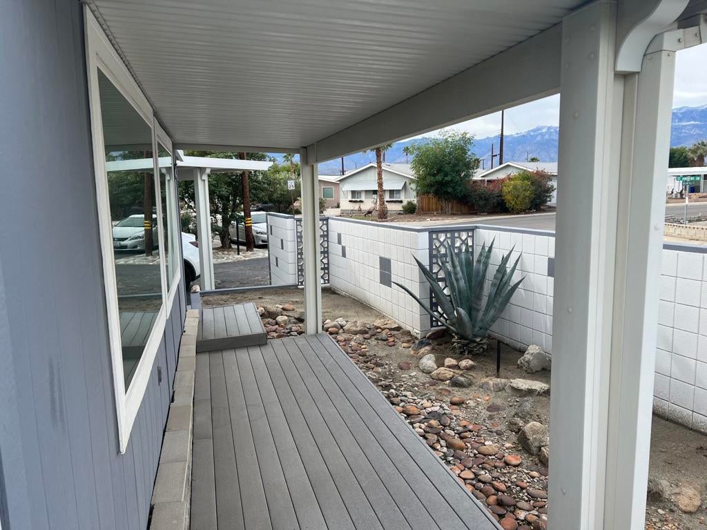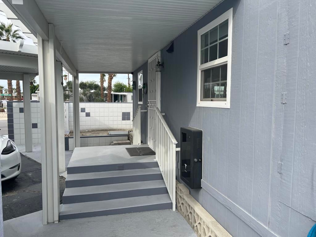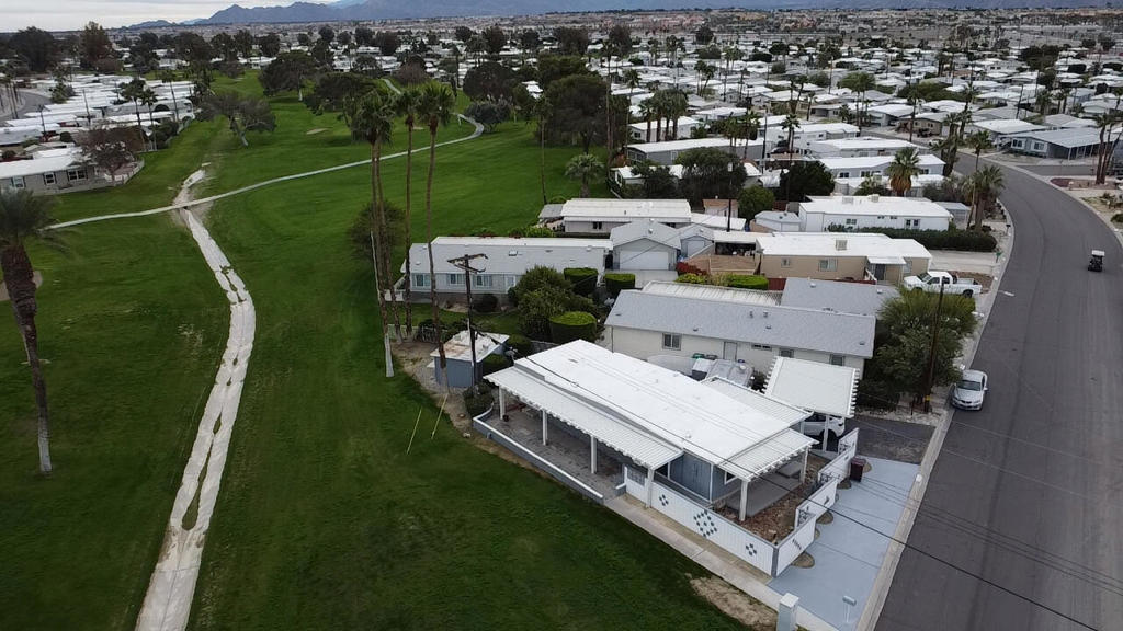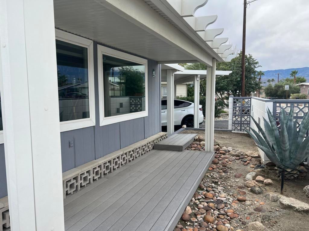 COMPLETE WHOLE-HOUSE MODERN REMODELED GORGEOUS HOME IN IMMACULATE CONDITION WITH AMAZING VIEWS OF THE MOUNTAINS AND GOLF COURSE!!! TURN-KEY READY! This home is located on the golf course and a corner lot so you can enjoy your morning coffee on the patio and still maintain your privacy! This beautiful home has 2 bedrooms, 2 bathrooms, plus a den/office. You enter the home to an open concept living room and kitchen area with lots of light! The modern kitchen includes all appliances, quartz countertops, undercabinet lighting, new blinds, pantry. Living room has modern zebra blinds providing both light and privacy. The master bedroom includes an ensuite bathroom and beveled-edge three-mirrored-door closet, built-in shelves, new blinds. Separate bathroom for your guests. Double-pane windows, new flooring, and drywall throughout the home. Bedroom 2 has new modern blinds, built-in closet shelves with mirrored doors. Perfect for guests! Laundry room with washer and dryer included in the sale. The complete exterior recently painted. This house has 3 alumawood patio covers and a 2-car Alumawood carport, an EV hook-up already installed, with a lockbox, workshop/golf cart storage, golf cart included. This home is move-in ready. Tri Palm Estates is a 55+ community where YOU OWN THE LAND, low HOA $223 monthly, with a great location, pools, tennis courts, restaurants, and the most exciting part - unlimited FREE golf for two owners on the deed for the 18-hole Executive course and the 9-hole Par 3 course. Close to freeway access, Costco, Sam's Club, Home Depot, Walmart, Lowes, theaters, and many fine restaurants.