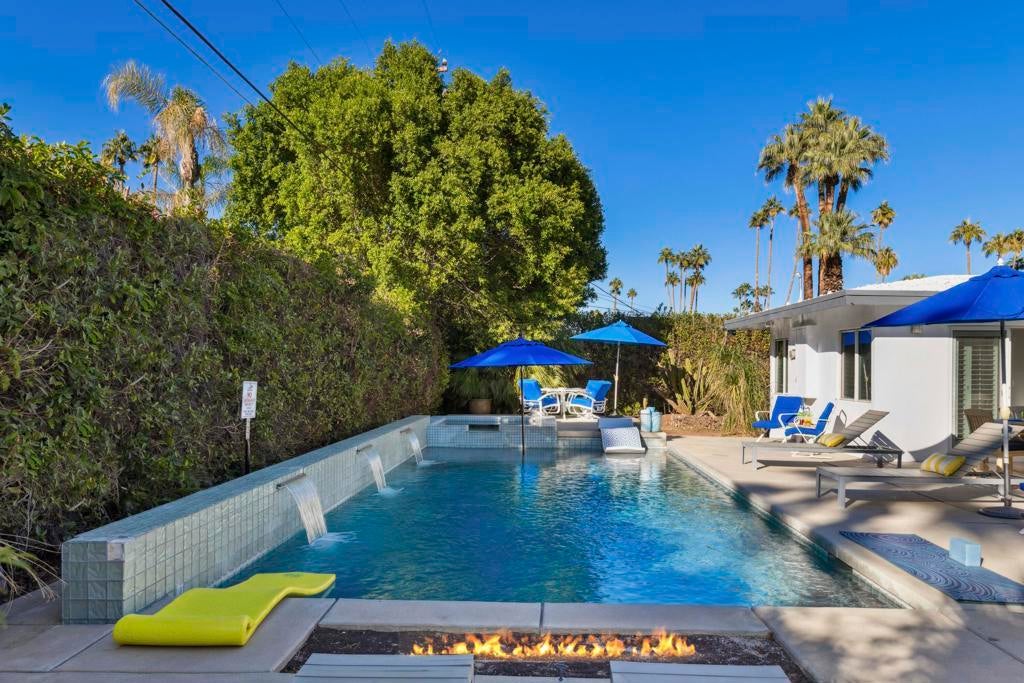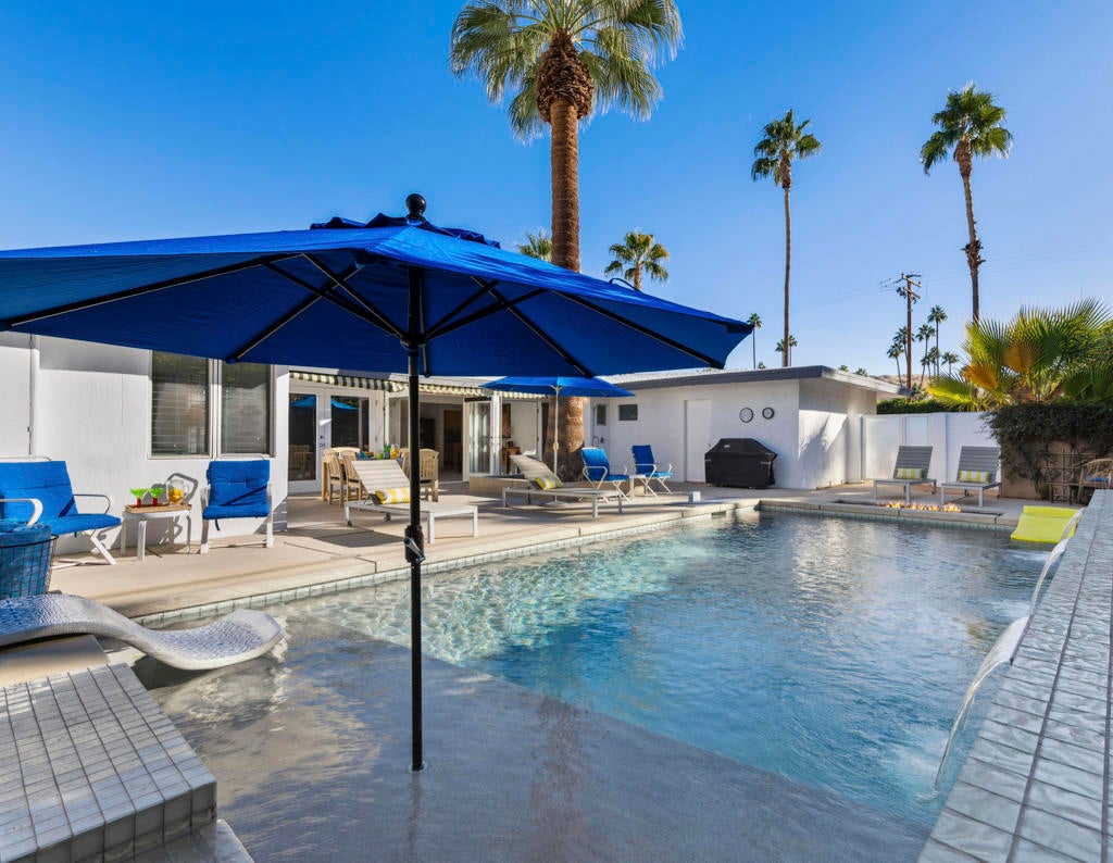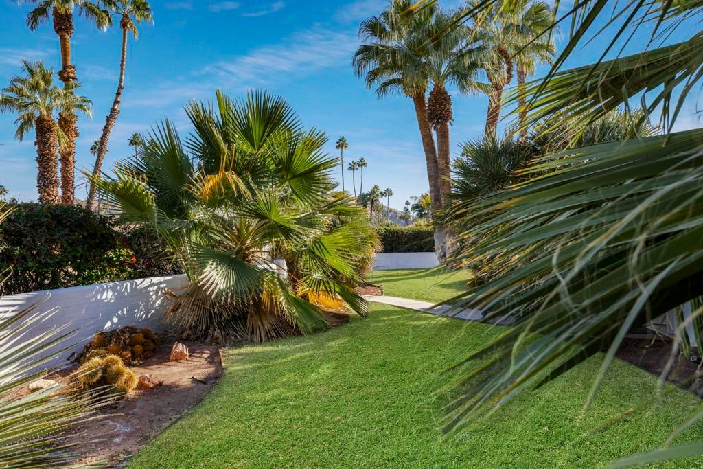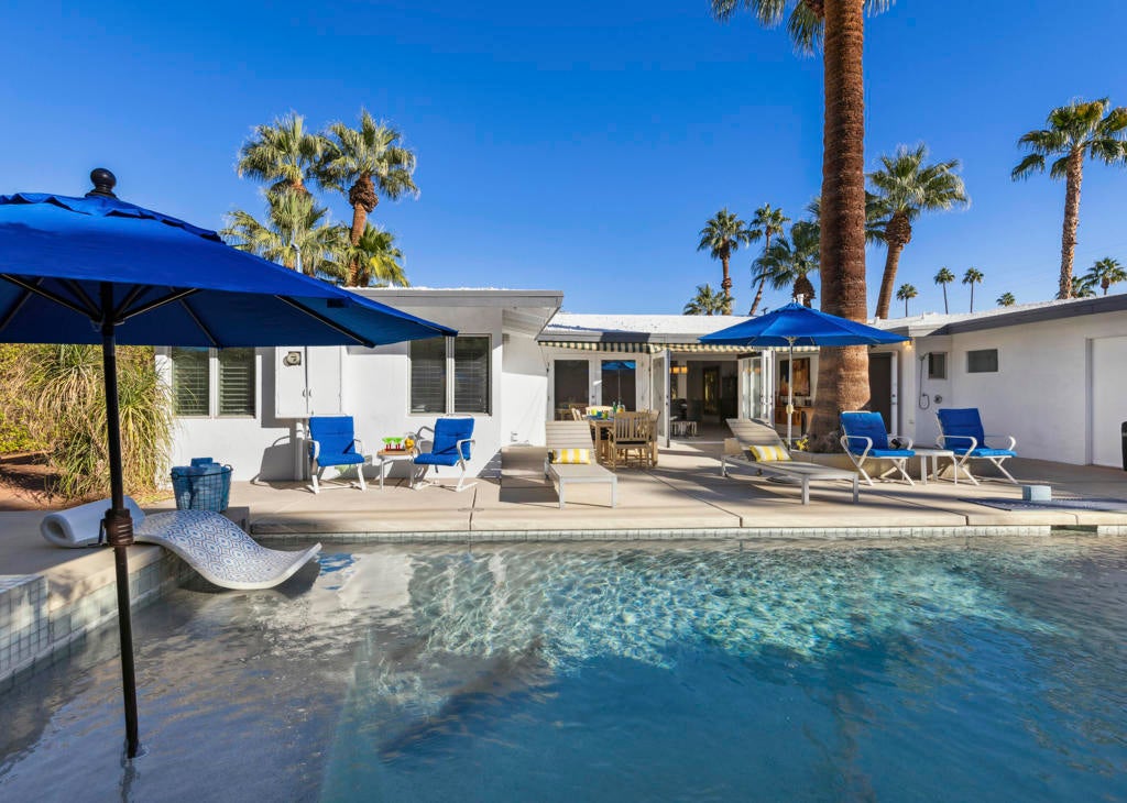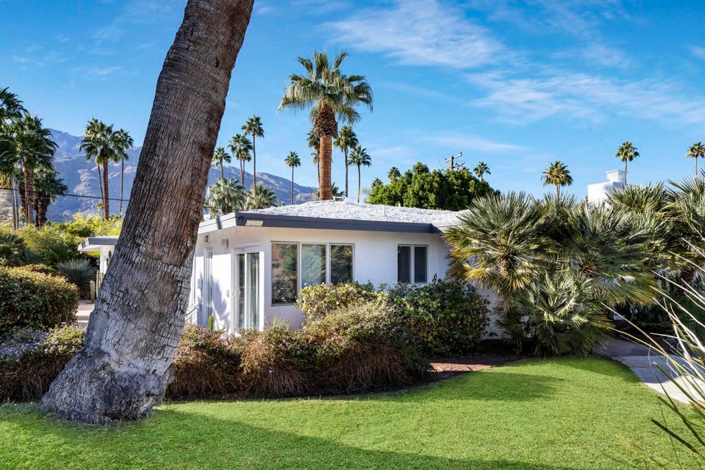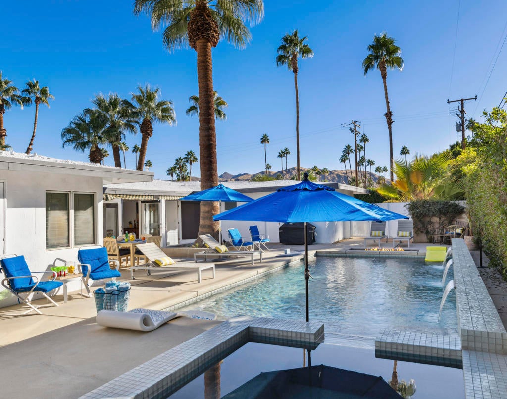Fabulous Updated Mid-Century home on an oversized corner lot in Deepwell Estates! Expansive great room with white brick fireplace, large format tiles and a wall of glass French doors overlooking the backyard. The lushly landscaped backyard contains a gorgeous Saltwater pool with tanning ledge and waterfalls, spa, and firepit all with mountain views...plus its own bathroom! Kitchen with breakfast area, granite countertops, wood paneled cabinetry and stainless-steel appliances. There are 2 primary bedrooms that are both ensuite and open to the wrap around yard. A 3rd guest bedroom can also easily be an office. Large laundry room. Pool area with its own bathroom. Lush foliage and a white brick pony wall surround the front yard. Near Smoketree, Koffi South, and Ace Hotel!