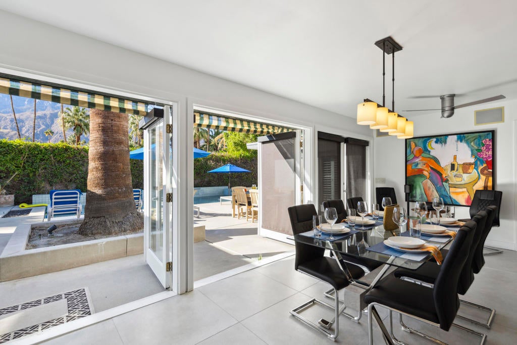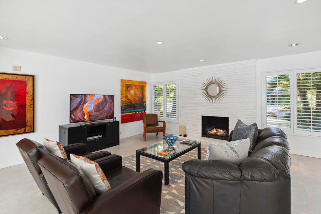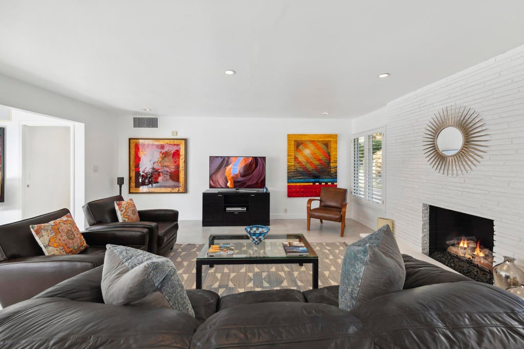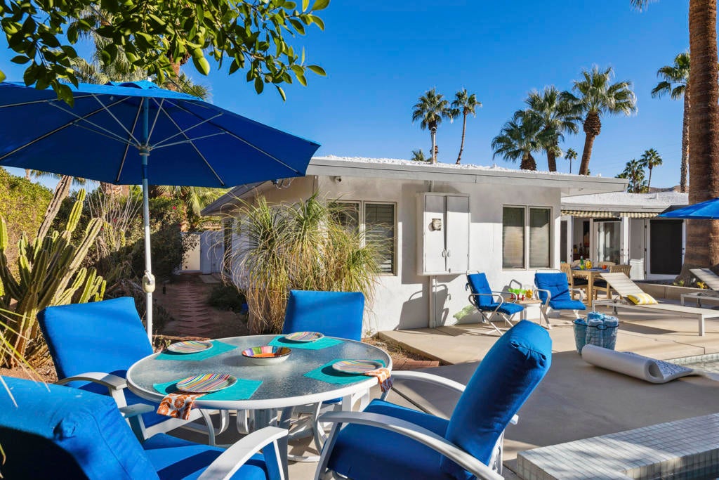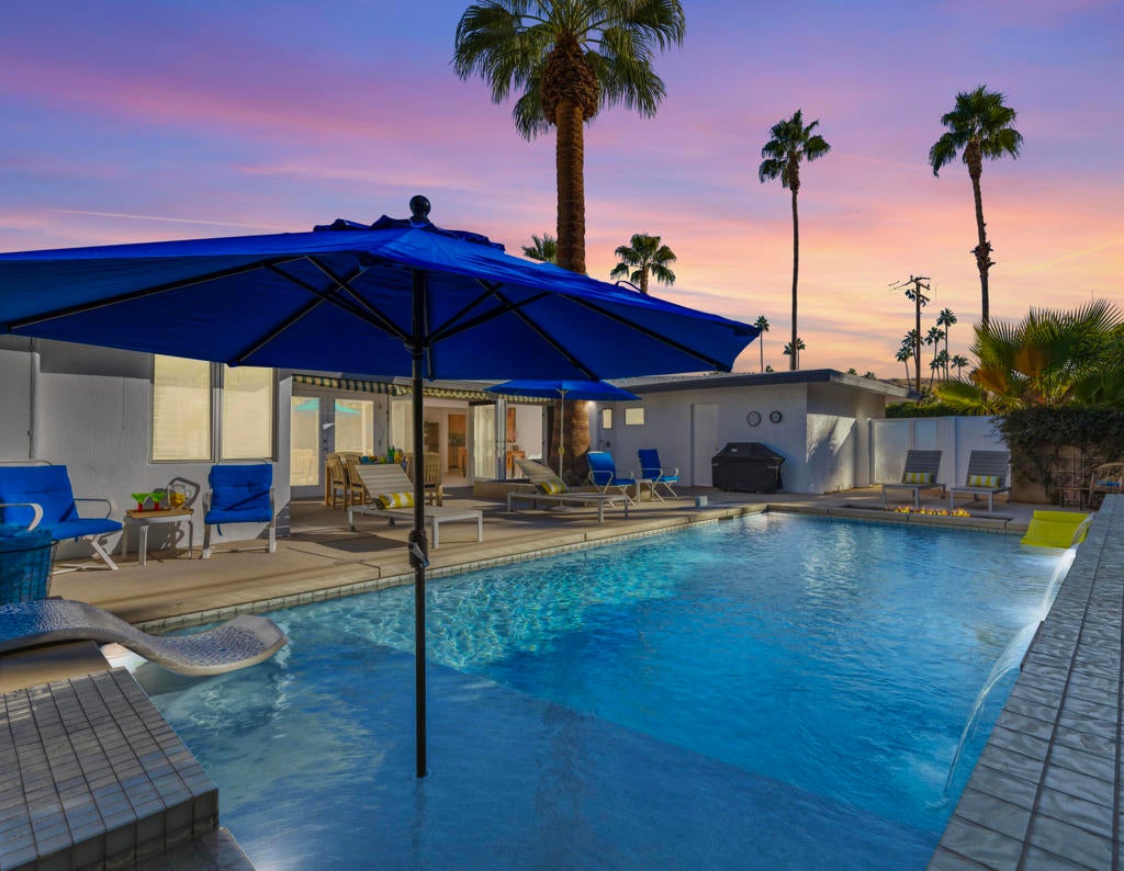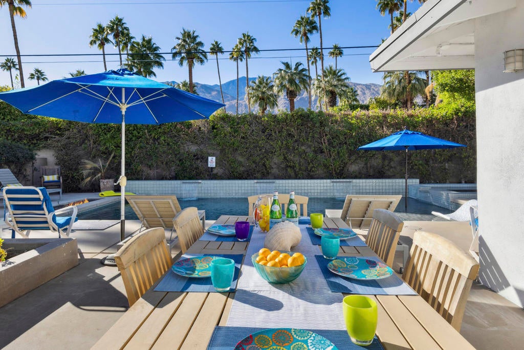 Fabulous Updated Mid-Century home on an oversized corner lot in Deepwell Estates! Expansive great room with white brick fireplace, large format tiles and a wall of glass French doors overlooking the backyard. The lushly landscaped backyard contains a gorgeous Saltwater pool with tanning ledge and waterfalls, spa, and firepit all with mountain views...plus its own bathroom! Kitchen with breakfast area, granite countertops, wood paneled cabinetry and stainless-steel appliances. There are 2 primary bedrooms that are both ensuite and open to the wrap around yard. A 3rd guest bedroom can also easily be an office. Large laundry room. Pool area with its own bathroom. Lush foliage and a white brick pony wall surround the front yard. Near Smoketree, Koffi South, and Ace Hotel!