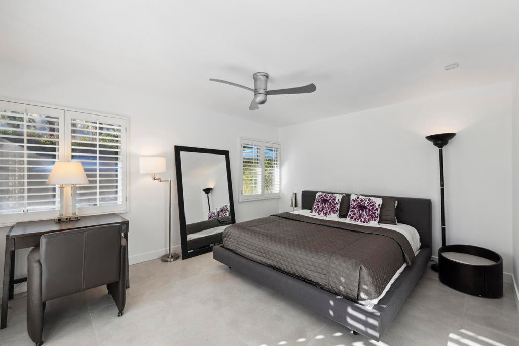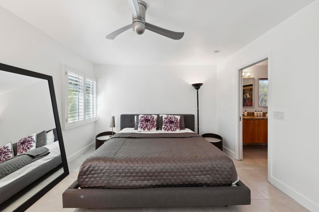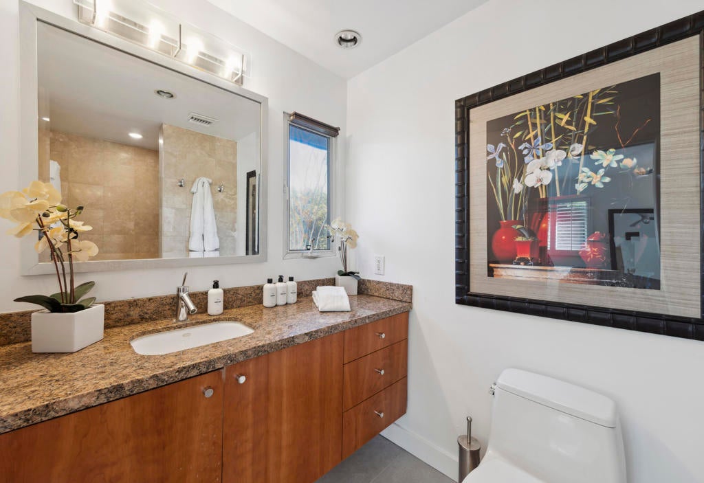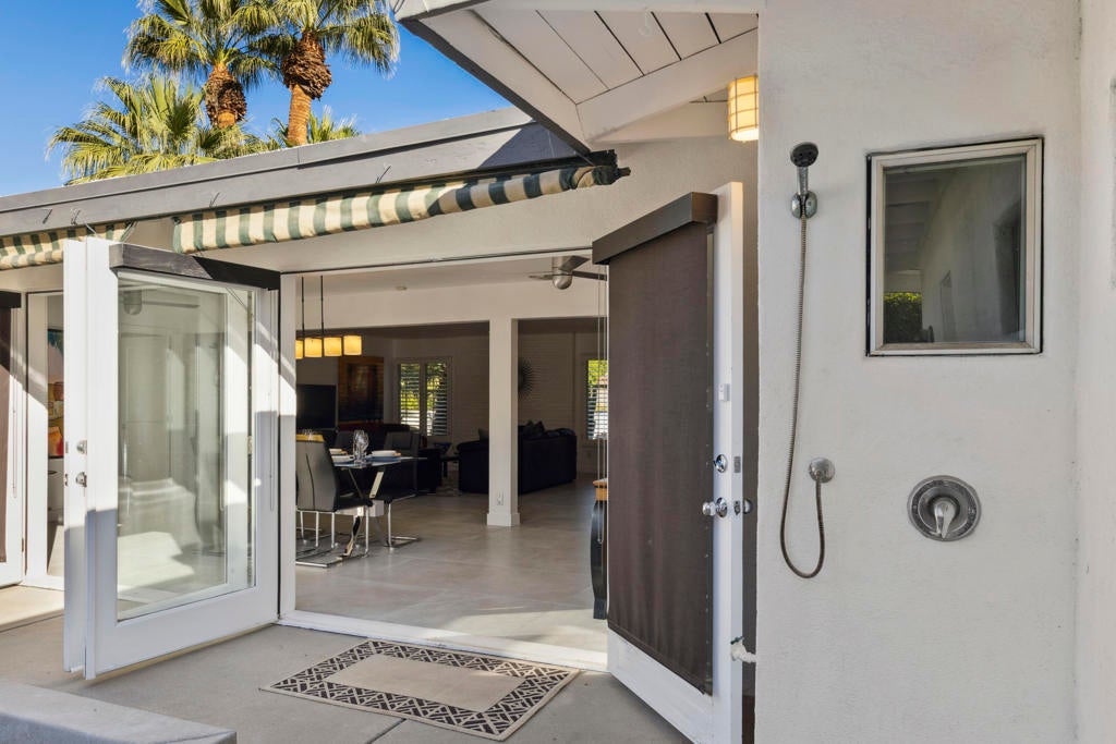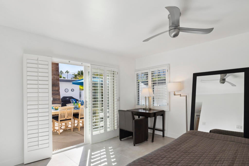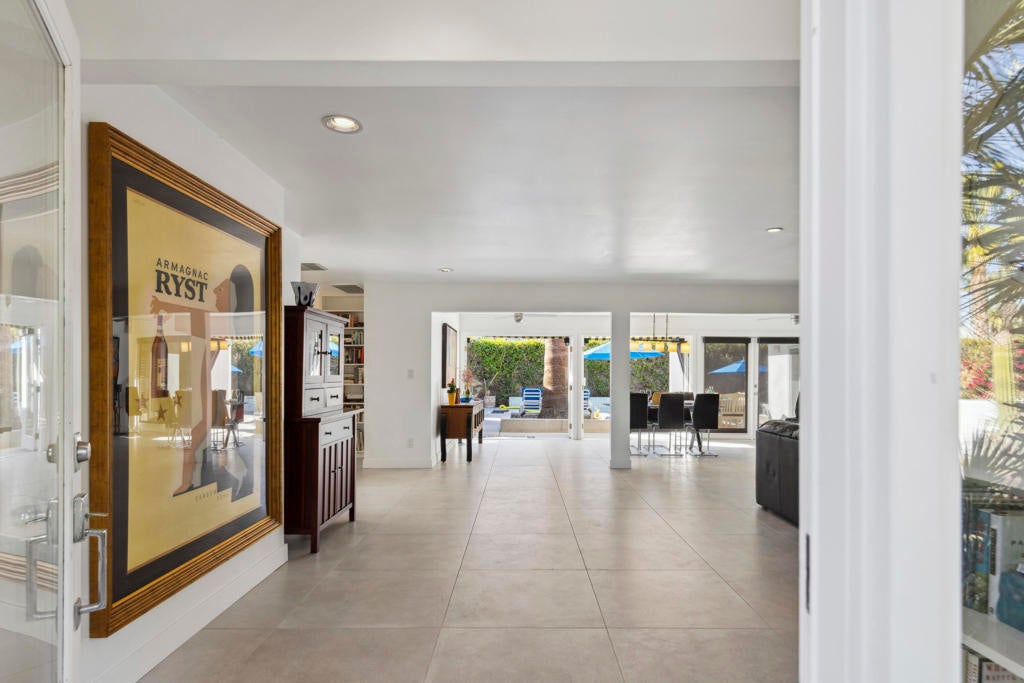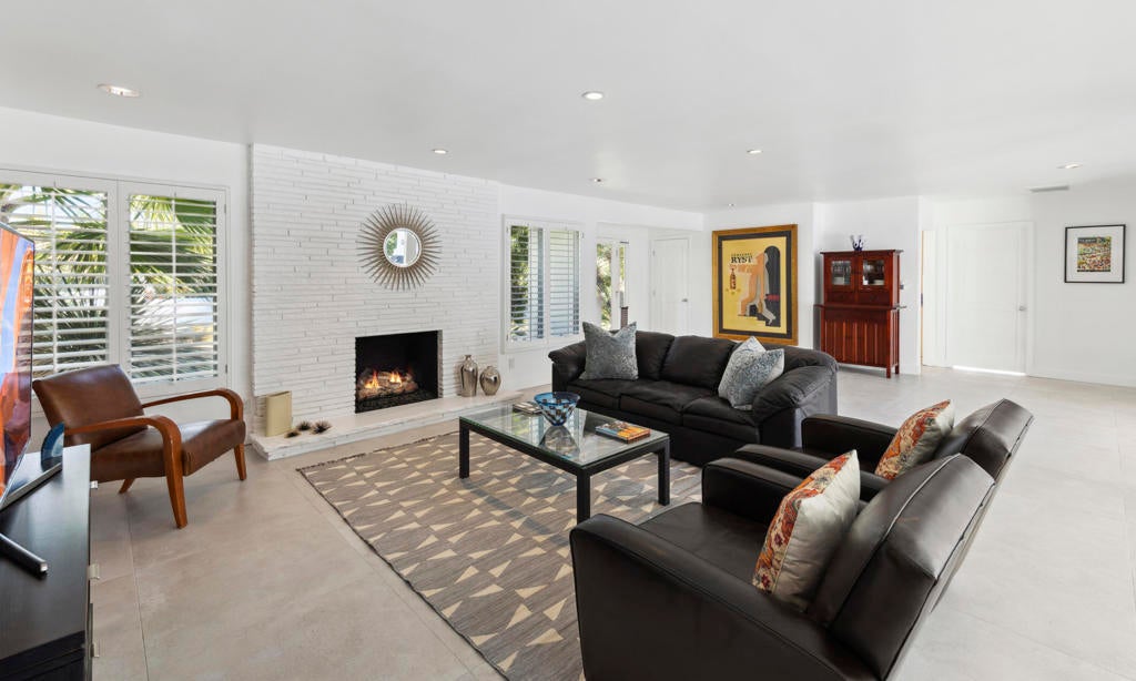 Fabulous Updated Mid-Century home on an oversized corner lot in Deepwell Estates! Expansive great room with white brick fireplace, large format tiles and a wall of glass French doors overlooking the backyard. The lushly landscaped backyard contains a gorgeous Saltwater pool with tanning ledge and waterfalls, spa, and firepit all with mountain views...plus its own bathroom! Kitchen with breakfast area, granite countertops, wood paneled cabinetry and stainless-steel appliances. There are 2 primary bedrooms that are both ensuite and open to the wrap around yard. A 3rd guest bedroom can also easily be an office. Large laundry room. Pool area with its own bathroom. Lush foliage and a white brick pony wall surround the front yard. Near Smoketree, Koffi South, and Ace Hotel!