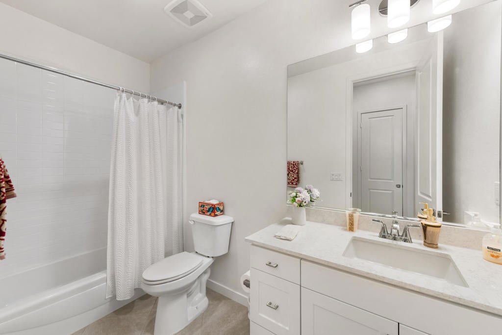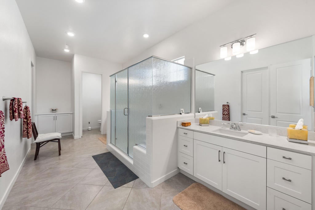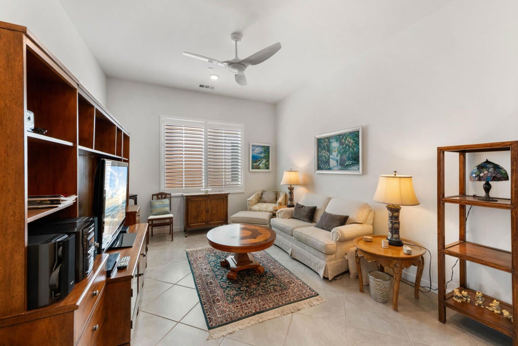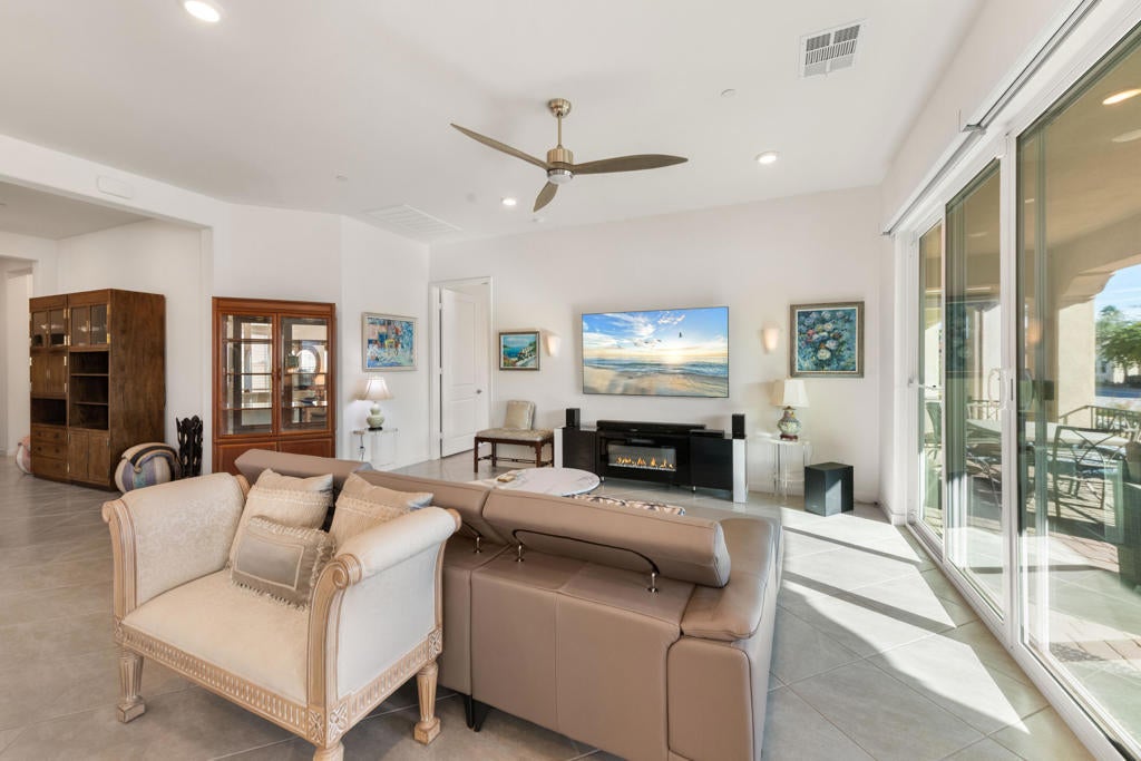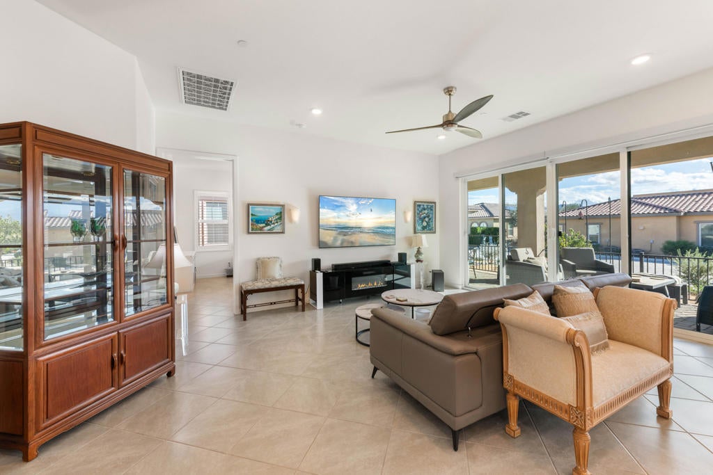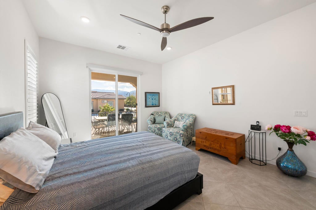 Enjoy a Resort Lifestyle within this Active Adult Community. Newer home built in 2023 by Crestwood Communities, features a Modern, Open Concept design with beautiful Mountain views on a south facing covered patio. With 2,249 sq ft, it is filled with natural light showcasing floor tile throughout for comfort of everyday living. A gourmet kitchen with top-of-line appliances, sleek, white shaker cabinets with soft-close drawers, Quartz countertops and convenient center island with counter seating for the ultimate when entertaining. The Primary bedroom has a custom window covering with remote control, walk-in closet, dual sinks with vanities, a large shower with bench seat and designer glass enclosure. The 2nd bedroom is adjacent to a Den/Flex Room, the perfect retreat to cozy up with a book, TV viewing and relaxation. The attached Casita has luxury vinyl flooring, walk-in closet and 3/4 bathroom. Energy efficient with Solar, that is owned, tankless water heater and an air conditioned 2-car garage. A friendly environment awaits you in Villa Portofino as the Clubhouse amenities offer an array of fun-filled activities, dining, fitness, pool, spa and sport courts. Within minutes you'll enjoy the convenience of grocery options, Dining, Art and Boutiques on fashionable El Paseo, Eisenhower Health, The McCallum Theater, The River in Rancho Mirage and Acrisure Arena for sport and concert enthusiasts. The Lifestyle can be as quiet or adventurous as you want in beautiful Villa Portofino.