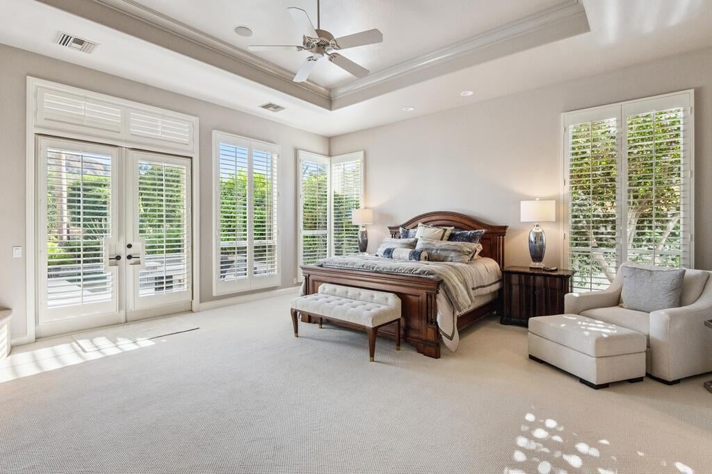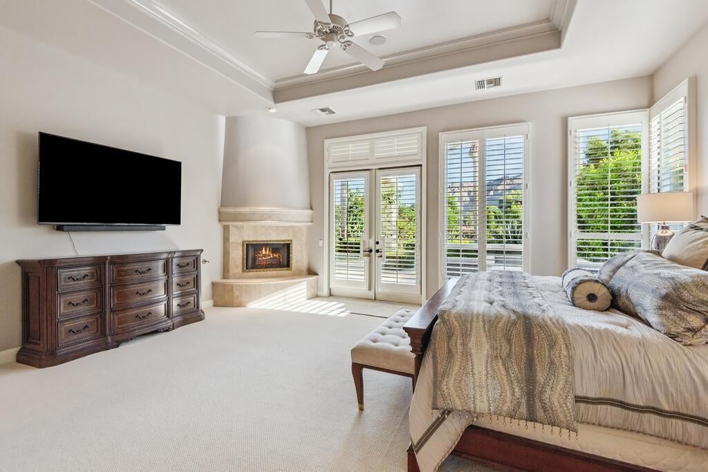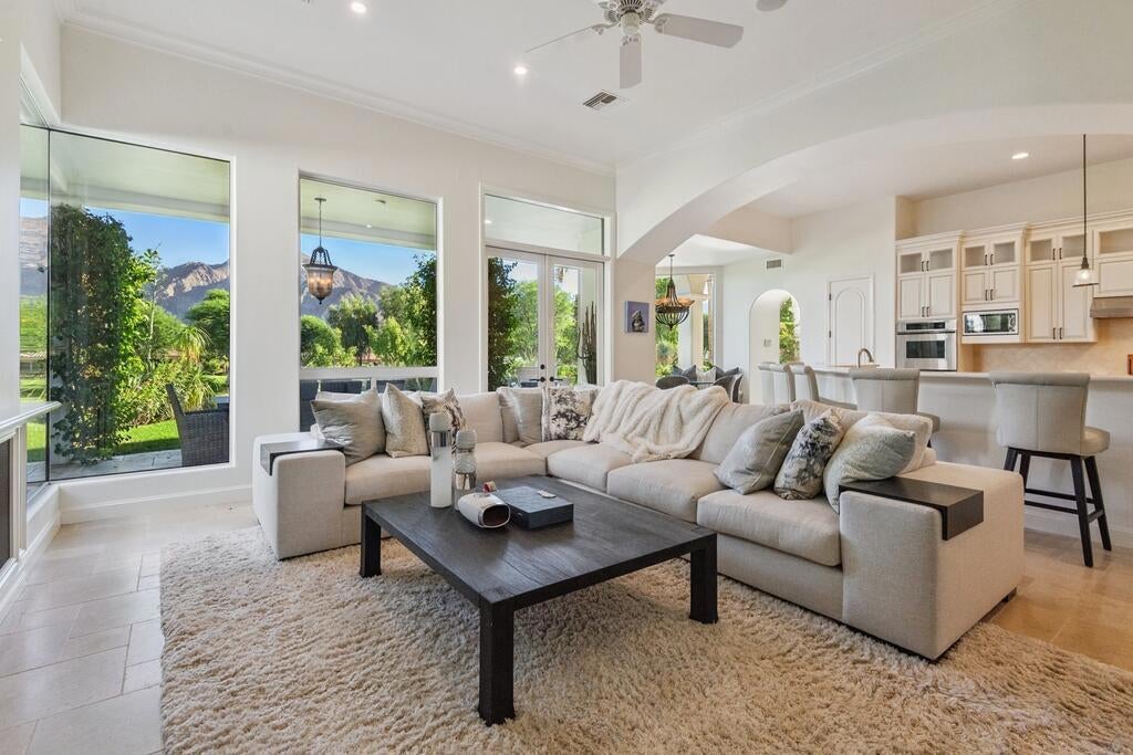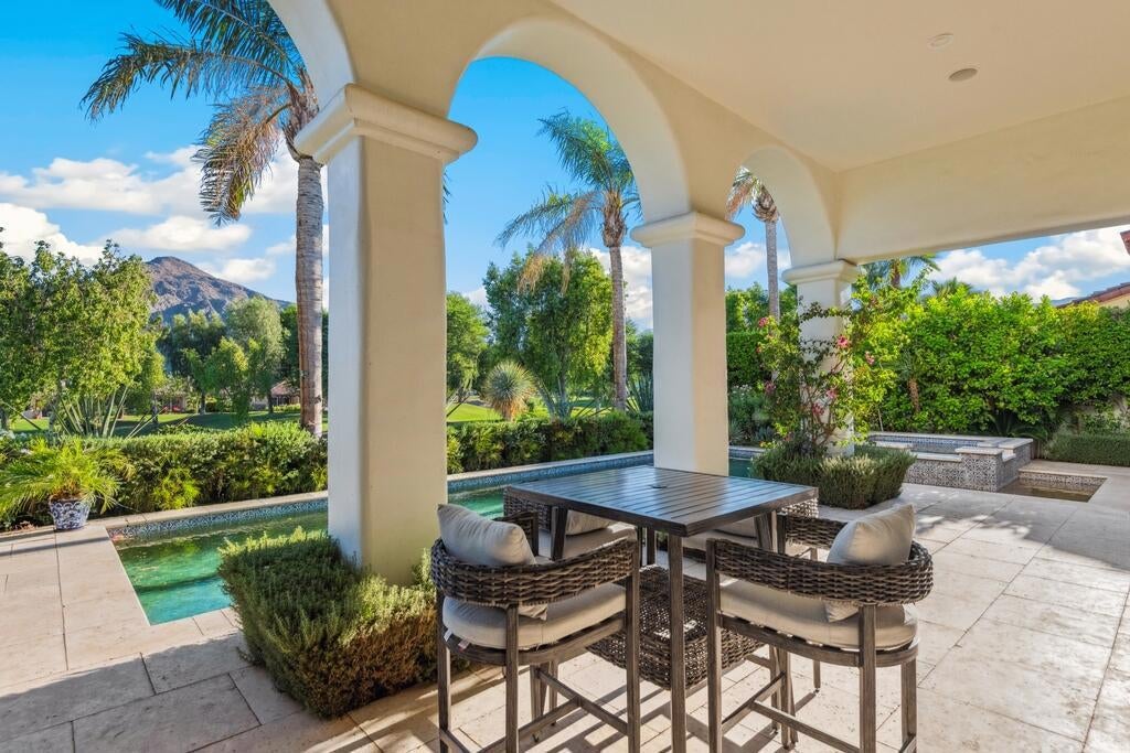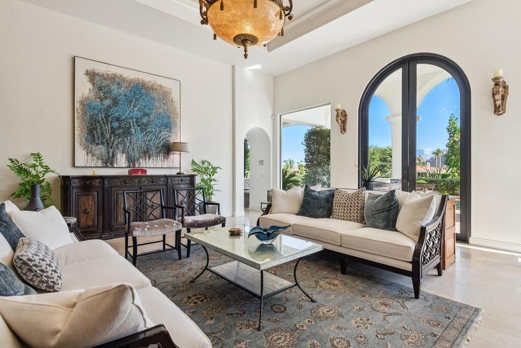 No expense spared in this stunning 4 bed, 5 bath single level home that comes to you Fully Furnished and features a private resort-like swimming pool and spa, panoramic golf course and mountain views, and gorgeous curb appeal. The interior is open and spacious with soaring ceilings, LED lights, beautiful archways, and the entire home is basked in natural light. The formal living room offers a fireplace and glass doors to the backyard. The gourmet chef's kitchen features a wrap around bar, a center island, and opens to the large family room with floor to ceiling windows. There is also a breakfast nook and a formal dining room. All of the bedrooms are generously sized and the massive primary suite offers a retreat area, a private fireplace, a spa-like ensuite and private glass door access to the backyard. This home is truly an entertainer's dream with gorgeous swimming pool and spa, covered patios, lush landscaping and magnificent views! Also the attached 3-Car Garage comes finished and air conditioned! Schedule your private tour today!