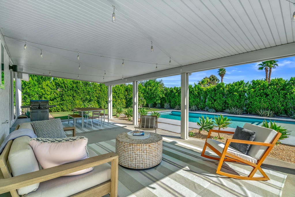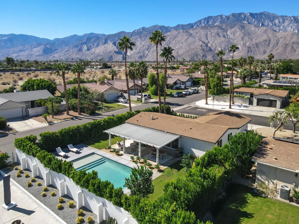 Charming Palm Springs retreat with views you dream about--or only find on a postcard.This stylish 3-bedroom, 2-bath contemporary bungalow sits on a highly desirable corner lot along a quiet cul-de-sac in a peaceful suburban setting, offering privacy, character, and unobstructed panoramic views of the majestic San Jacinto Mountains. From sunrise to sunset, the home captures the timeless beauty and serenity that define the Palm Springs lifestyle. Inside, the light-filled open floor plan perfectly balances warmth and sophistication. Thoughtfully designed with a highly livable and efficient layout, the home maximizes every square foot, making it ideal for buyers seeking comfort without excess. The more compact footprint translates to lower utility costs, reduced maintenance, and easy day-to-day living--perfect for full-time residents, second-home owners, or those looking for an energy-efficient, lock-and-leave desert retreat that lives larger than its size. The updated kitchen features stainless steel appliances, Venetian plaster walls, sleek cabinetry with modern hardware, handmade Moroccan tile backsplash, and reclaimed wood shelving--a tasteful blend of craftsmanship and contemporary design. Both bathrooms are newly remodeled with custom vanities, tile walk-in showers, and decorative lighting. Additional upgrades include luxury vinyl flooring, dual-pane windows and sliders, new copper plumbing, a tankless water heater, and an Ecobee smart thermostat, enhancing comfort and efficiency throughout. Step outside to your private backyard sanctuary featuring a brand-new pool with tanning shelf, new concrete decking, lush desert landscaping with a new irrigation system, and an oversized covered pergola--ideal for entertaining or relaxing beneath the stars. Enjoy unforgettable sunsets and dramatic mountain silhouettes that frame your own personal desert paradise. An incredible value for a pool home in Palm Springs, this property is fee simple--you own the land--with no HOA dues. Conveniently close to the CV Link, Steel Gym, Palm Springs International Airport, and less than 10 minutes to Downtown Palm Springs, shopping, dining, museums, and the vibrant Arenas District nightlife. Best of all, the home is outside the flight path, ensuring peaceful enjoyment day and night. A rare opportunity offering charm, updates, views, and location--perfectly suited for full-time living, a weekend escape, or a low-maintenance vacation retreat.