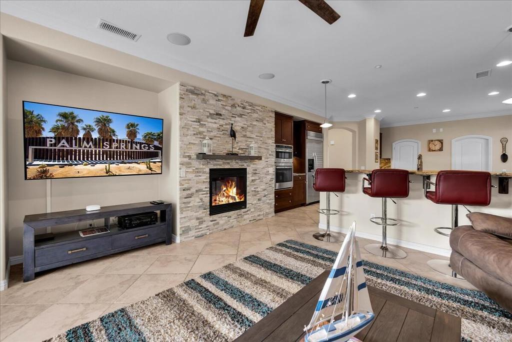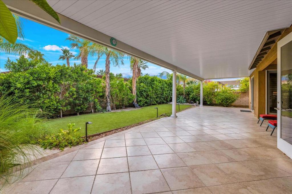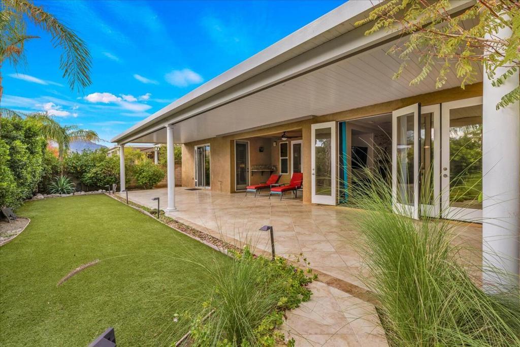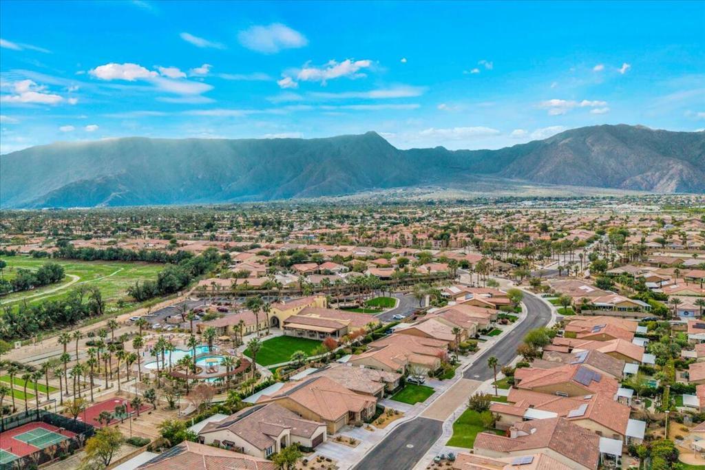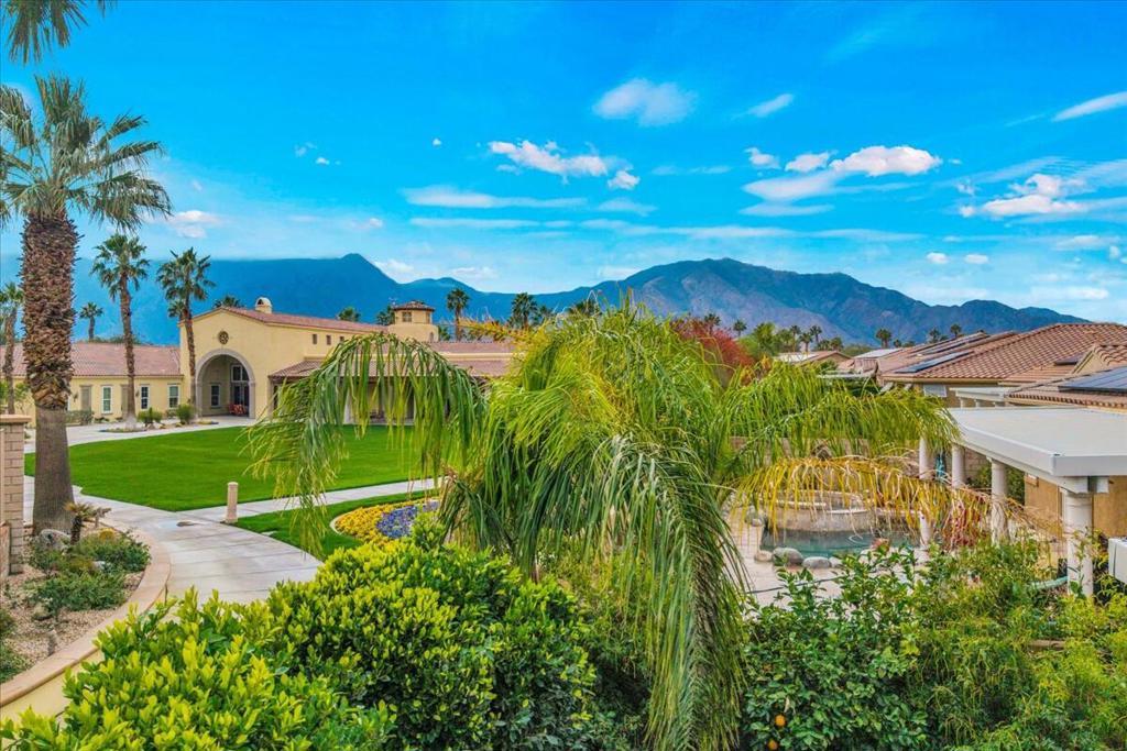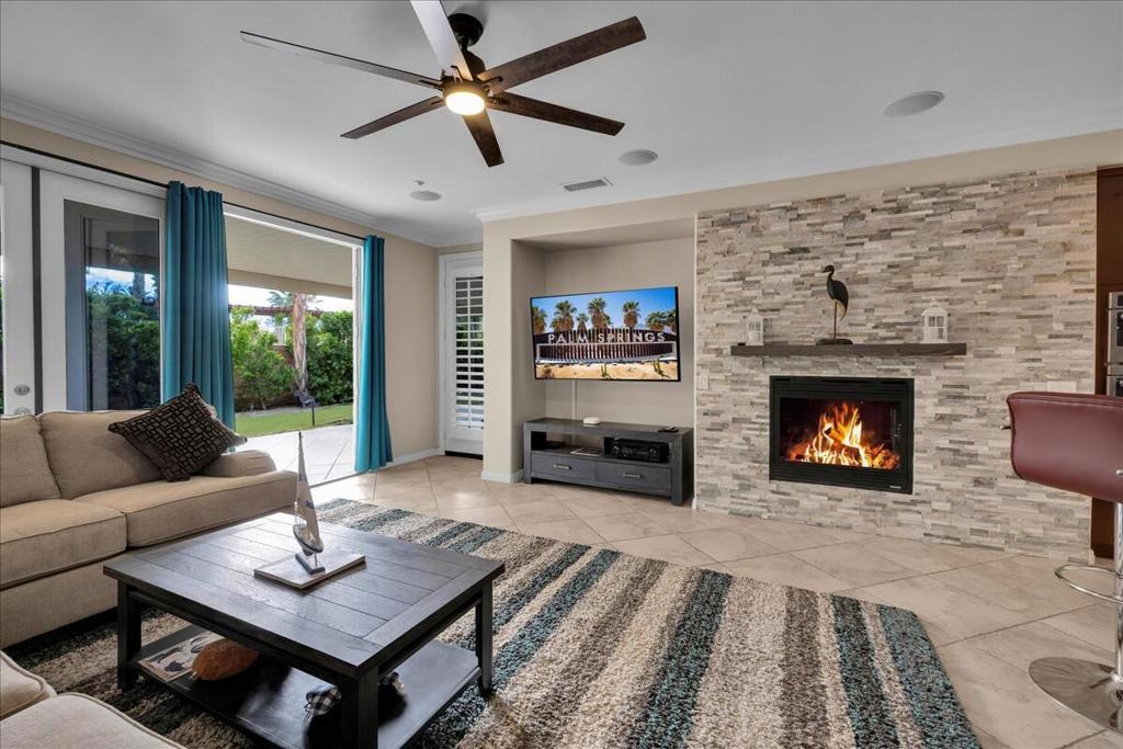 Palm Springs living with Owned Solar! This impressive 2,825 sq ft residence welcomes you through beveled-glass double doors into a formal living and dining room with soaring vaulted ceilings. Oversized diagonal tile flooring flows throughout the home and out to the inviting patios. Located in the gated Four Seasons 55+ community, residents enjoy endless social activities centered around the stunning 14,000 sq ft clubhouse.The gourmet kitchen features abundant storage, a center island, breakfast nook, and bar seating, complemented by granite countertops, stainless steel appliances, and custom cabinetry. The adjoining family room with a stacked-stone gas fireplace creates a warm gathering space with countertop seating. The primary suite is a private retreat offering a gas fireplace, south-facing patios, two large walk-in closets, dual vanities, a granite walk-in shower, and a soaking tub. A second en-suite bedroom is situated on the opposite side of the home near the den or optional third bedroom, connected by a Jack-and-Jill bath, plus a separate guest powder room. Dual newer A/C units provide year-round comfort. The serene backyard showcases a large pergola-covered patio, mountain views, built-in BBQ, and low-maintenance artificial turf. 'The Lodge' clubhouse offers a full calendar of activities, fitness studios, ballroom, library, game room, and more. Resort-style amenities include pools, spas, tennis, pickleball, BBQ areas, and scenic walking paths. Low HOA fees include Frontier fiber optic internet. Just minutes from downtown Palm Springs, this home blends luxury, comfort, and community living.
