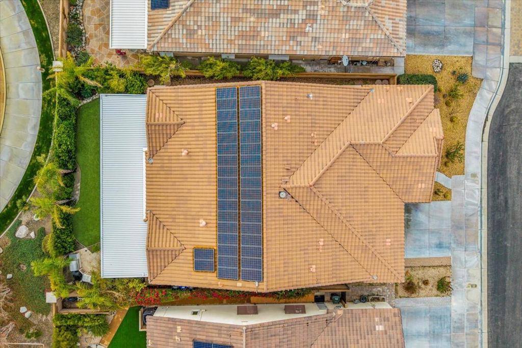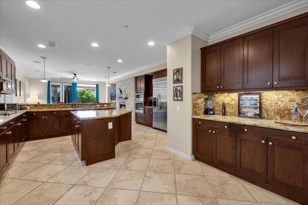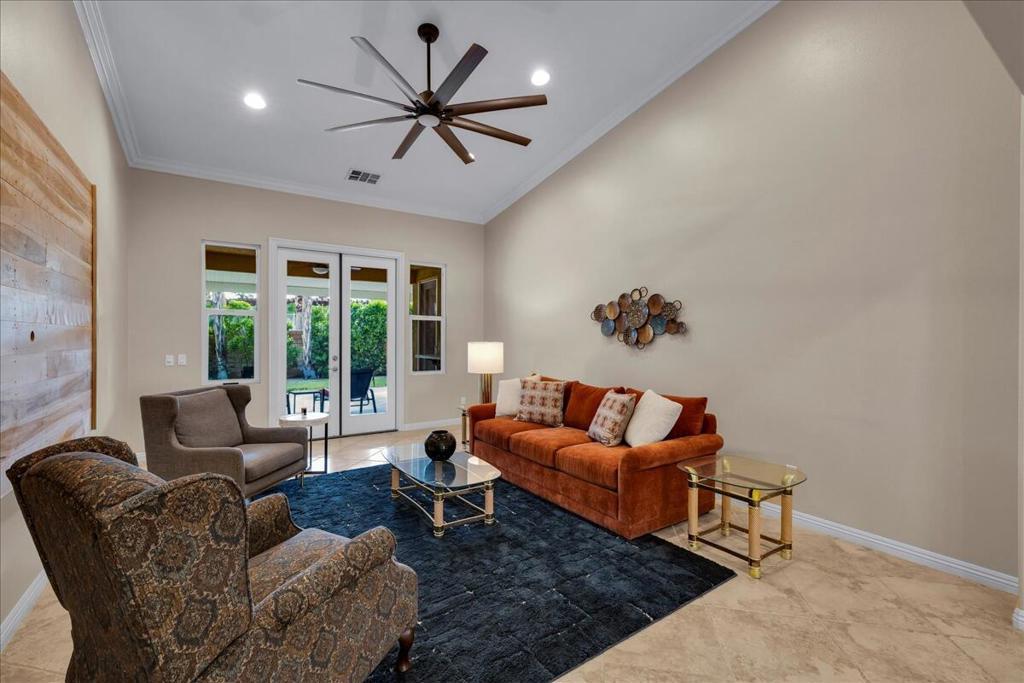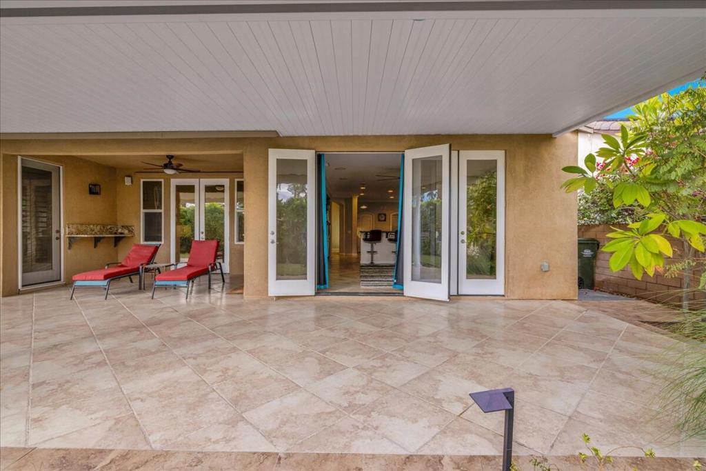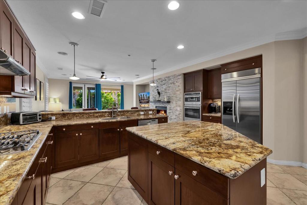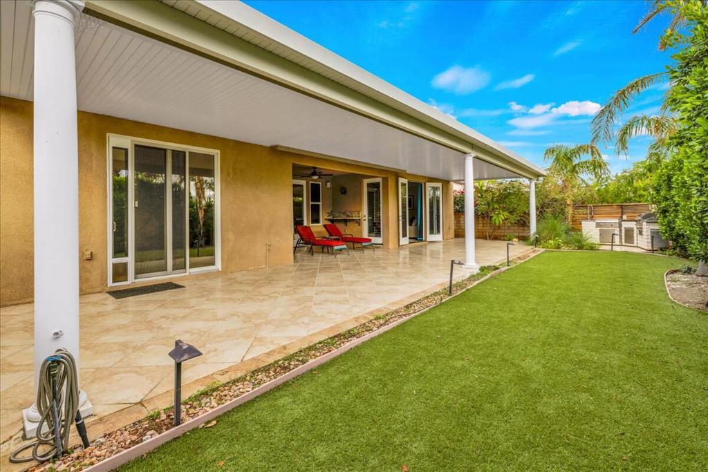 Palm Springs living with Owned Solar! This impressive 2,825 sq ft residence welcomes you through beveled-glass double doors into a formal living and dining room with soaring vaulted ceilings. Oversized diagonal tile flooring flows throughout the home and out to the inviting patios. Located in the gated Four Seasons 55+ community, residents enjoy endless social activities centered around the stunning 14,000 sq ft clubhouse.The gourmet kitchen features abundant storage, a center island, breakfast nook, and bar seating, complemented by granite countertops, stainless steel appliances, and custom cabinetry. The adjoining family room with a stacked-stone gas fireplace creates a warm gathering space with countertop seating. The primary suite is a private retreat offering a gas fireplace, south-facing patios, two large walk-in closets, dual vanities, a granite walk-in shower, and a soaking tub. A second en-suite bedroom is situated on the opposite side of the home near the den or optional third bedroom, connected by a Jack-and-Jill bath, plus a separate guest powder room. Dual newer A/C units provide year-round comfort. The serene backyard showcases a large pergola-covered patio, mountain views, built-in BBQ, and low-maintenance artificial turf. 'The Lodge' clubhouse offers a full calendar of activities, fitness studios, ballroom, library, game room, and more. Resort-style amenities include pools, spas, tennis, pickleball, BBQ areas, and scenic walking paths. Low HOA fees include Frontier fiber optic internet. Just minutes from downtown Palm Springs, this home blends luxury, comfort, and community living.