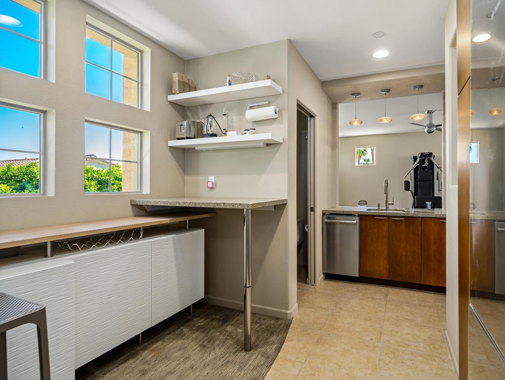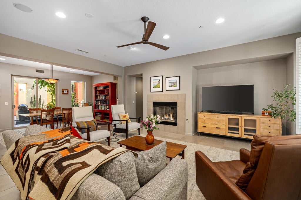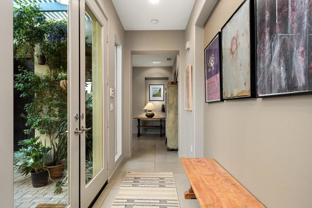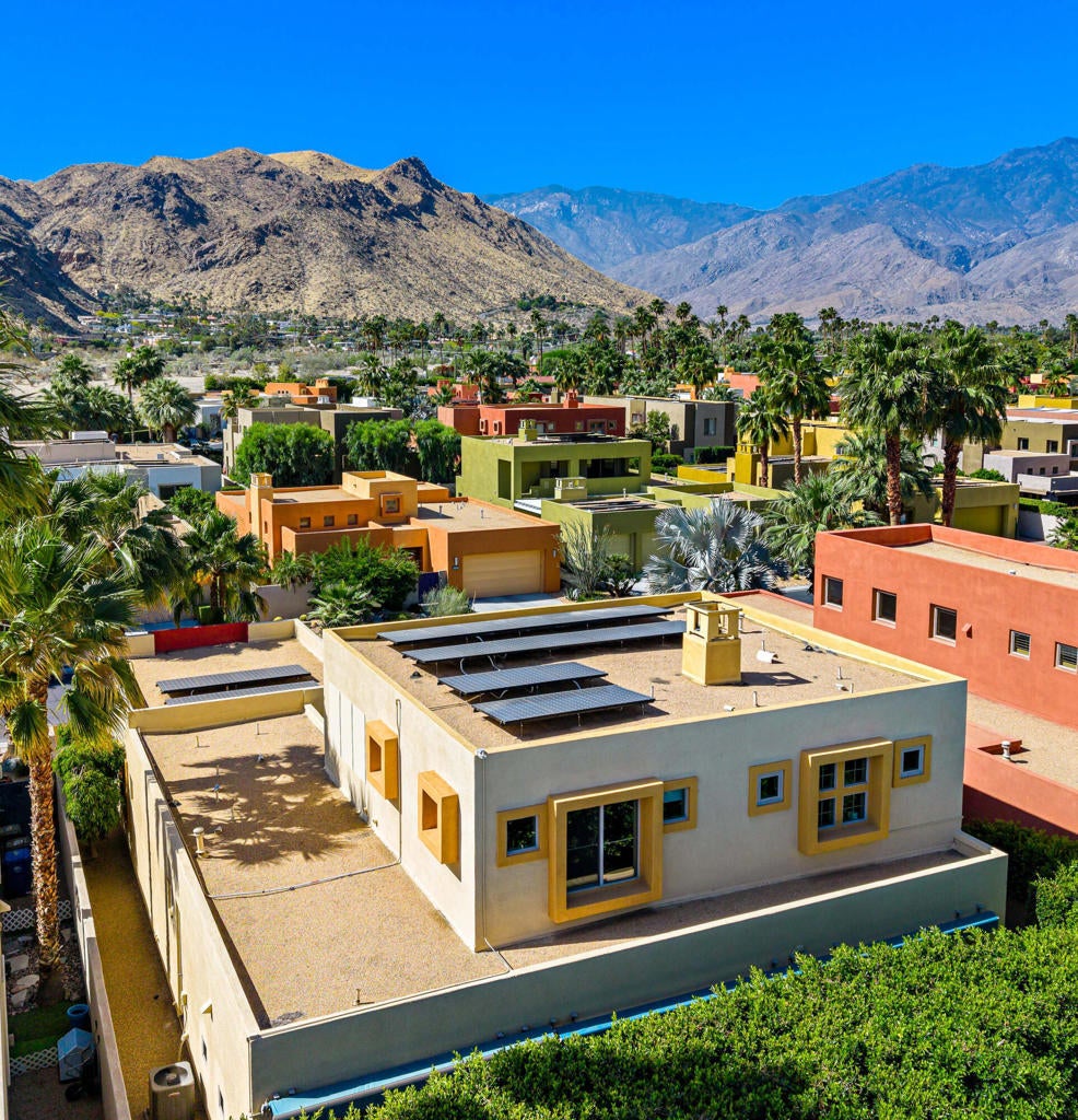 Welcome to one of the finest values in South Palm Springs -- a beautifully crafted contemporary home in Luminaire, an intimate pueblo-inspired enclave where desert modern architecture meets genuine privacy. From the moment you step through the walled courtyard -- where a fireplace flickers and a fountain softly plays -- the outside world simply fades away. This is a home designed to be a sanctuary. Inside, nearly 3,000 square feet of light-filled, architecturally distinct living space impresses with clean lines, sleek finishes, modern tile flooring, and high ceilings. The gourmet kitchen anchors the home with Cambria Quartz countertops, a generous island, gas cook-top, and premium stainless appliances -- equally suited for quiet weeknight cooking or effortless entertaining. The spacious dining area flows into the Great Room with a gas fireplace, all opening to the private backyard. Outside, mature trees frame a sparkling saltwater Pebble Tec pool and spa, while the waterfall feature creates a calming ambiance. Remote-controlled Sunbrella awnings provide cool shade, a built-in BBQ makes entertaining seamless, and the trellised courtyard with built-in lighting and misting system extends your living space beautifully into the desert evenings. Priced to reflect its location near Route 111 -- and the convenience that brings, with downtown Palm Springs, the airport, gourmet groceries, a pharmacy, and pet care all within easy reach -- this home has been thoughtfully designed to leave the outside world behind. Luminaire also enjoys a notably sheltered position, quieter from the desert wind than much of the valley. Mature trees, a cascading waterfall, and double-pane windows throughout ensure that what you hear inside and out is the sound of your own private oasis. The crown jewel is the upstairs guest casita -- a fully self-contained retreat with mini kitchen, bath, Sleep Number Murphy bed, and a private patio commanding the best mountain views in all of Luminaire. Whether for guests, extended family, or rental income, it adds exceptional versatility. Additional highlights include a fully warranted solar system, Apex water conditioning, and multi-zone Lennox air conditioning with electrostatic air filtration that keeps the entire home cool, quiet, and energy efficient year-round. This is the Palm Springs lifestyle at its most complete -- private, polished, and priced to move.