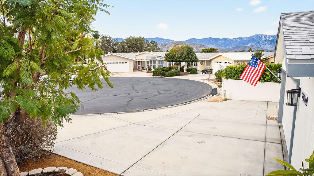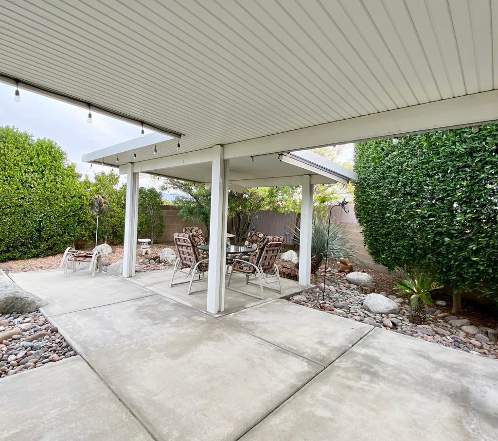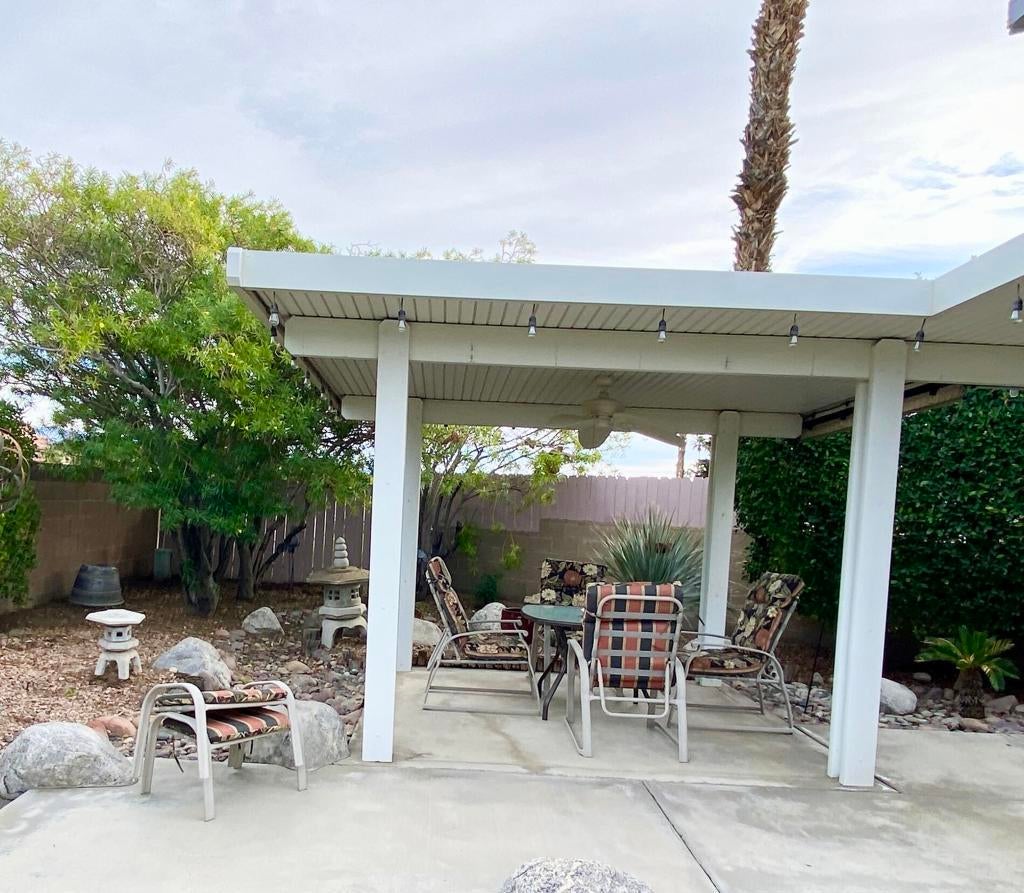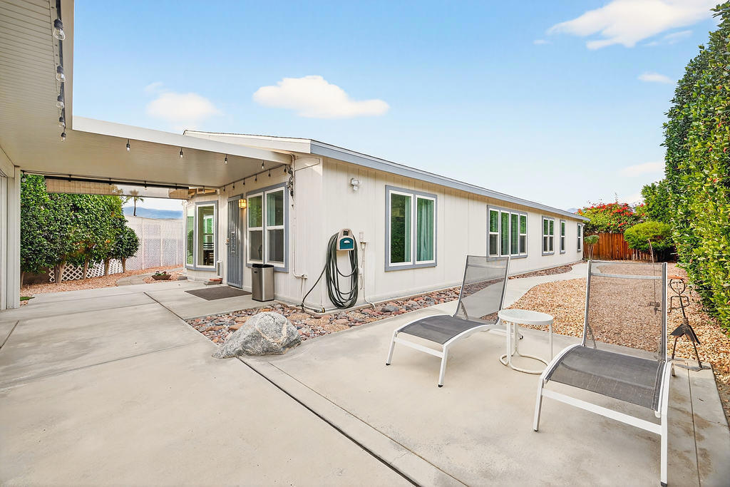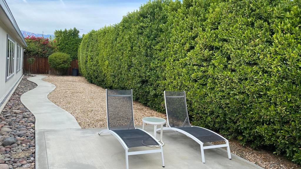 Don't miss seeing this rare 2536 sq ft home. Be sure & look up in every room to see the Architectural lines that separate the walls from the ceiling with special lighting, Main bedroom has an adjoining open office with built in desk, bookcases & cabinets. As you enter the home, there are two spacious rooms that could be used as sun/game room or could be closed off & made into another bedroom or office. Ceiling Fans throughout. You then walk into a wide open great room looking out at fully grown ficus trees that span the length of the home. Kitchen has plenty of counter space with many cabinets & also an island in the middle Covered back patios enjoy a pretty landscaped area. Front covered patio allows you to enjoy a view of the mountains. Two car finished garage features built in cabinets on all three walls, coated floor, work bench, sink & portable evaporator cooler. Driveway can accommodate up to 3 cars & area for golf cart. Very nice attached outdoor shed for misc items. Bonus: If you have a RV, there is a special electrical outlet & sewer access. Be sure & preview this spacious home. You will be very Impressed. Located at the end of the of a cul de sac. Three ton condenser & coil installed in Dec 2025. Roof replaced 2023 Vinyl plank flooring installed 2021 SunRun Solar leased & available for transfer..You Own the Land at Palm Desert Greens. Home is on permanent foundation for easy financing. Furniture available outside of escrow. HOA fee $400 includes 24 hr guard gated community, 18 hole golf course, restaurant, lounge, pools, hot tubs, bocci ball, indoor shuffleboard, pickleball and more.55+ community
