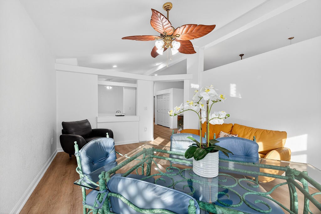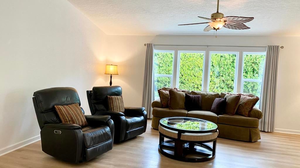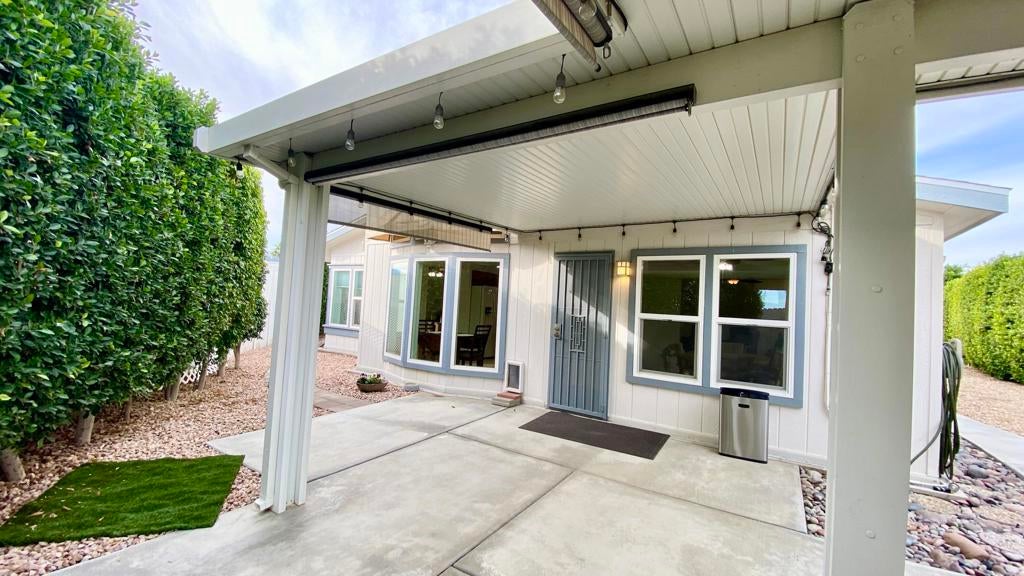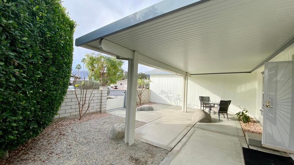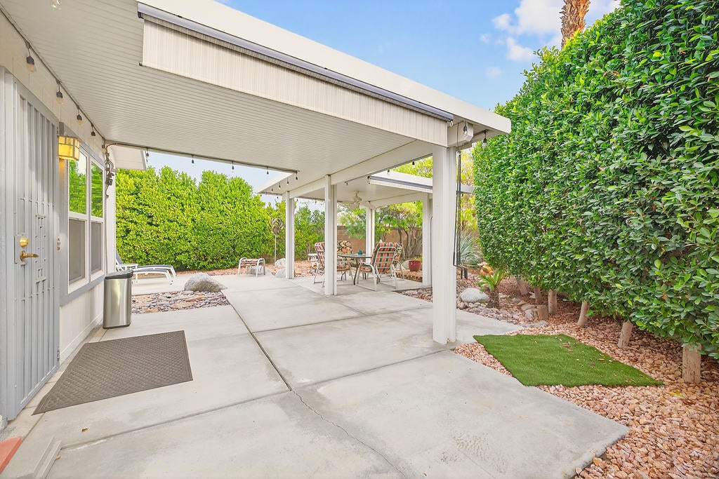 Don't miss seeing this rare 2536 sq ft home. Be sure & look up in every room to see the Architectural lines that separate the walls from the ceiling with special lighting, Main bedroom has an adjoining open office with built in desk, bookcases & cabinets. As you enter the home, there are two spacious rooms that could be used as sun/game room or could be closed off & made into another bedroom or office. Ceiling Fans throughout. You then walk into a wide open great room looking out at fully grown ficus trees that span the length of the home. Kitchen has plenty of counter space with many cabinets & also an island in the middle Covered back patios enjoy a pretty landscaped area. Front covered patio allows you to enjoy a view of the mountains. Two car finished garage features built in cabinets on all three walls, coated floor, work bench, sink & portable evaporator cooler. Driveway can accommodate up to 3 cars & area for golf cart. Very nice attached outdoor shed for misc items. Bonus: If you have a RV, there is a special electrical outlet & sewer access. Be sure & preview this spacious home. You will be very Impressed. Located at the end of the of a cul de sac. Three ton condenser & coil installed in Dec 2025. Roof replaced 2023 Vinyl plank flooring installed 2021 SunRun Solar leased & available for transfer..You Own the Land at Palm Desert Greens. Home is on permanent foundation for easy financing. Furniture available outside of escrow. HOA fee $400 includes 24 hr guard gated community, 18 hole golf course, restaurant, lounge, pools, hot tubs, bocci ball, indoor shuffleboard, pickleball and more.55+ community