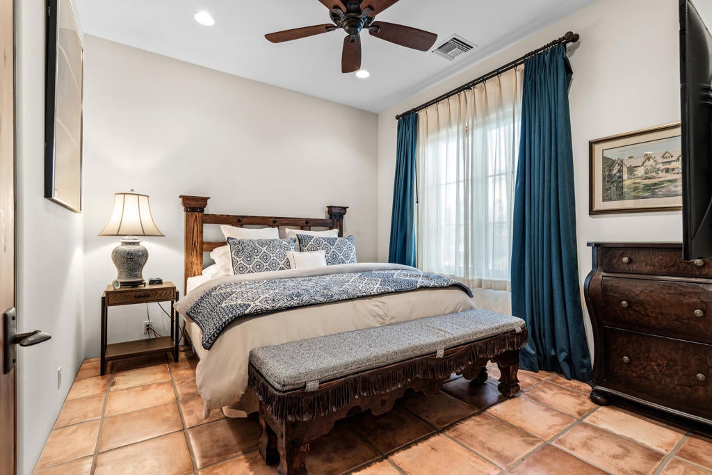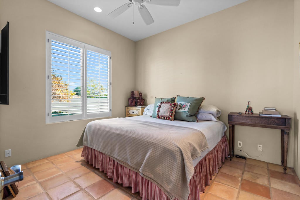 Nestled on an elevated pad at the end of a quiet cul-de-sac, this custom Spanish estate offers the perfect blend of old-world charm, exceptional craftsmanship, and modern luxury. As you enter the property through a winding drive, you're greeted by meticulously landscaped grounds and ample parking, including a spacious 4-car garage. The home's authentic Spanish architecture is highlighted by rustic stone accents, arched doorways, and intricate ironwork. The covered patio, with a cozy fireplace and outdoor kitchen featuring a pizza oven, provides an ideal setting for relaxed entertaining. Inside, hand-scraped Hickory floors lead to a sunken bar with soaring windows that capture breathtaking southern views, filling the home with natural light. A gourmet kitchen with an expanded pantry opens into an inviting living space. The main office features a walk-in wine cellar--ideal for a discerning collector. The primary retreat offers a generous walk-in closet and custom cabinetry. There are 3 ensuite guest rooms, plus a detached 1-bed, 1-bath casita with a kitchen. Located minutes from premier equestrian destinations such as Eldorado Polo Club and Desert International Horse Park, its enviable location also ensures effortless access to Coachella Valley festivals and a nearby private airport. The expansive lot offers space for additional possibilities, whether it's a horse stable (zoned for 4 horses), or an extra casita. Photograph(s) that include equestrian representations have been digitally modified to depict horses and a paddock. The digitally altered photograph(s) are for demonstrative purposes only and do not represent the current and/or future condition of the Property