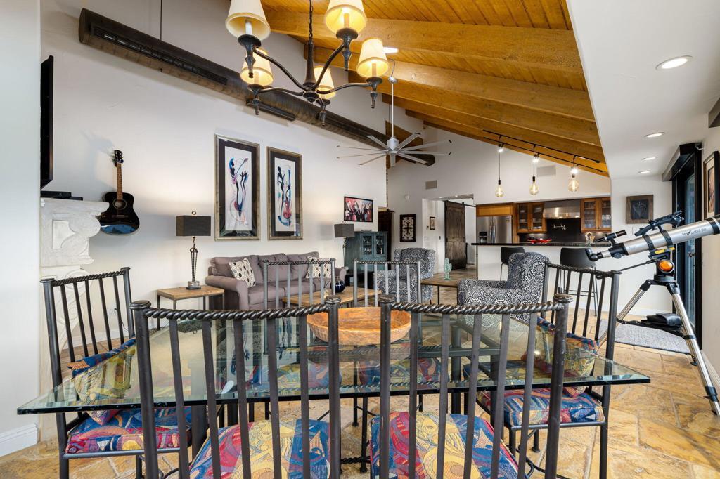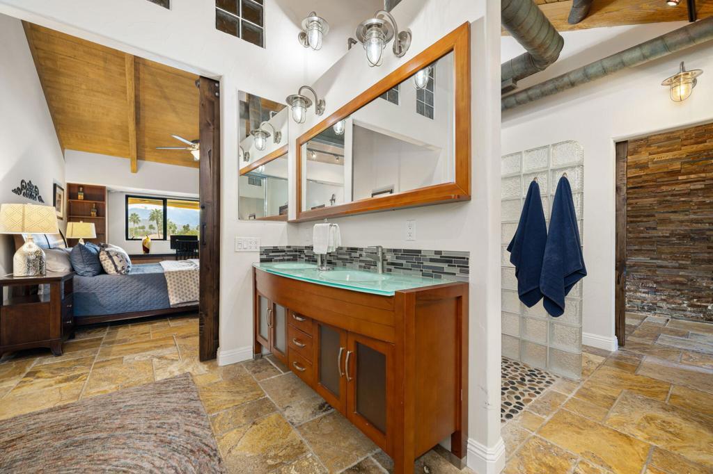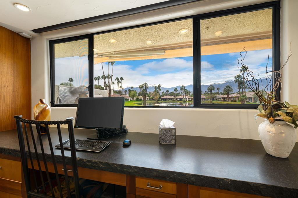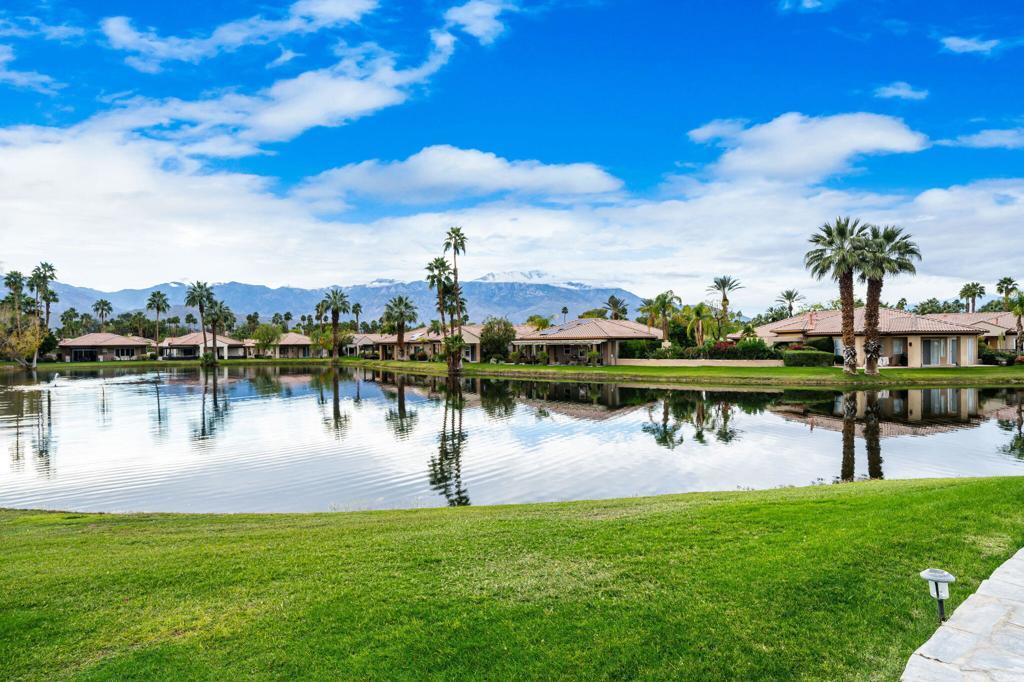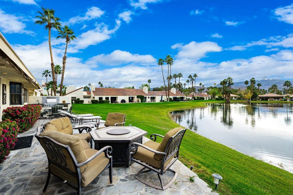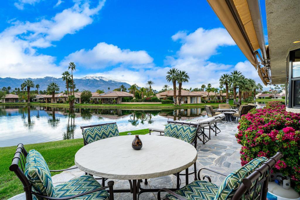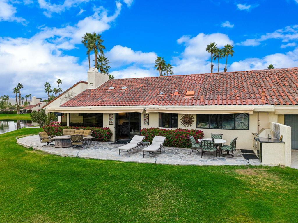 Beautifully updated loft-style condo in Mission Hills Country Club offering unobstructed lake and panoramic views of the Santa Rosa and San Jacinto Mountains from every room. Designed for effortless indoor-outdoor living, the expansive wraparound patio is ideal for sunset entertaining, al fresco dining, and relaxed gatherings, complete with natural stone finishes and a Viking outdoor kitchen. Inside, enjoy a dramatic stone entry, travertine flooring, gourmet kitchen with slab granite countertops, newer stainless-steel appliances, exposed ductwork, and soaring wood-beamed ceilings. An architecturally distinctive residence offering a refined desert lifestyle with privacy, comfort, and unforgettable views.