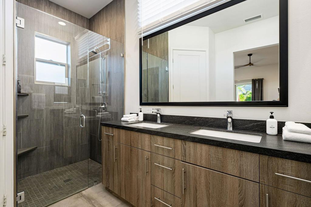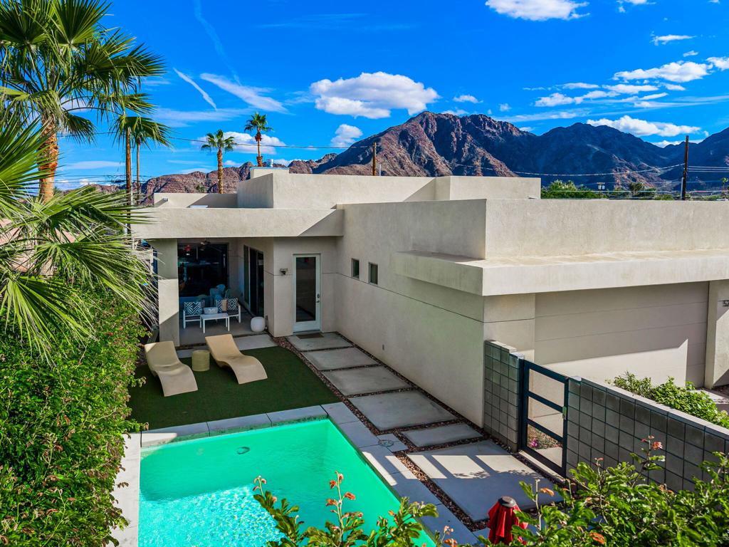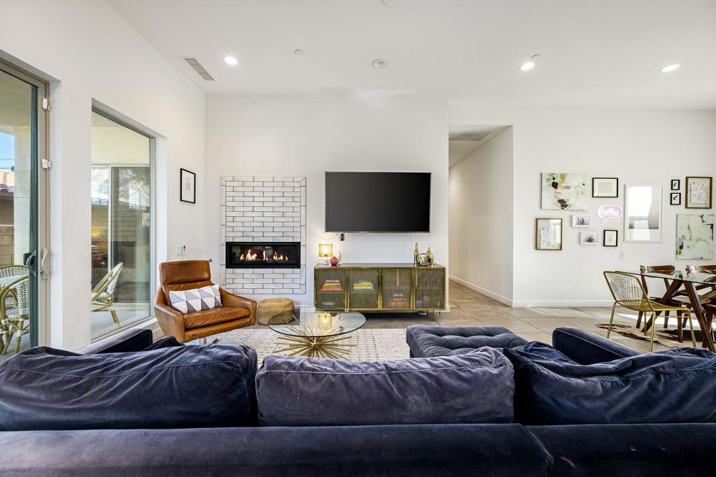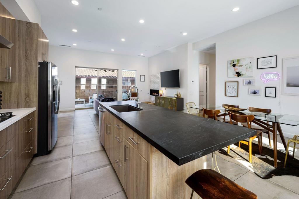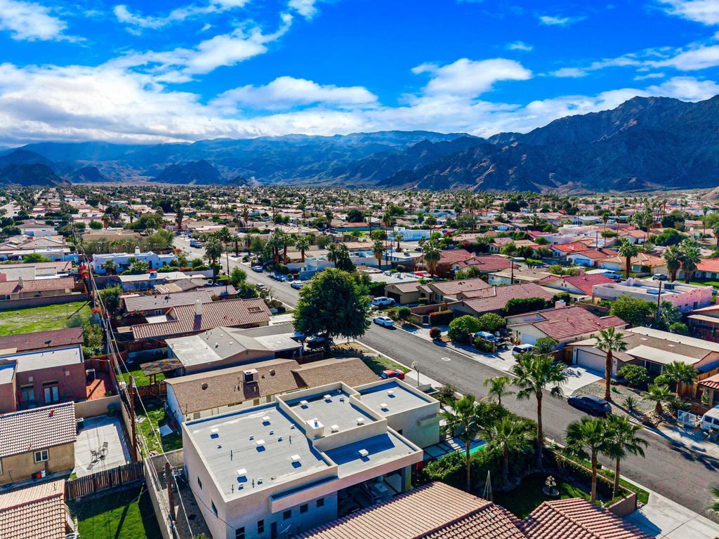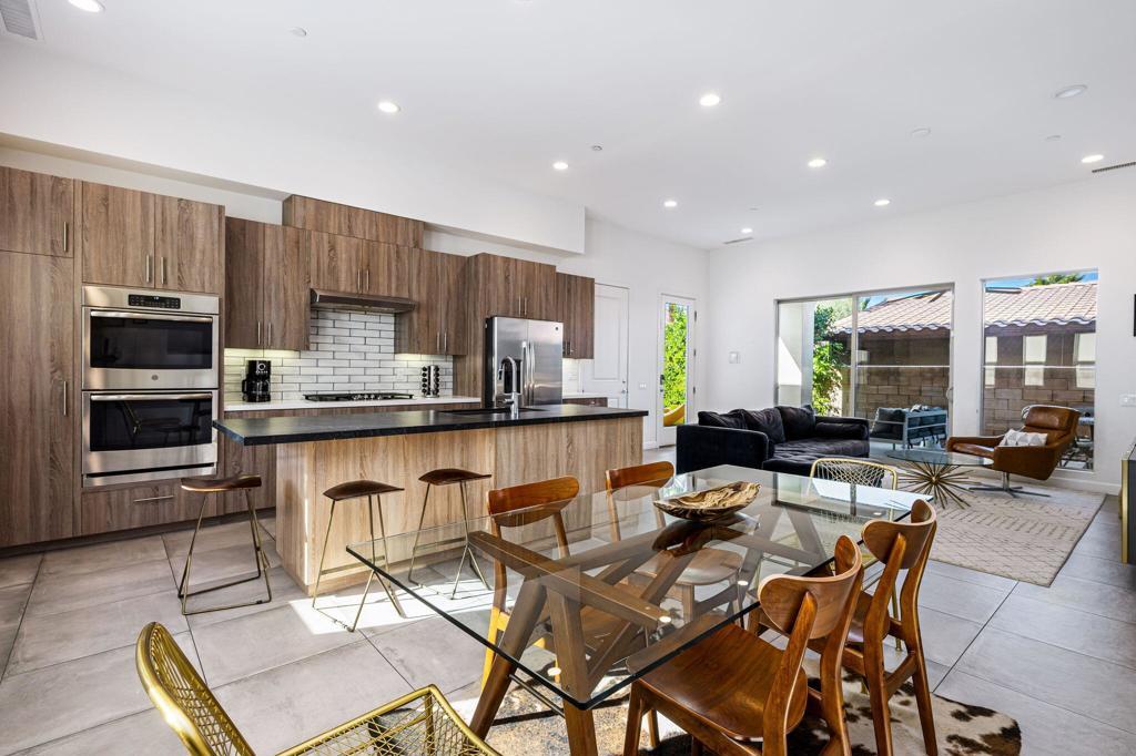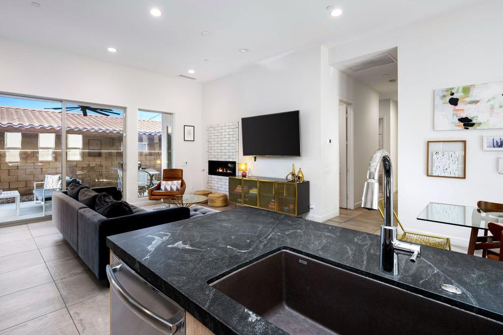 Modern in design and thoughtfully executed, this newer construction residence offers refined desert living in the heart of La Quinta Cove. Built in 2018, the home features a light, bright, and airy interior with an open-concept layout, high ceilings, and large-format ceramic tile flooring throughout. Clean lines, modern cabinetry, and updated finishes create a cohesive aesthetic that flows seamlessly from room to room. The kitchen is designed for both form and function, featuring stainless steel appliances, a gas range, double oven, and an oversized island with an eat-up breakfast bar. Open to the main living space, the kitchen connects effortlessly to the living room, where a gas fireplace adds warmth and architectural interest. Custom window shades and ceiling fans throughout enhance comfort and style. Outdoor living is a defining feature of the home. The west-facing pool and spa, positioned at the front of the property, include a Baja shelf and are heated for year-round enjoyment. Mountain views and low-maintenance landscaping create a private, relaxed setting, while a covered patio extends the living space outdoors. The primary suite offers a walk-in closet and direct access to the covered patio and pool area, reinforcing the home's indoor-outdoor lifestyle. Guest accommodations are well-appointed, including a guest bath with a large soaking tub. Additional features include a dedicated laundry room with washer and dryer, a spacious two-car garage with room for ample storage, security gate, and keyless locks. Ideally located moments from Old Town La Quinta, La Quinta Resort & Spa, dining, shopping, world-class golf, and entertainment. No HOA fees.