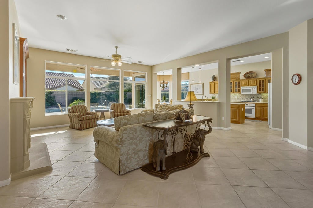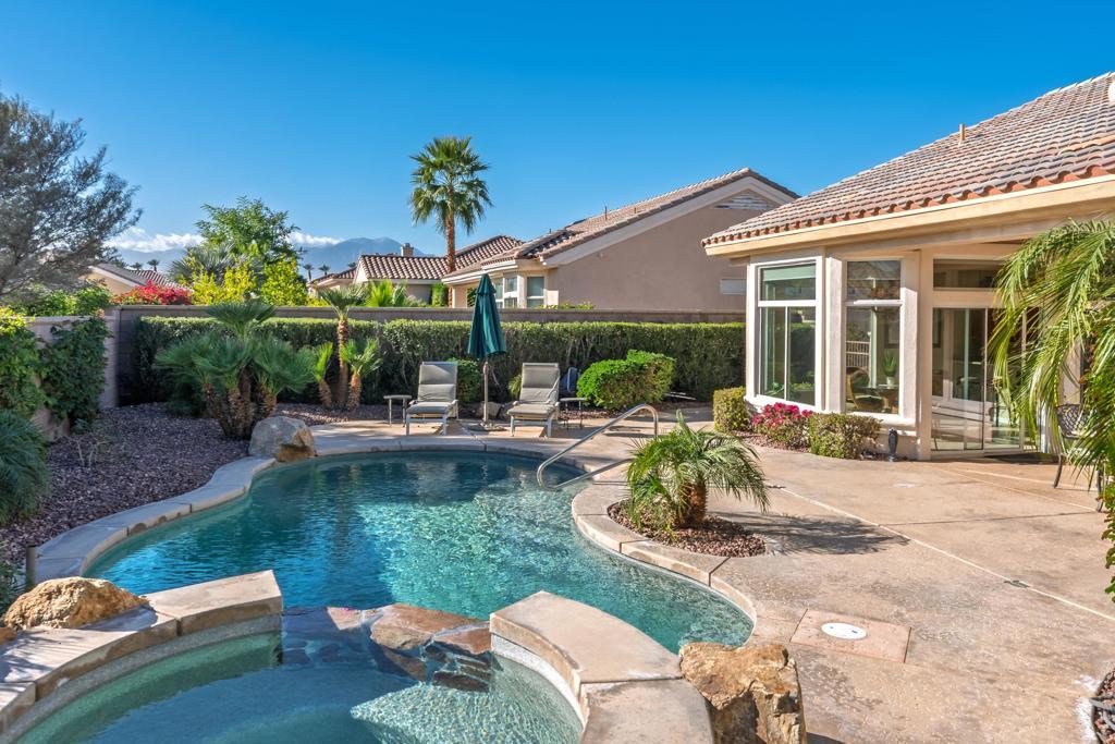 Sun City Palm Desert - Monterey. Ideally located in the heart of the community, just a short distance from the Lakeview Recreation Center and Sunset View Clubhouse, this impressive great-room home offers exceptional indoor-outdoor living. The expansive south-facing rear yard features a pebbletec pool and spa with cascading spillover, surrounded by a salt-finished patio with multiple seating areas and beautifully designed desert landscaping. A gated front courtyard and glass front door create inviting curb appeal. Inside, 10-foot ceilings and transom windows fill the home with natural light, creating an open and airy atmosphere. Diagonally laid tile flooring extends throughout the home except in the bedrooms and den. The great room is highlighted by a custom built-in media center and gas fireplace. The kitchen is well-appointed with cabinetry featuring inset glass doors and pull-out shelves, speckled corian countertops, under-cabinet lighting, tile backsplash, and a breakfast bar with pendant lighting. Raised panel maple cabinetry is in the kithchen and bathroom. Dining options include a spacious breakfast nook and a formal dining area. An ample den/office is located just off the great room. The primary suite features French doors opening to the rear patio and a large walk-in closet. The en-suite bath offers a stall glass-enclosed shower, soaking tub with glass-block window, dual sinks, and upgraded tile surfaces and lighting. The spacious guest suite includes its own en-suite bath with shower/tub combination. Additional highlights include a 2+ car garage with golf cart space and utility sink. New a AC installed in 2022.