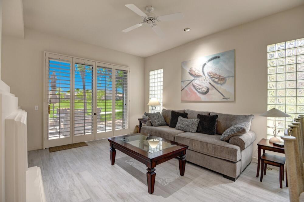 Light and bright south-facing condo featuring the rare Acacia 2 floor plan, ideally positioned on the 7th hole of the Grove Course with sweeping fairway and mountain views. Recently updated with luxury vinyl plank flooring throughout, this desirable great room layout is ideal for both entertaining and everyday living. The living and family rooms are separated by a dual-sided, see-through fireplace, creating ambiance and a natural flow between spaces. The spacious kitchen offers a breakfast bar and opens seamlessly to the family room. The private primary suite is tucked off a charming front courtyard, providing a peaceful retreat, while an additional guest bedroom is perfect for family or visitors. Enjoy outdoor living from the south-facing patio and take advantage of nearby community amenities. Offered furnished, including a 4-seat golf cart. Golf membership available with waitlist.