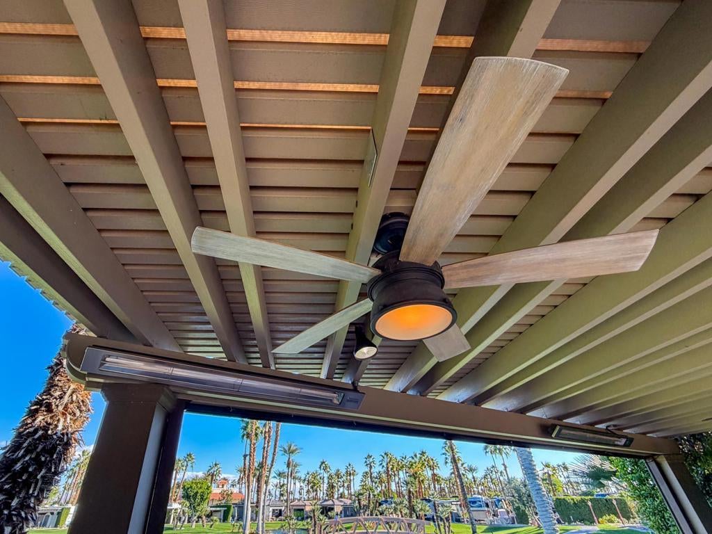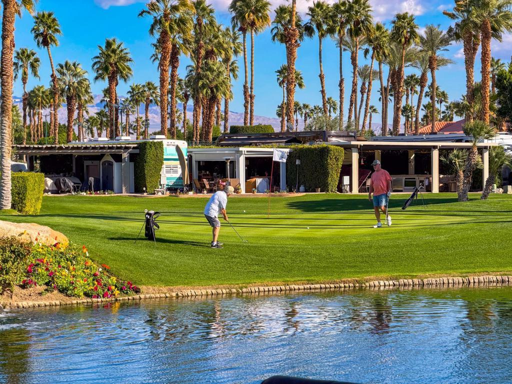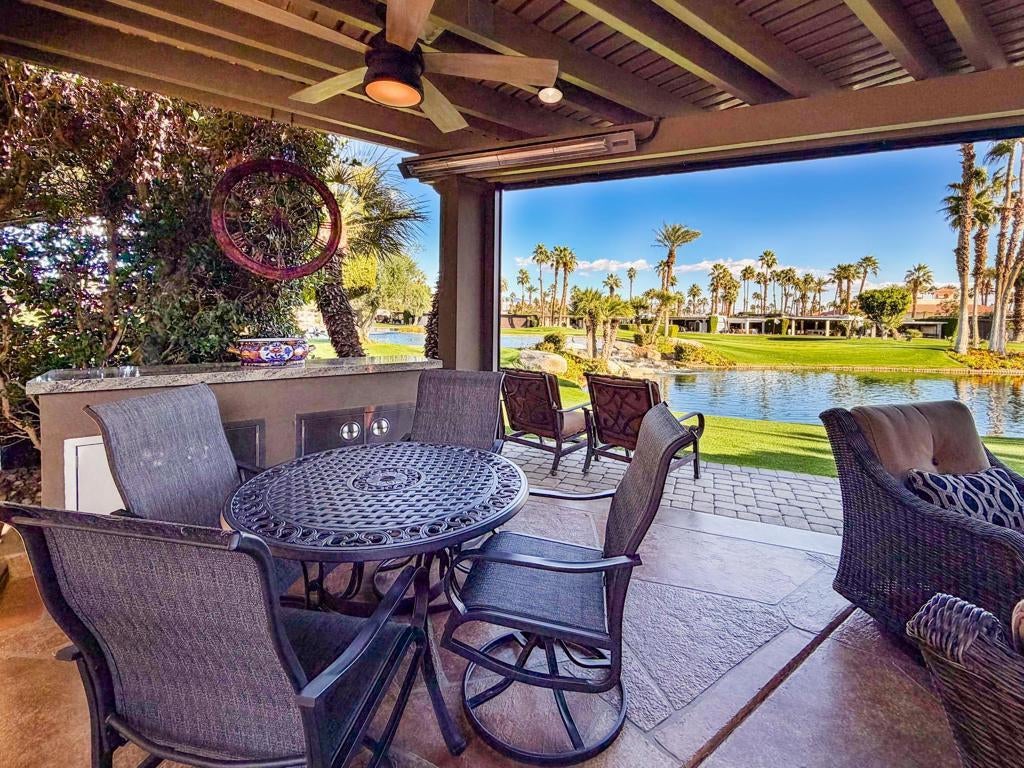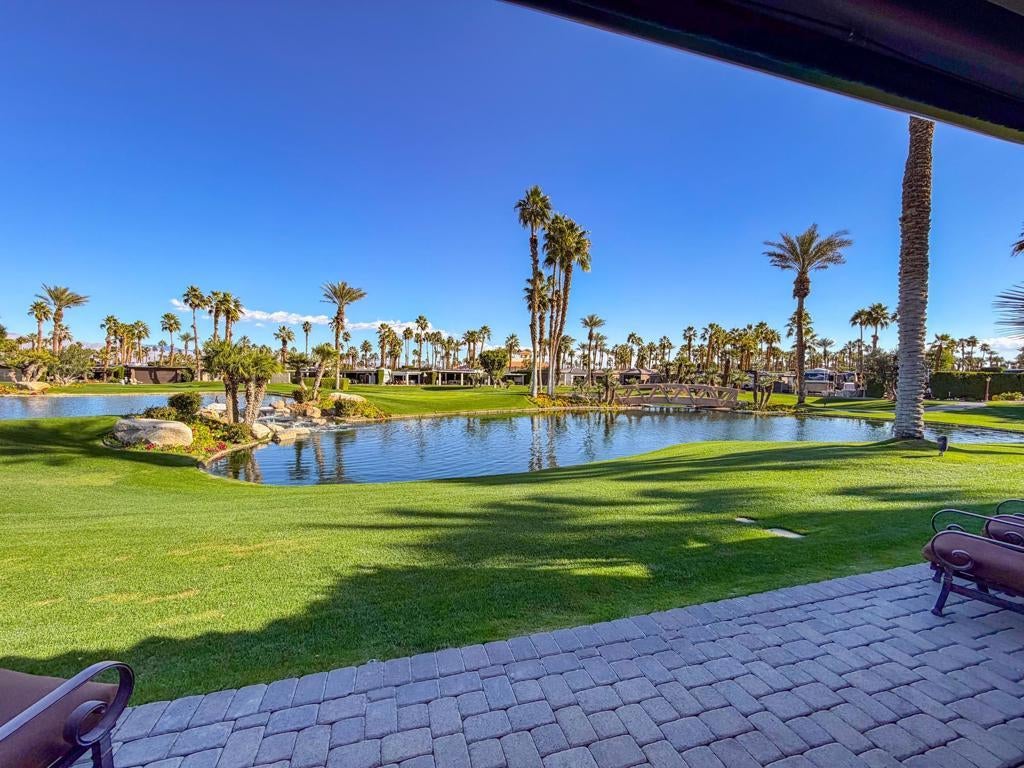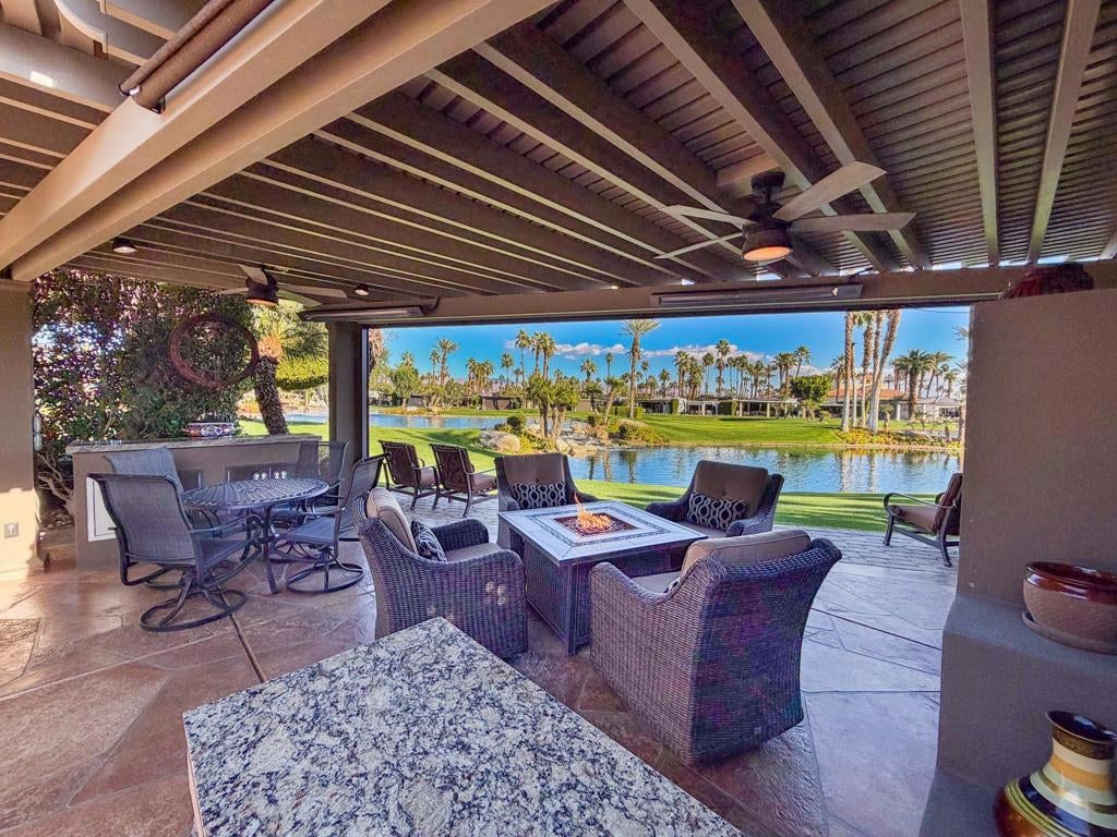 This private luxury RV lot at Outdoor Resort Indio offers panoramic water, golf course, and mountain views paired with premium upgrades and exceptional outdoor living. Mature privacy hedges frame a high-quality custom epoxy decorative RV pad and an extended paver rear patio, creating generous space to relax while enjoying wide views of the lake, waterfall, bridge, and golf course.A large L-shaped Alumawood pergola defines the living area and includes three ceiling fans, three ceiling heaters, misters, and a rear electric screen for all-day comfort. The custom outdoor kitchen features stone countertops, a built-in BBQ island, oven, dishwasher, wine cooler, under-counter refrigerator, two-burner cooktop, large sink, stainless storage drawers, built-in cabinetry, and a matching rolling cabinet--ideal for entertaining.An entertainment center with fireplace sits beneath the pergola, perfectly positioned with the lake and waterfall centered behind the lot. Additional highlights include a 200-amp electrical upgrade, updated water line, and ample built-in storage. This RV lot delivers privacy, striking views, and upscale finishes in one of Outdoor Resort Indio's most desirable locations.Outdoor Resort Indio is a Class A RV only resort.