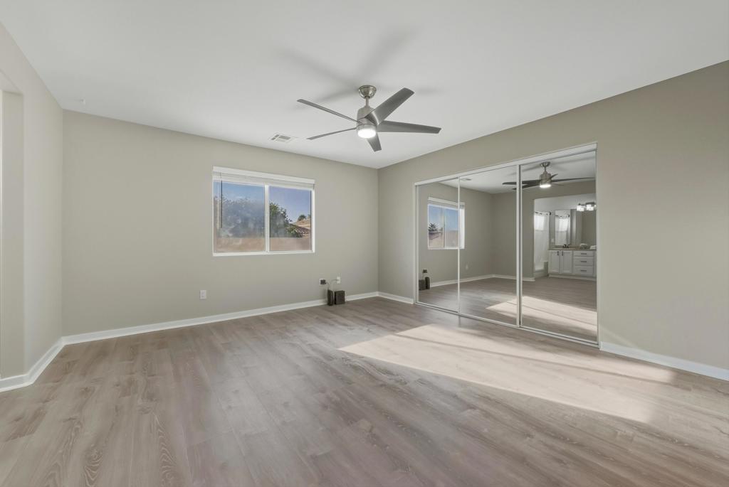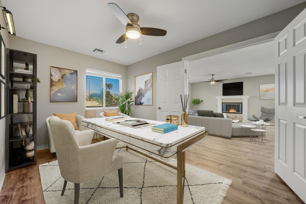 Million dollar mountain views from this ideally located and beautifully updated 4 bedroom, 2 bathroom home in Mission Lakes Country Club. This home has a dining area, den, laundry room, 3 car garage, 4 bedrooms, and two large bathrooms. Enjoy two unlimited golf memberships for up to two owners on the Deed when you purchase in Mission Lakes Country Club. You will find an active social calendar including weekly golf, fitness, tennis, bridge, weekly brunch and game nights in this active country club community. Some of the outstanding features of this home are a recently renovated kitchen including quartz counters, newer appliances, recess lighting, new blinds, all new flooring, fresh paint, newer roof (2 yrs old), and a 3 car garage with new automatic garage doors. You have no neighbors to the left of you and no neighbors behind you so yo can enjoy the amazing million dollar mountain views from the back yard, kitchen, den, and primary bedroom of this meticulously maintained home. The HOA dues are only $500 per month and includes unlimited golf for two people, resort style pool and spas, tennis courts, a gym, a clubhouse, bocce ball, ping pong, pickle ball, and a wide variety of activities within the club. Don't miss your opportunity to live in a highly desirable location within Mission Lakes Country Club with million dollar mountain views! Three photos are virtually staged; the living/dining rooms, the family room, and the office. Seller will consider a lease offer as well. Call today to see this outstanding home!