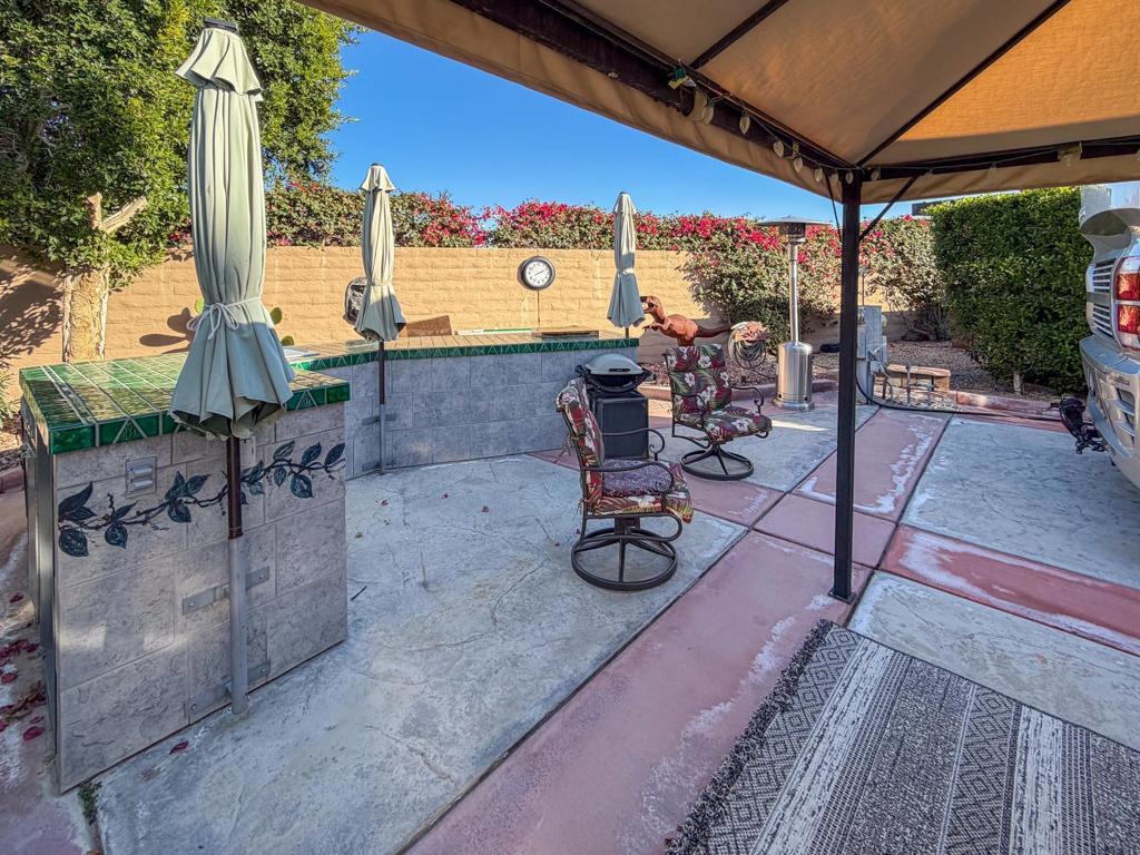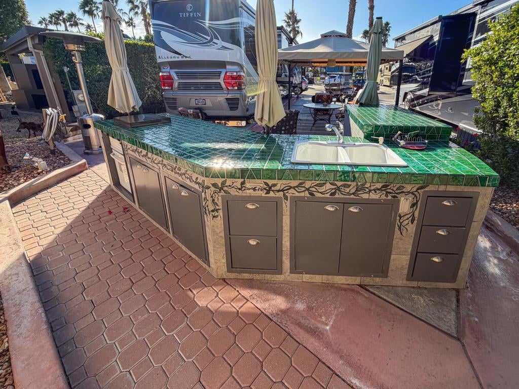 This luxury RV lot at Outdoor Resort Indio offers a unique blend of style, comfort, and resort convenience, designed for relaxed outdoor living and easy entertaining. A gazebo-style sun shelter and extended paver surfaces enhance the width and usability of the lot, creating multiple inviting spaces to enjoy the desert lifestyle.The medium-sized outdoor kitchen is thoughtfully arranged toward the rear of the lot for added privacy and shade, featuring a sink with hot water, cooktop, oven, refrigerator, and generous storage. Eye-catching custom paint embellishments add character and charm, while recently updated water fixtures ensure modern functionality. The lot comes furnished and includes a golf cart, making it truly move-in ready.Three umbrellas provide additional shade over the kitchen and seating areas, and the spacious rear of the lot offers a peaceful, private retreat ideal for relaxing or hosting friends. Located within walking distance to a satellite pool, hot tub, and laundry facilities, this RV lot combines thoughtful upgrades with a prime location--perfect for enjoying all that Outdoor Resort Indio has to offer.Outdoor Resort Indio is a Class A only RV resort