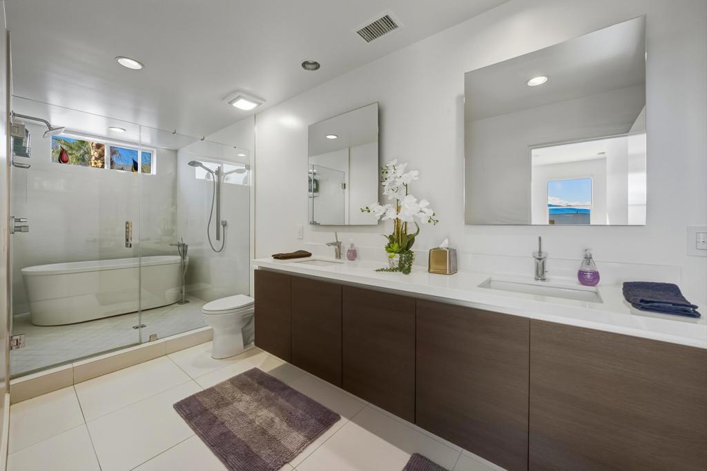 Welcome to this beautiful contemporary home in the highly desired gated community of The Morrison. Enjoy this home's open floor plan including a spacious great room with 10' high ceilings, a main level bedroom and bathroom, dining area, and a Chef's kitchen with breakfast bar and upscale appliances. Sleek finishes & upgrades include Porcelanosa tile flooring, Hans Grohe fixtures, Viking appliances, newer Bosch dishwasher, Caesarstone countertops, and a modern gas fireplace - all adding to the allure of this home's contemporary architecture. The main living area boasts Fleetwood sliding glass doors, opening to an expansive front patio entertaining area featuring custom pavers and a beautiful pebble tec pool with raised spa and water feature. Other main level features include a guest bedroom with an adjacent full bathroom, and a stackable washer/dryer in laundry closet. The impressive, spacious upper-level primary bedroom suite showcases beautiful western and southern mountain views, a large walk-in closet, and a spa-like bathroom with dual vanities, and a large walk-in double shower with a soaking tub. Rounding out the top floor is another guest bedroom with ensuite bathroom and pretty mountain views. For your listening pleasure, speakers were installed in the great room, primary bedroom, and guest bedroom. For energy efficiency, this home has a 24-panel solar system that is owned. The interior and exterior of the home have been freshly painted. The 2-car garage has been insulated, has a tankless water heater and plenty of storage cabinets. The Morrison homes are on fee land (you own it) and have low HOA dues that include building property insurance and earthquake insurance! The community's premier location is close to downtown, and all that Palm Springs has to offer. Don't miss this beautifully appointed home in the gated community of The Morrison in heart of Palm Springs.