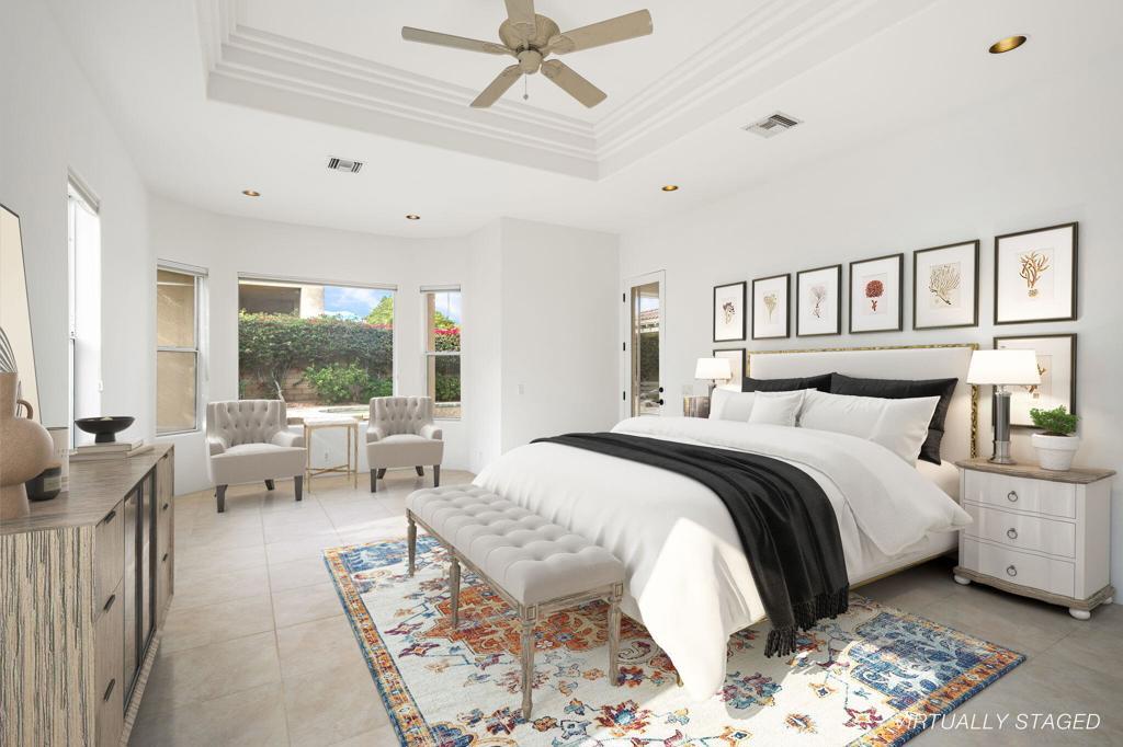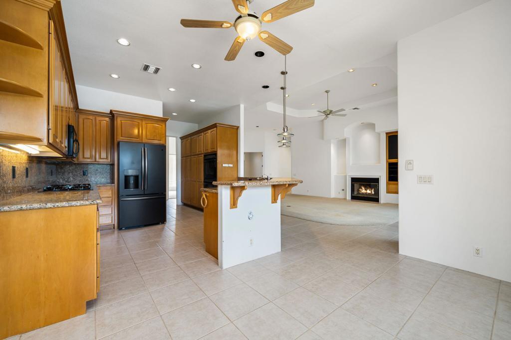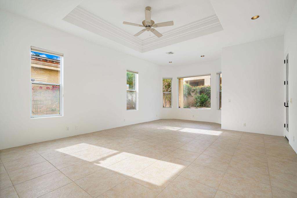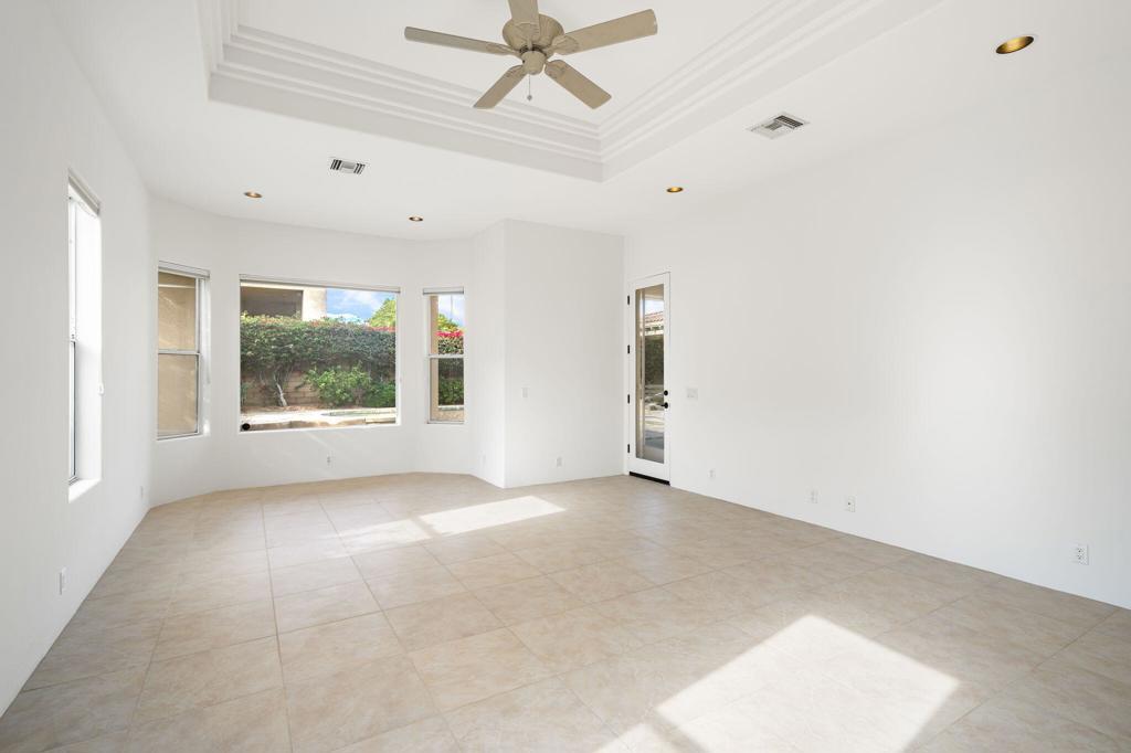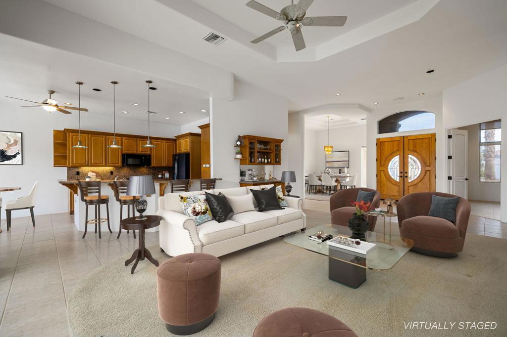 Welcome to this beautifully appointed 2,823 sq ft single‑family home, set within the exclusive guard‑gated community Montecito Homes offering privacy, security, and a refined desert lifestyle. The moment you step inside, a spacious foyer opens to the elegant formal living room, where an oversized sliding door draws your eye to sweeping mountain views and provides effortless access to the private yard and pool area perfect for relaxing or entertaining. At the heart of the home is a large, inviting kitchen that seamlessly connects to the dining room, creating a natural flow into the living room. This open layout enhances both everyday living and hosting, offering a warm, connected atmosphere throughout. Two guest bedrooms share a well‑designed Jack‑and‑Jill bathroom, providing comfort and convenience for family or visitors. A separate family room, office or optional 4th bedroom adds valuable flexibility. The oversized primary suite serves as a private retreat, featuring a spacious bedroom, a generous primary bathroom, and a large walk‑in closet. The three‑car garage offers ample storage and parking. Additional features include a leased solar system for energy efficiency and a backup generator for added peace of mind. Blending thoughtful design, stunning views, and resort‑style amenities, this home offers an exceptional opportunity in one of the area's most desirable gated communities.