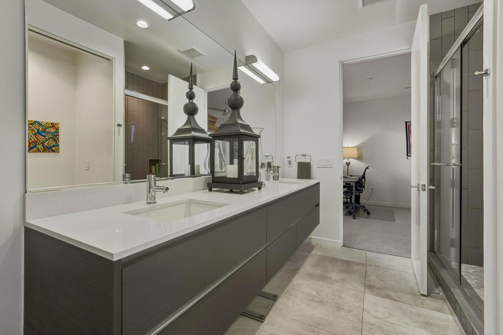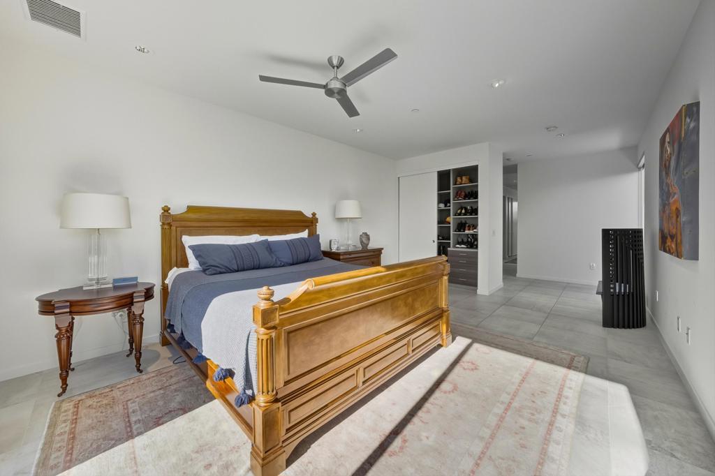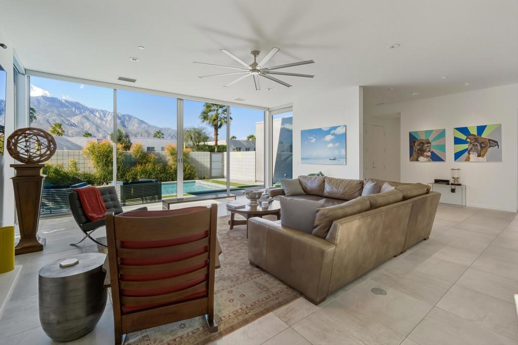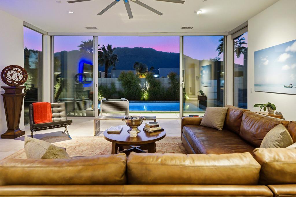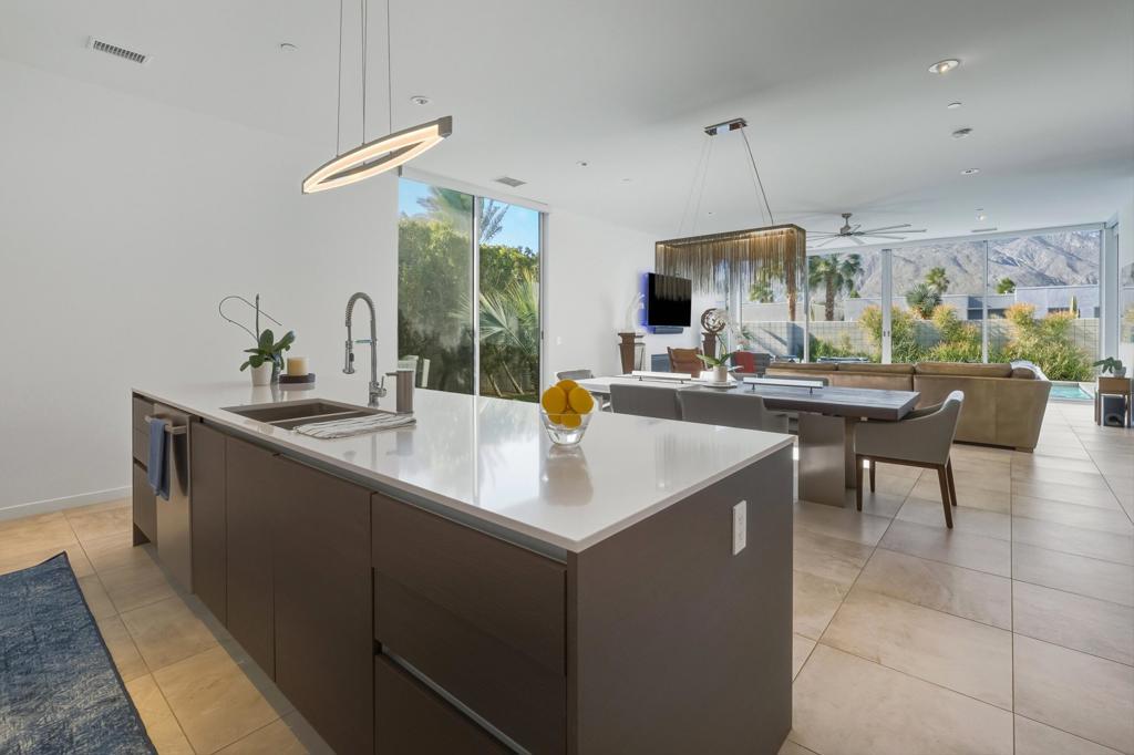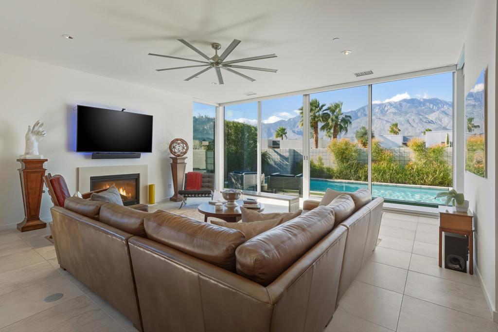 Welcome to Escena, where luxury meets contemporary elegance in this highly desired Anthony Poon designed home with AMAZING views of the San Jacinto mountains. This beautiful Alta Verde home features a wall of Fleetwood sliding doors that open to a front-loaded pool and spa, showcasing phenomenal views of the western and southern mountains. One of the larger homes in Escena, this home offers 2649 sq. ft. of luxurious living space with 3 bedrooms and 3 bathrooms. A chef's kitchen is a culinary delight with quartz countertops and backsplash, Italian designed cabinetry, stainless-steel Bosch appliances and an oversized island. The spacious open floor plan consists of the kitchen, living and dining areas, 10'+ high ceilings, porcelain tile flooring, a fireplace, custom lighting, and spectacular views. The expansive primary bedroom suite, extending the entire width of the home, has cornered Fleetwood sliding door access to a private back patio, a huge double-headed walk-in shower tucked behind dual vanities, and an extra amount of closet space, all organized by California closets. The two guest bedrooms share a Jack and Jill bathroom, with good separation from the Primary bedroom. This home offers Palm Springs indoor/outdoor living at its finest with dual sets of Fleetwood sliding doors opening from the great room to the outdoor patio and pool, perfect for entertaining or just relaxing in the sun as you revel in the unbelievable mountain views. Another Fleetwood sliding door opens from the kitchen to a lovely side yard/patio of pavers and artificial turf, perfect for relaxing or cooking on the outdoor BBQ. A blocked retaining wall spreads across the back of the property boasting lush landscaping, including beautiful bougainvillea bushes and Meyer lemon and tangerine trees. Lighting and landscaping surround the property, adding to the privacy of the outdoor space and its alluring night-time beauty. Additional highlights include motorized blinds in the great room and primary bedroom, a powder room for guests, a separate laundry room with cabinetry, 2-car garage, upgraded recessed lighting and 26 solar panels for energy efficiency. Escena is a highly sought after guard-gated golf course community with low HOA dues and resides on fee simple land (you own it). Do not miss this beautiful Palm Springs contemporary home, offering luxury, unparalleled comfort, style, and some of the best views in Escena!