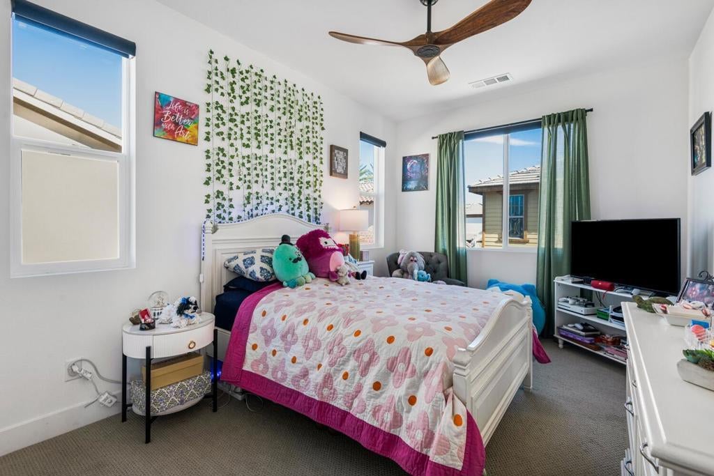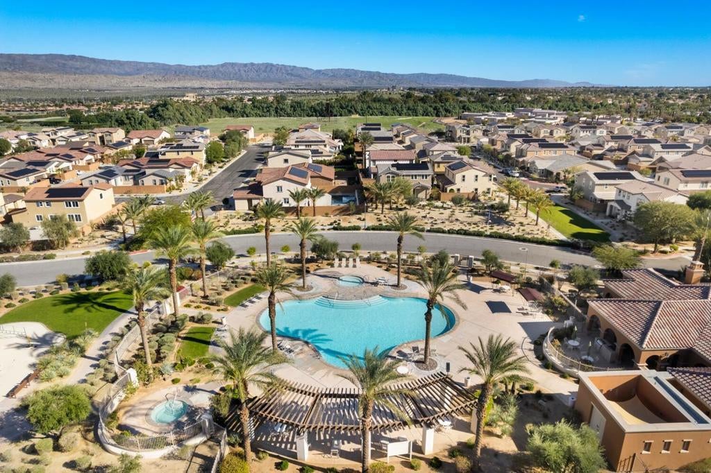 This upgraded detached home is located in the gated Campanile community, just minutes from shopping, dining, schools, downtown Palm Springs, and the airport. Built in 2023 and set on a premium lot, this energy-efficient residence offers nearly 2,000 square feet of well-designed living space across two levels, with mountain views from most rooms. The main level features a covered front porch and an open-concept living area with high ceilings, porcelain tile flooring, abundant natural light, and custom solar shades that enhance comfort and efficiency. The modern kitchen includes shaker-style cabinetry, a large quartz island, and stainless-steel appliances. A first-floor bedroom and full bath offer flexibility for guests or a home office. Upstairs, the primary suite features a walk-in closet and a spa-inspired bath with dual sinks and a tiled walk-in shower. Two additional bedrooms share a Jack-and-Jill bath, along with a dedicated laundry room. The private backyard offers low-maintenance living with an expanded patio, irrigation, gas BBQ hookup, and a Mediterranean-style stone fountain. Additional highlights include paid-off solar, a tankless water heater, and a two-car garage. Community amenities include a pool, spa, clubhouse, fitness center, and HOA-covered cable and internet.
