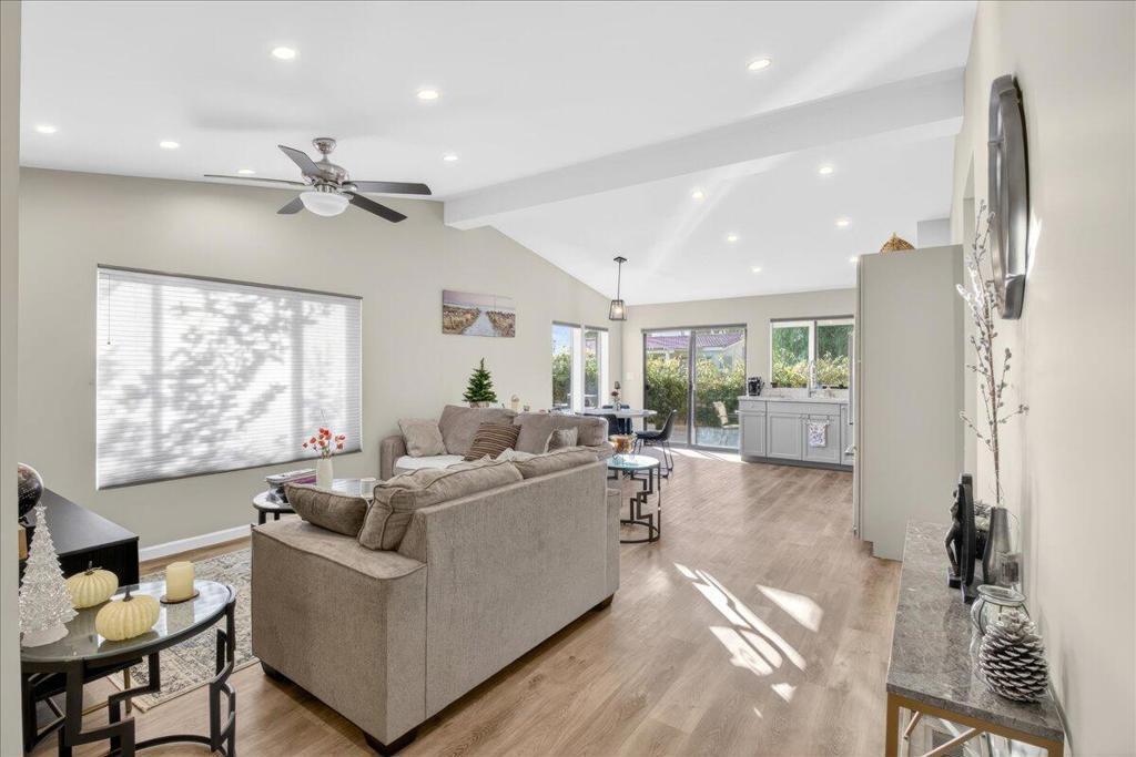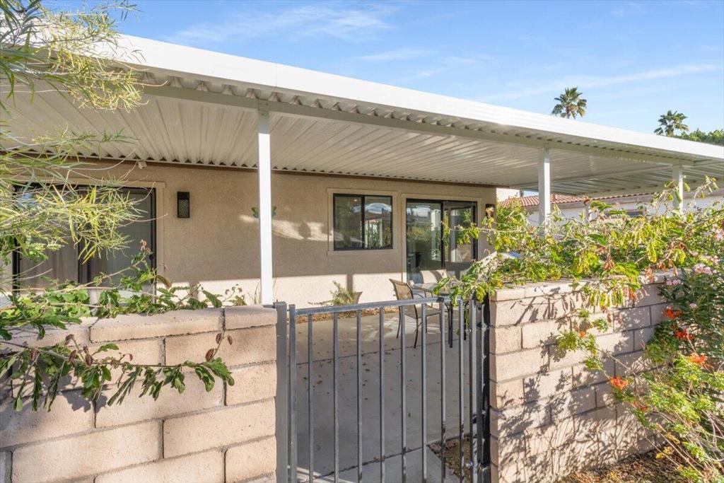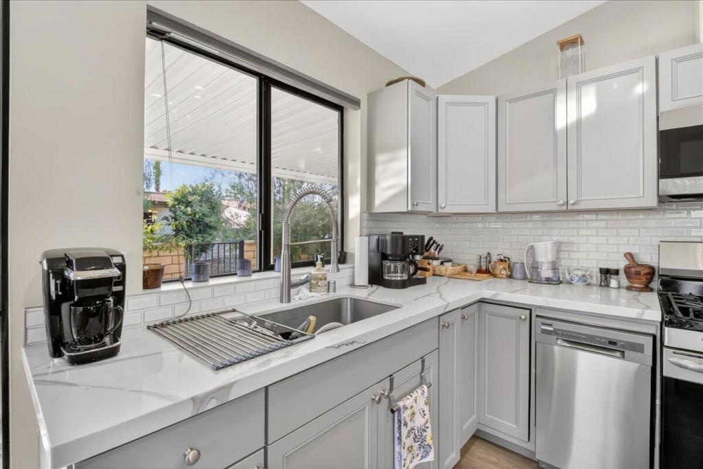 Beautiful remodel in 2021 in the Palm Desert gated community of Golden Sun Estates. Kitchen includes newer appliances, quartz countertops, open floor plan with vaulted ceilings. Newer doors and windows, recessed lighting and custom window treatments. Oversized primary bedroom and bath with dual sink vanities and updated tile showers in both bathrooms. Two-car attached garage with new epoxy floor. Covered patio, greenbelt that offers extra space between properties in the back yard. Mountain views from the patio, South facing exposure, low maintenance yard with citrus trees. Golden Sun Estates offers tennis court, community pool and spa, greenspace and pet friendly. The home is located close to shopping centers, restaurants and stores. Low HOA dues and well-maintained common areas.