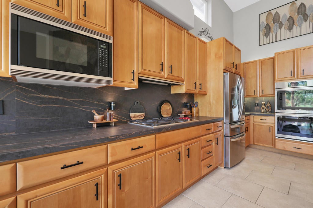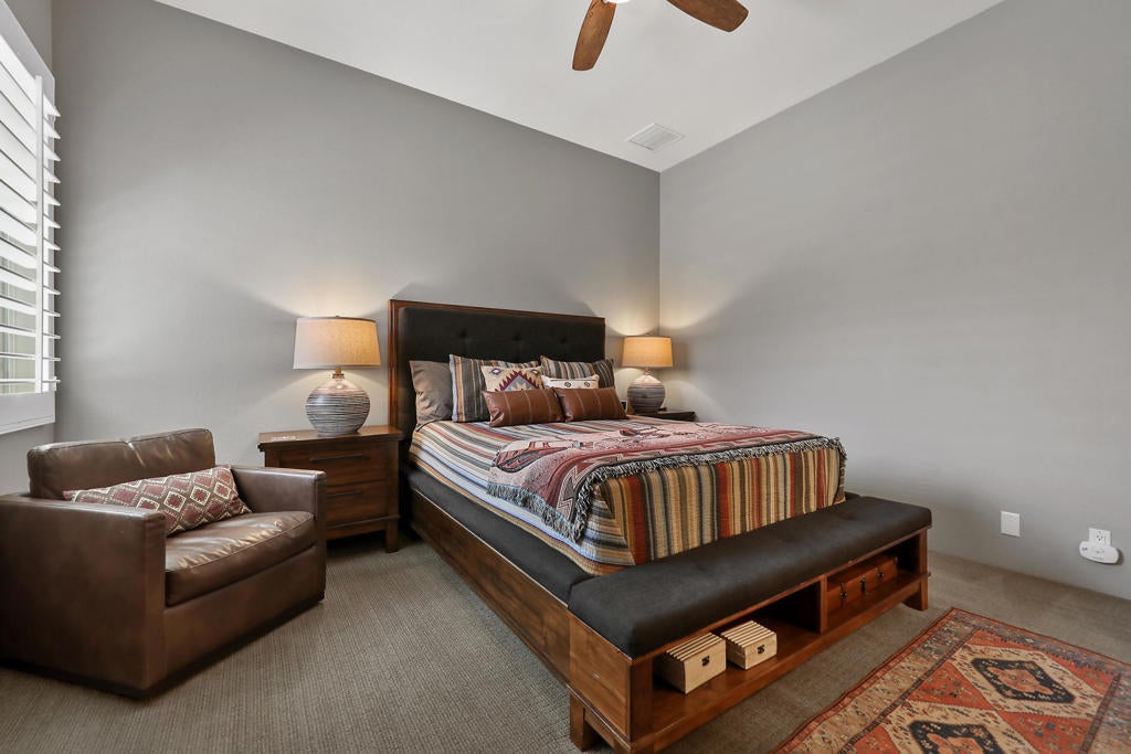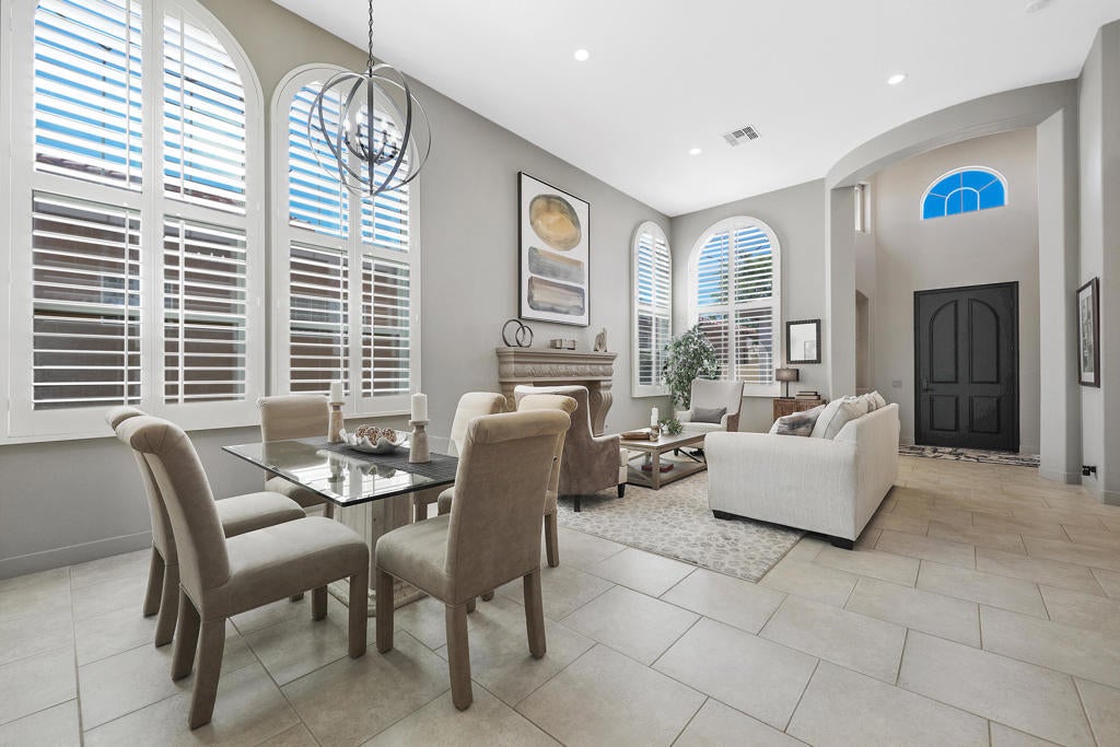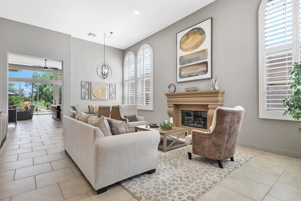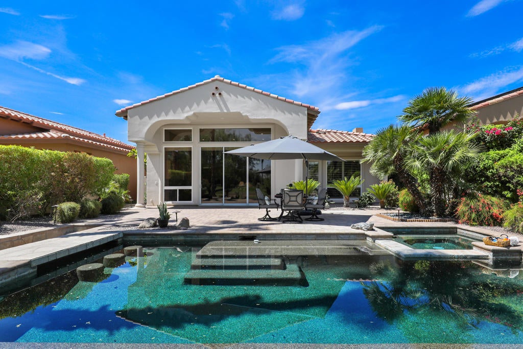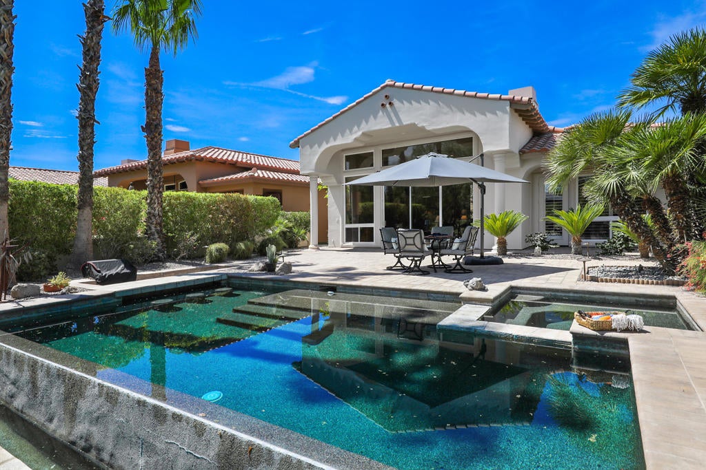 Discover the perfect blend of luxury, privacy, and resort-style living in this beautifully upgraded 4 bedroom, 4 bath Encanto ll home, ideally situated on the 2nd fairway of the Pate Golf Course-one of two at Rancho La Quinta Country Club.Step through the gated front entry into a peaceful courtyard with a soothing water feature and a newly re-done two bedroom guest casita with jack and jill bath and new porcelain flooring, which offers comfort and privacy for guests or your own dedicated retreat space.Inside the main home, you'll find a spacious formal living room and dining area with soaring ceilings and a dramatic fireplace, perfect for entertaining or cozy evenings by the fire.The stunning great room invites casual elegance, featuring a sleek slate-style fireplace, with a large media TV, and open flow into the newly renovated gourmet kitchen. Designed for both beauty and function, the kitchen boasts a luxury porcelain island countertops and backsplash by Costentino, which are matte finished, new double ovens with air fry and Sous Vide, plus a French door refrigerator.The main residence includes two bedrooms, including a luxurious Primary Suite with spa-like bath, dual vanities, and a spacious shower. A well appointed guest bedroom and bathroom complete the layout along with a powder room.Enjoy seamless indoor-outdoor living with a resort-style backyard featuring an infinity-edge Pebble-Tec pool with sun shelf, built-in BBQ area, and breathtaking views of the lake and fairway. The elevated lot provides added privacy while maximizing the scenery.This home has been meticulously maintained and includes new porcelain counters in kitchen and hall, new double ovens, new refrigerator, new washer and dryer, and outdoor and interior painting. Also, some new windows, new 2 speed pool pump and salt system cells. New cabinet hardware and plumbing fixtures throughout. Upgraded baseboards, new wall switches, numerous new light fixtures, NEST's throughout, new garage door, openers and outdoor putting green. Offered furnished per inventory, this exquisite home is ready for you to enjoy the best of desert living at Rancho La Quinta Country Club. See attached Improvement and Inventory Lists.