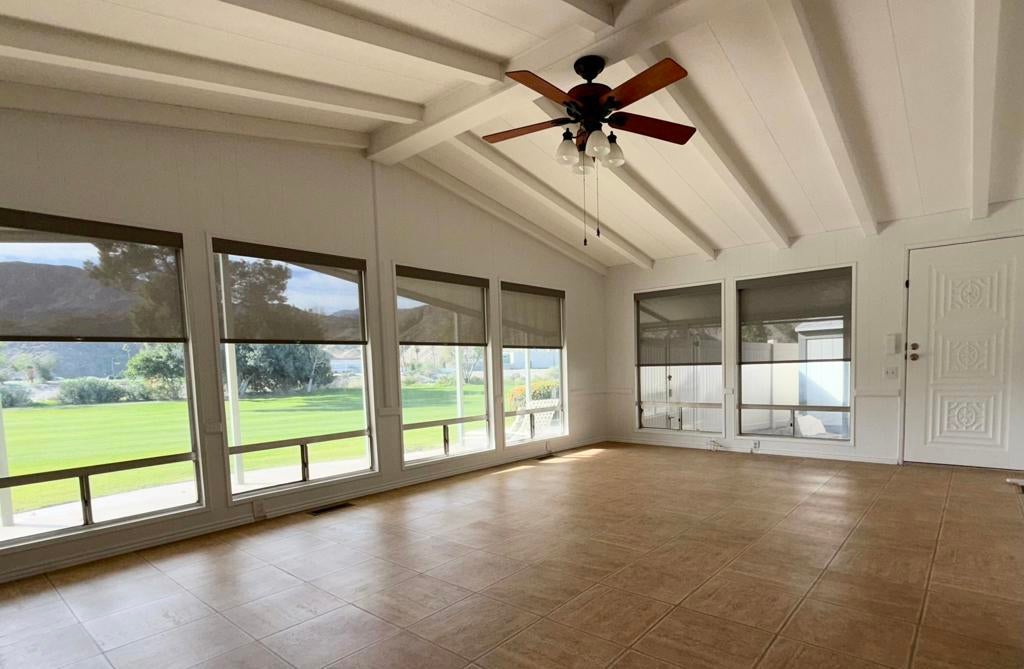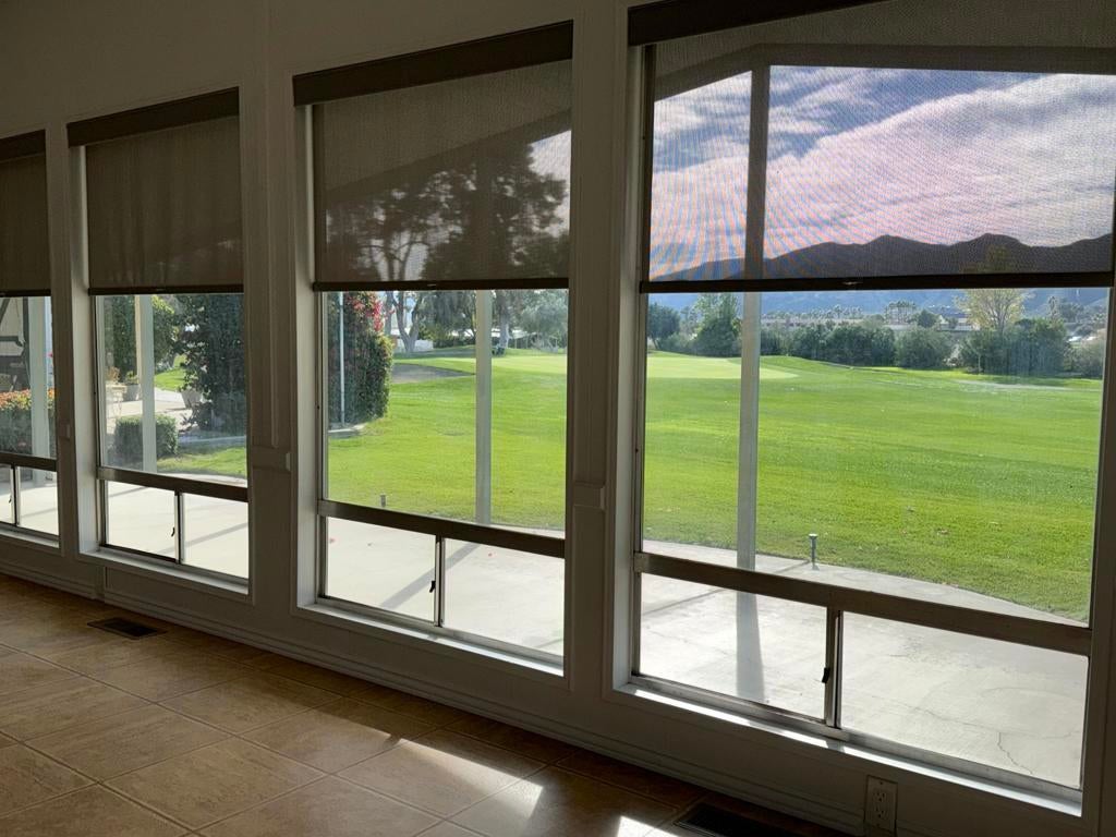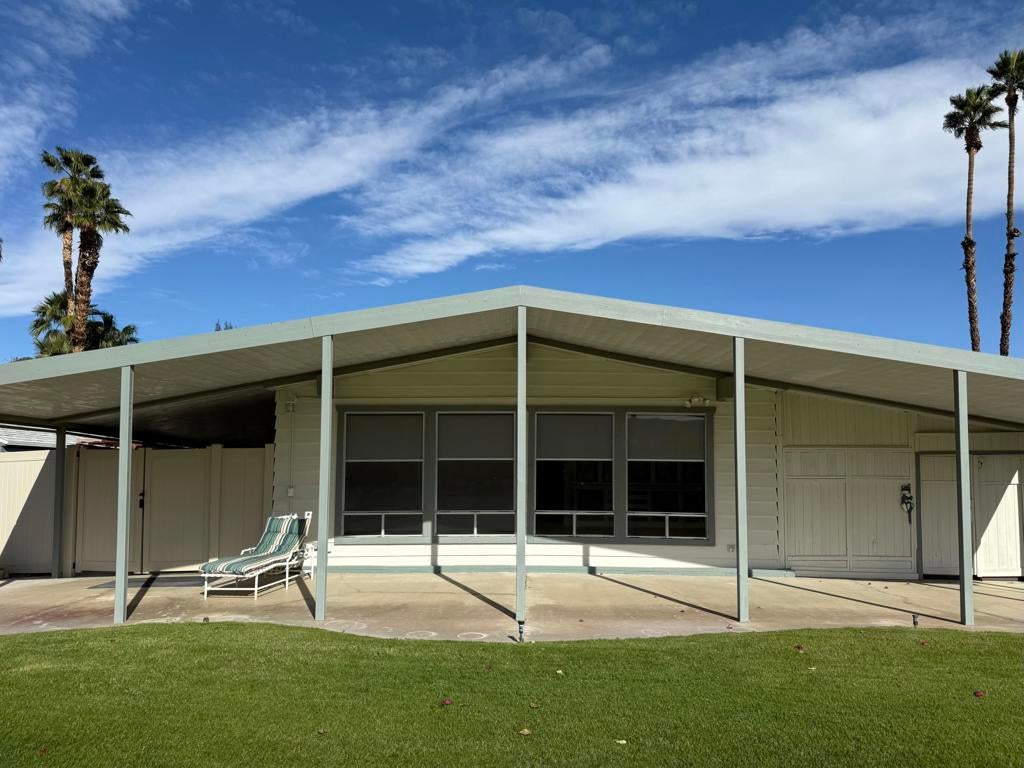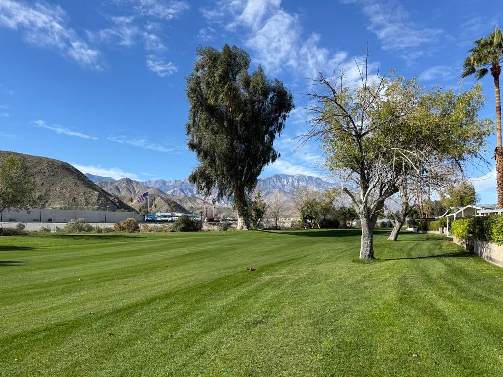 Panoramic southern-facing mountain and golf course views from one of the best locations in Date Palm Country Club.This well-cared-for 1440 2-bedroom, 2-bath home sits on the back 9 of the community, offering sweeping fairway and mountain views with excellent privacy. The living room features vaulted ceilings with exposed beams and four oversized picture windows that flood the space with natural light and frame the views beautifully.The kitchen includes black granite countertops, a center island, and matching black appliances, with a window over the sink looking out to the private side patio. A second living area with a built-in wet bar sits just off the kitchen, ideal for entertaining.Outdoor living truly shines here with a private, covered side patio featuring an above-ground hot tub, lush greenery, newer vinyl fencing, and a wraparound design that leads to the back patio overlooking the golf course. Additional features include a golf cart garage with extra storage, newer tankless water heater, solar shades, recessed lighting, dimmer switches, sprinklers and drip system, and a great wood shed.Located in Date Palm Country Club, a gated 55+ community offering an 18-hole executive golf course, pools and spas, pickleball and tennis courts, fitness center, dog park, clubhouse, and on-site restaurant, Nick's Bistro.Move-in ready. Motivated sellers. Priced to sell.
