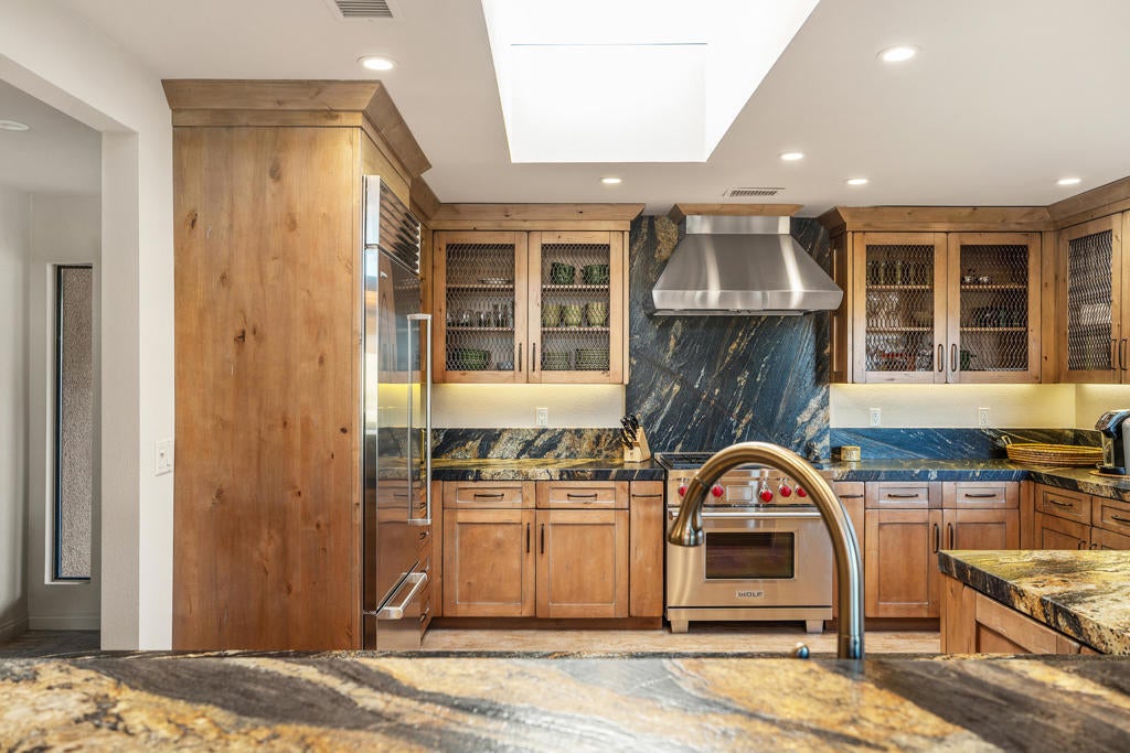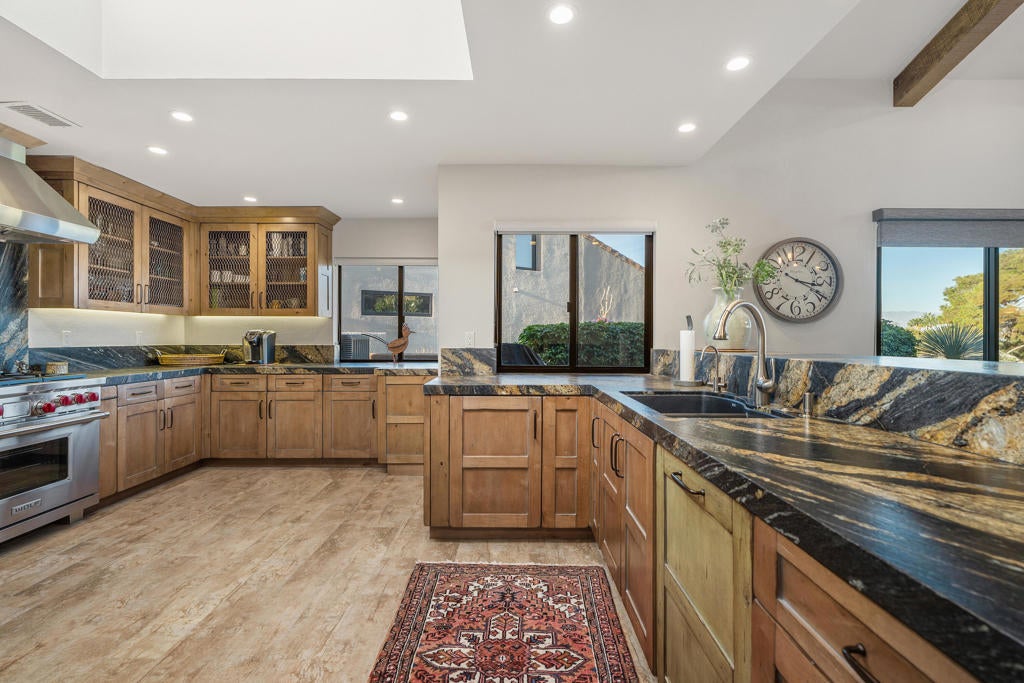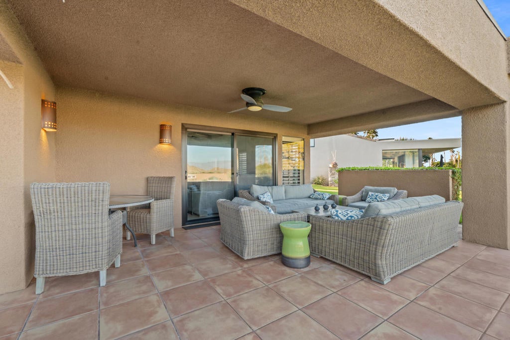 Welcome to the best of desert living! This classic custom remodeled freestanding Skyview Villa has it all. Enjoy the 180 degree views to the east of Eisenhower Mountain & the Santa Rosa range from high above the 10th fairway of the North Course at Ironwood Country Club. Completely remodeled with custom touches throughout, the home features tiled and carpeted floors, custom blinds, vaulted and beamed ceiling in the great room, a kitchen skylight, designer light fixtures & ceiling fans. The gourmet kitchen has custom cabinets, leathered granite counter tops, a six burner gas Wolf Range & Microwave, Sub zero refrigerator & Bosch dishwasher. The high vaulted beamed ceilings and custom windows in the great room, dining and living areas gives a tranquil and elegant feeling with great light. A beautiful wet bar has a built-in sub zero refrigerator, making entertainment easy and gracious. The spacious back patio Is the perfect place to relax and enjoy the stunning views. There are 3 bedrooms (one serves as an office now) and two baths, all remodeled. The villa is being sold furnished per inventory and includes a golf cart and charger. This property is located in the Ironwood Country Club Community. The Club has various types of memberships available by application and sponsorship. Membership in the club is not required to own a property inside of the community. Members enjoy two championship golf courses, tennis, pickleball, spa, & the fitness center, Multiple club events and fine dining are offered in the recently and elegantly remodeled club house. This villas is perfect as a full-time residence or sophisticated desert vacation home and embodies the essence of luxury desert living just moments from El Paseo, private airports, and the world-class amenities of Palm Desert and Palm Springs. Make it yours!