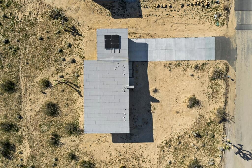 RARE butterfly-roof modern home with incredible UNOBSTRUCTED views of Joshua Tree National Park from all interior living spaces and bedrooms! This striking desert retreat blends modern architecture with tranquil surroundings, featuring open-concept living, polished concrete floors throughout, and zoned heating and cooling for both bedrooms and the main living area for maximum efficiency. The chef's kitchen is both stylish and functional with quartz countertops, dramatic backsplash, pendant lighting, floor-to-ceiling pantry storage, and a central island perfect for entertaining or quiet evenings at home. The thoughtful split-bedroom layout offers a generously sized bedroom on each side of the home, creating privacy and peaceful retreats after a day of desert exploration. An extended south-facing covered porch spans the entire back of the home, complete with ceiling fans and an exterior shower--ideal for cooling off while enjoying sweeping wilderness views and exceptional privacy. Additional highlights include natural gas (not propane), fully paid solar (6 panels), Santa Barbara smooth stucco, paved road access, concrete driveway, 2-car carport with EV charging, and an end-of-road location with no neighbors on one side or behind. Located just minutes from downtown Joshua Tree dining, shopping, and the farmers market, and a short drive to the National Park entrance, this home places you at the heart of one of Southern California's most iconic destinations--perfect for hiking, climbing, stargazing, and enjoying the vibrant local arts scene. A truly special Joshua Tree oasis.