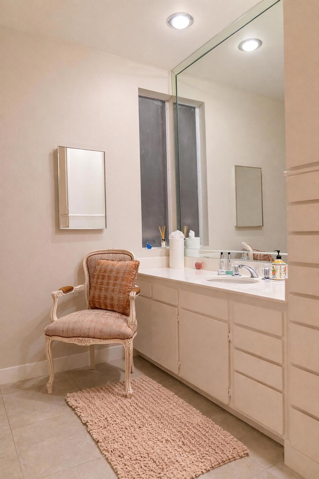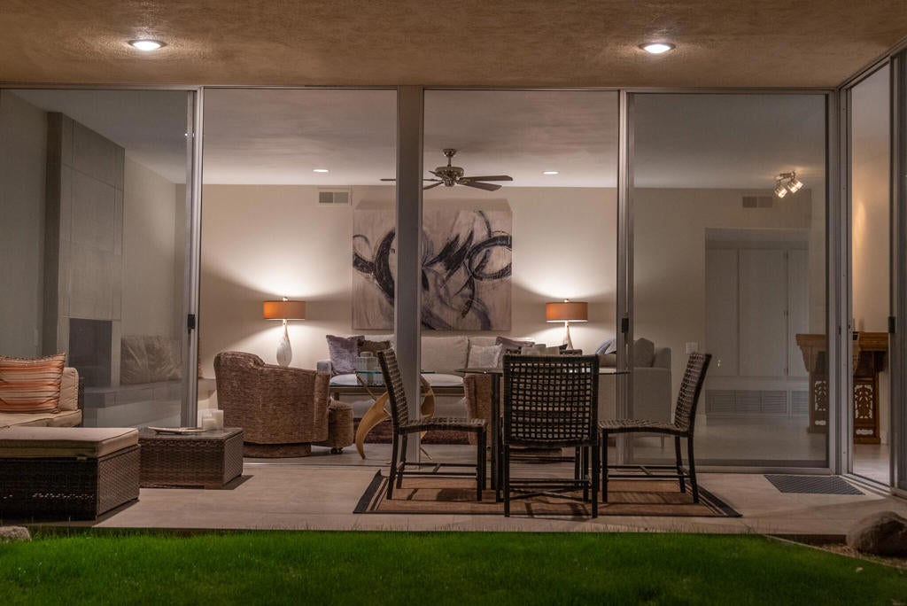 Expansive Double-Fairway Living at Seven Lakes Golf and Country Club!Enjoy sweeping, linear views this downstairs, corner 2-bedroom, 3-bath residence featuring a rare and highly desirable floor plan. Thoughtfully remodeled by a respected local designer, the home blends classic mid-century architecture with refined modern updates. Spanning approximately 2,276 sq ft, the home offers generous room sizes, high ceilings, and walls of floor-to-ceiling glass that frame expansive panoramic golf course views. The large living room is anchored by a custom fireplace, creating a warm focal point for entertaining or relaxing, while seamlessly connecting to the surrounding outdoor spaces.The home features three private outdoor areas, including a large, walled private courtyard ideal for al fresco dining or lounging, plus two private terraces overlooking the fairway, perfect for morning coffee or sunset gatherings.The remodeled kitchen showcases dual-tone cabinetry, stainless steel appliances, and wraparound quartz countertops, flowing into an expansive dining area designed for hosting with ease. Additional highlights include a private one-car garage, excellent separation of spaces, and abundant natural light throughout.Originally designed by noted architect Richard Harrison, this exceptional residence is just steps from the community's largest swimming pool and spa, as well as the pickleball and tennis courts, offering true resort-style living.Seven Lakes is a low-density, social, 24-hour guard-gated community renowned for its amenities, including 15 seasonally heated pools and spas, pickleball and tennis court, electric car charging stations, and a striking clubhouse designed by William Cody with soaring ceilings, a private restaurant and bar, and a superb chef. Golf enthusiasts will appreciate the Ted Robinson-designed course--by Ted Robinson--famously associated with Dwight D. Eisenhower's hole-in-one.A rare opportunity to own a move-in-ready, architecturally significant home with a fireplace-centered living room, expansive views, and exceptional indoor-outdoor living in one of Palm Springs' most iconic communities.