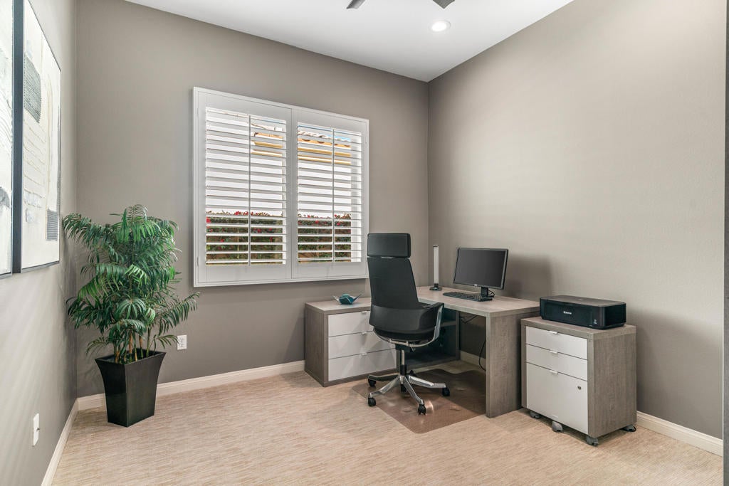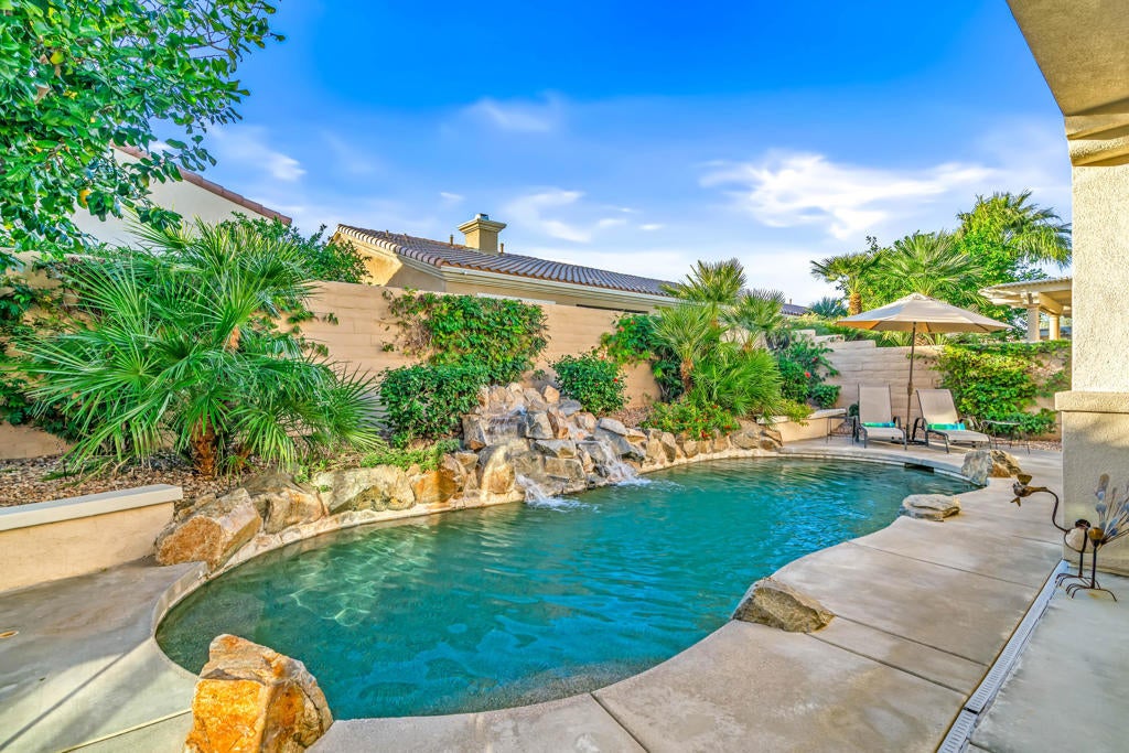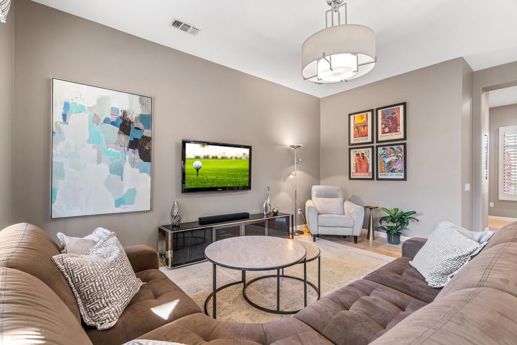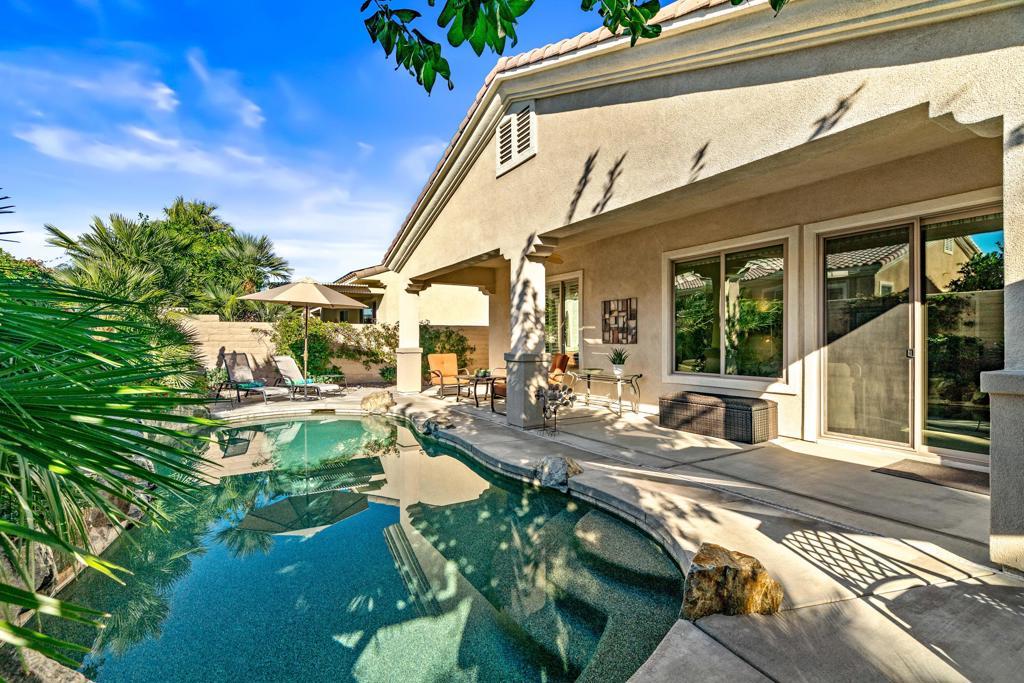 EXCEPTIONAL DESERT ELEGANCE AND REFINED COMFORT await you in the highly sought after AVALINO MODEL, offered within the guard gated 55+ community of Sun City Shadow Hills. Homes of this caliber and presentation rarely come to Market! Offered TURNKEY FURNISHED, this beautifully curated residence showcases a warm sophisticated design with an open floor plan, ideal for both everyday living and effortless entertaining. Enter from a beautifully landscaped walkway into a bright and welcoming great room, where soft designer tones, recessed lighting, upgraded shutters and tailored blinds create an atmosphere of quiet luxury! The open concept layout flows gracefully into the heart of the home! The Chefs Kitchen is designed with rich maple cabinetry, granite slab counter tops, breakfast bar seating, convection oven, dining area and walk in pantry. A generous island anchors the space while framing the captivating views of the sparking pool and freshly glazed cascading water feature, allowing loads of natural light to fill the home creating a seamless connection to the outdoors. The main living space opens beautifully to the covered patio delivering a true indoor- outdoor lifestyle. The west facing backyard is a private resort style retreat, featuring upgraded landscaping, an extended patio cover with the added value of solar screens for the warmer months, all surrounding a stunning waterfall enhanced pool! Perfect for lounging, entertaining or simply enjoying tranquil Desert sunsets. The PRIMARY SUITE is a serene retreat retreat offering both comfort and sophistication. Wake up to gentle morning light and calming pool views, then unwind in the spa inspired ensuite featuring dual vanities, a large walk in closet and a private water closet for both privacy and functionality. Every detail has been thoughtfully selected to evoke a sense of relaxed refinement. The Guest Bedroom and full bathroom in addition to the versatile FLEX Room create a private guest wing. The Flex rooms easily adapts as a third bedroom, home office or studio; Perfect for dual purpose living. Ideal for hosting guests! Completing the home is a nicely sized Laundry Room with direct access to an oversized garage with generous space for vehicles and storage, adding everyday convenience to this exceptional residence. LOVE YOUR LIFE in Sun City Shadow Hills with championship golf, fitness centers, swimming and a full calendar of clubs and social activities to keep you ACTIVE, CONNECTED and INSPIRED!!