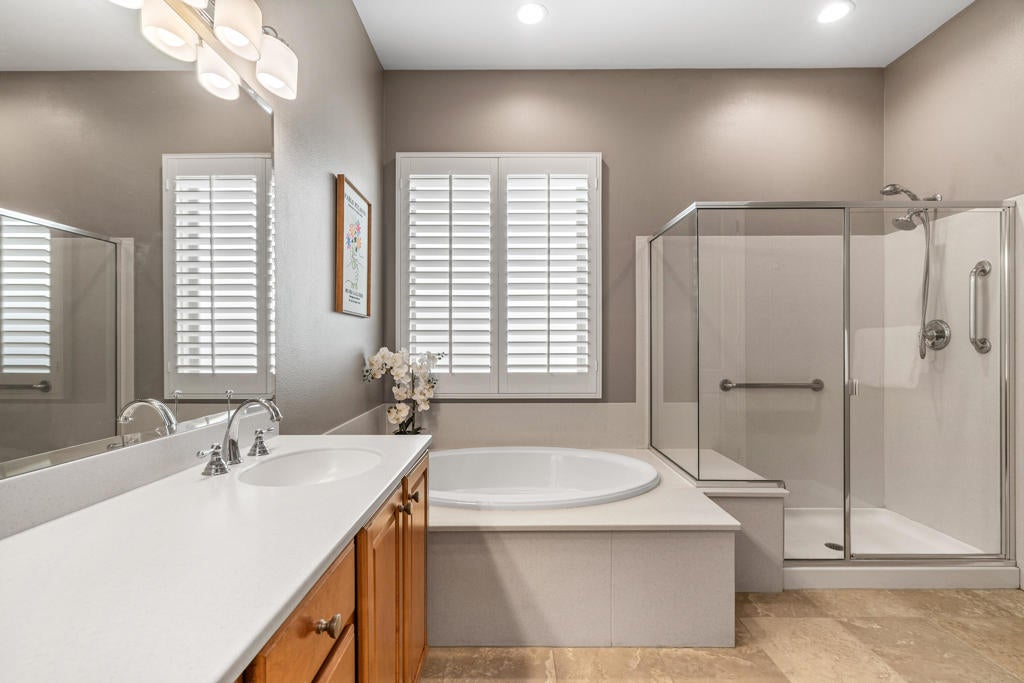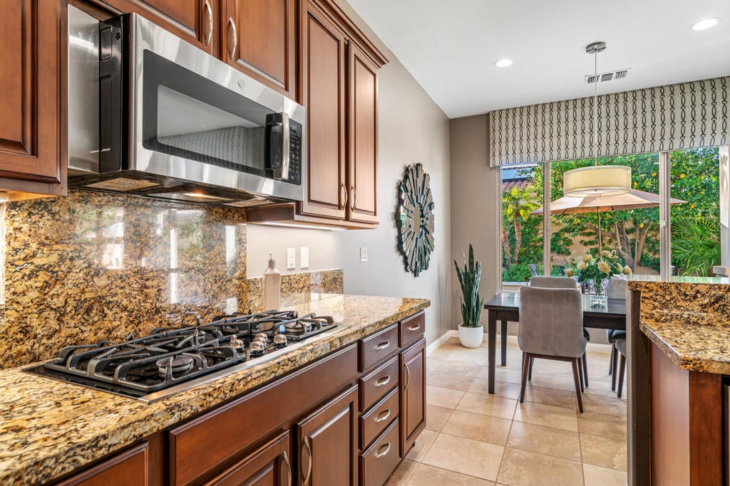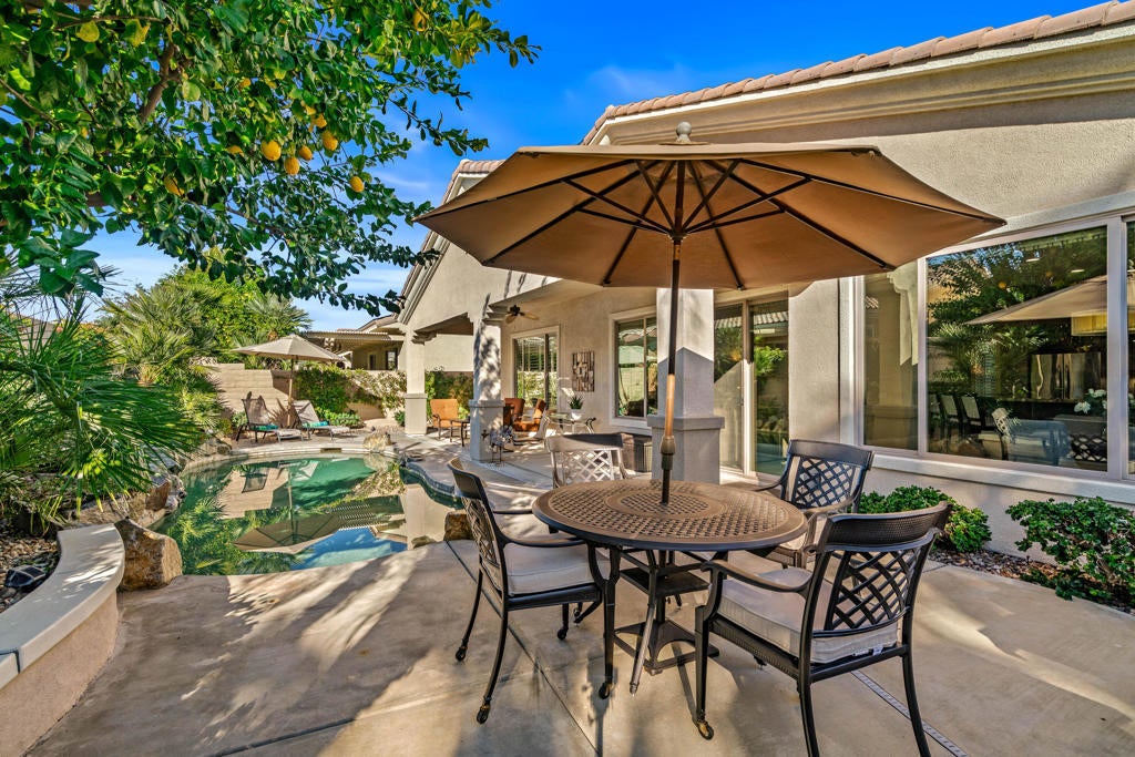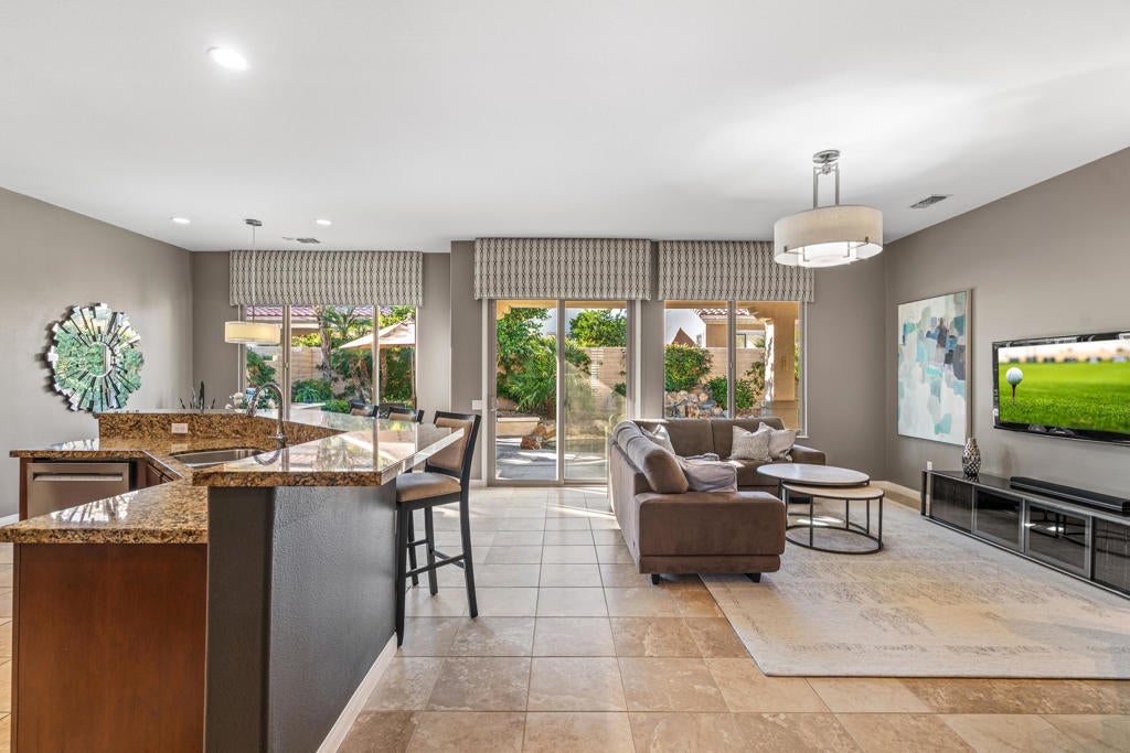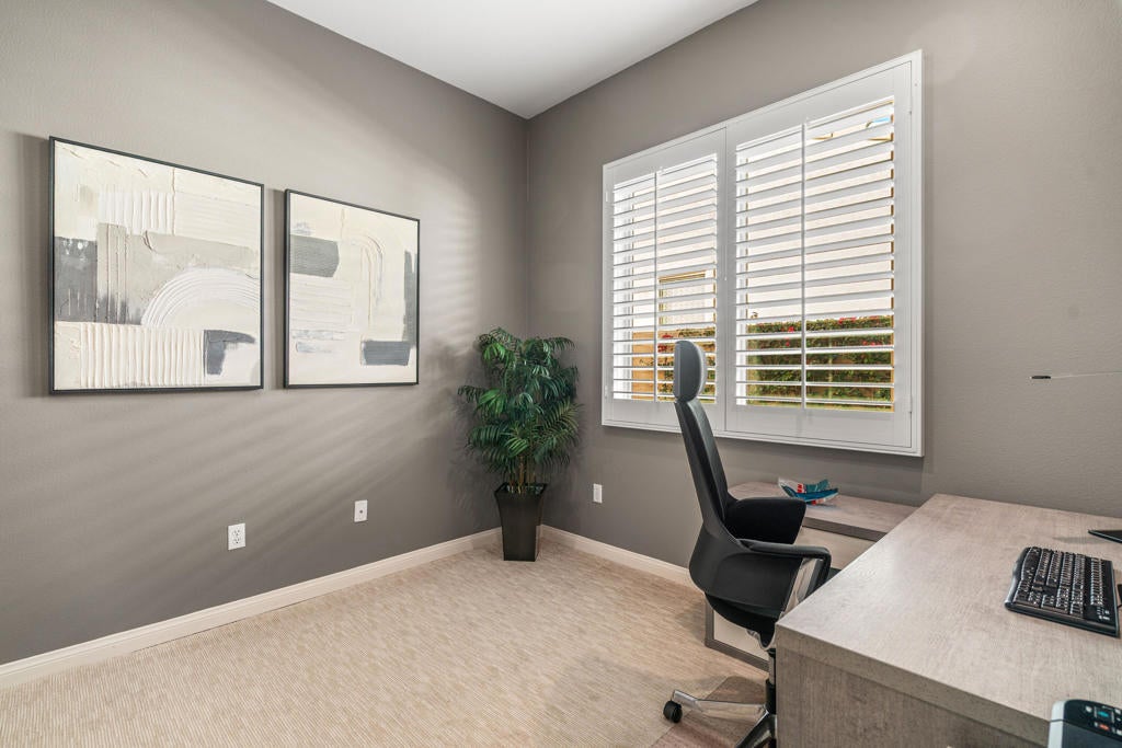 EXCEPTIONAL DESERT ELEGANCE AND REFINED COMFORT await you in the highly sought after AVALINO MODEL, offered within the guard gated 55+ community of Sun City Shadow Hills. Homes of this caliber and presentation rarely come to Market! Offered TURNKEY FURNISHED, this beautifully curated residence showcases a warm sophisticated design with an open floor plan, ideal for both everyday living and effortless entertaining. Enter from a beautifully landscaped walkway into a bright and welcoming great room, where soft designer tones, recessed lighting, upgraded shutters and tailored blinds create an atmosphere of quiet luxury! The open concept layout flows gracefully into the heart of the home! The Chefs Kitchen is designed with rich maple cabinetry, granite slab counter tops, breakfast bar seating, convection oven, dining area and walk in pantry. A generous island anchors the space while framing the captivating views of the sparking pool and freshly glazed cascading water feature, allowing loads of natural light to fill the home creating a seamless connection to the outdoors. The main living space opens beautifully to the covered patio delivering a true indoor- outdoor lifestyle. The west facing backyard is a private resort style retreat, featuring upgraded landscaping, an extended patio cover with the added value of solar screens for the warmer months, all surrounding a stunning waterfall enhanced pool! Perfect for lounging, entertaining or simply enjoying tranquil Desert sunsets. The PRIMARY SUITE is a serene retreat retreat offering both comfort and sophistication. Wake up to gentle morning light and calming pool views, then unwind in the spa inspired ensuite featuring dual vanities, a large walk in closet and a private water closet for both privacy and functionality. Every detail has been thoughtfully selected to evoke a sense of relaxed refinement. The Guest Bedroom and full bathroom in addition to the versatile FLEX Room create a private guest wing. The Flex rooms easily adapts as a third bedroom, home office or studio; Perfect for dual purpose living. Ideal for hosting guests! Completing the home is a nicely sized Laundry Room with direct access to an oversized garage with generous space for vehicles and storage, adding everyday convenience to this exceptional residence. LOVE YOUR LIFE in Sun City Shadow Hills with championship golf, fitness centers, swimming and a full calendar of clubs and social activities to keep you ACTIVE, CONNECTED and INSPIRED!!