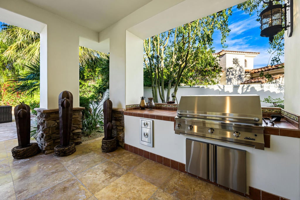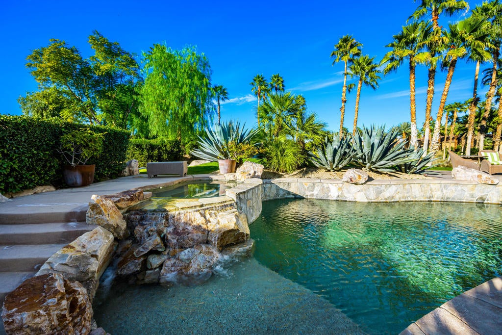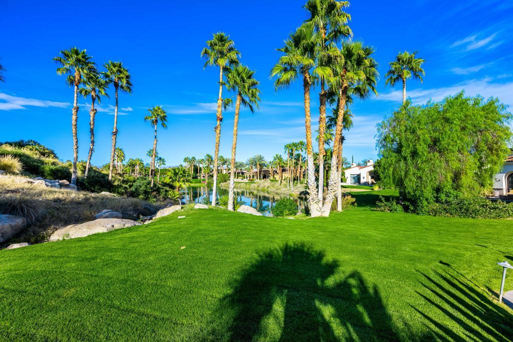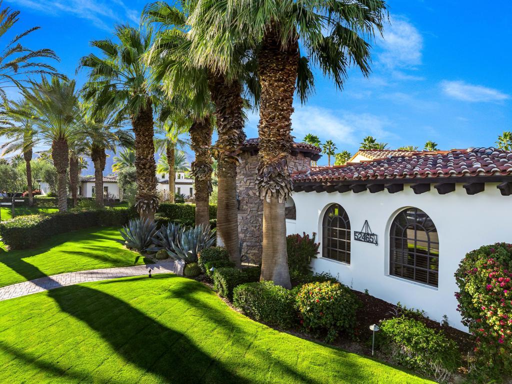 Custom Estate home, situated on a spacious corner lot in the exclusive Hideaway Golf Club in La Quinta! This impressive four bedroom, four bath plus two half-bath home, boasts a magical blend of luxury and comfort. Enter through a welcoming private courtyard with a fireplace, into an imposing great room, that features endless windows framing breathtaking lake and waterfall VIEWS! There is also an temperature-controlled wine room, conveniently located in the graceful dining room, perfect for elegant entertaining. The luxurious primary suite is a tranquil refuge, complete with spa-like bath, and two fireplaces. Further, there are three inviting guest suites, + two half-baths. Additionally there is a functional home office (was originally the third garage, but could be converted back). The backyard is an idyllic haven, featuring a beautiful view of the waterfall and lake, yet offering privacy & tranquility. The entertainment area features an inviting fire pit, living area, dining area, a professional-grade grill station and outdoor heaters ... ideal for our enviable indoor outdoor desert lifestyle! This exceptional home is resplendent with oversized rooms, high ceilings, conscientiously chosen amenities, and exudes a captivating mix of warmth, sophistication and privacy.