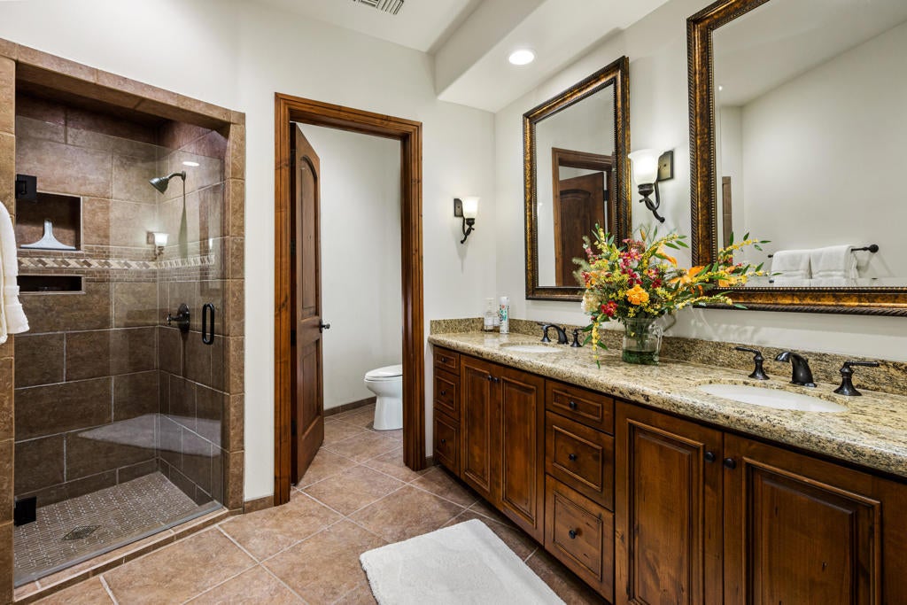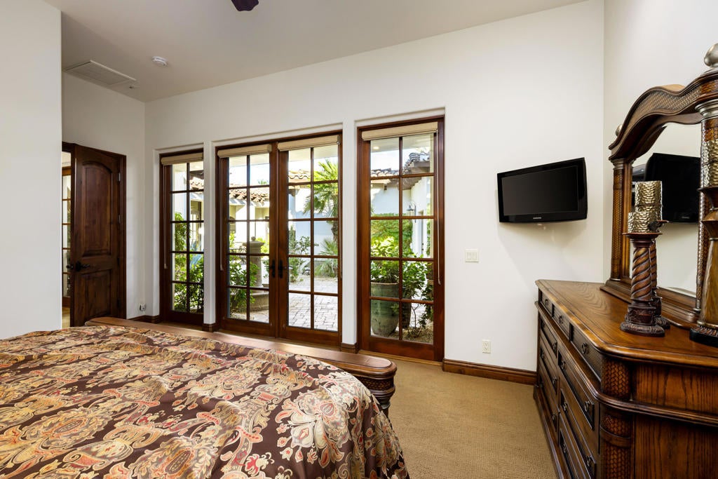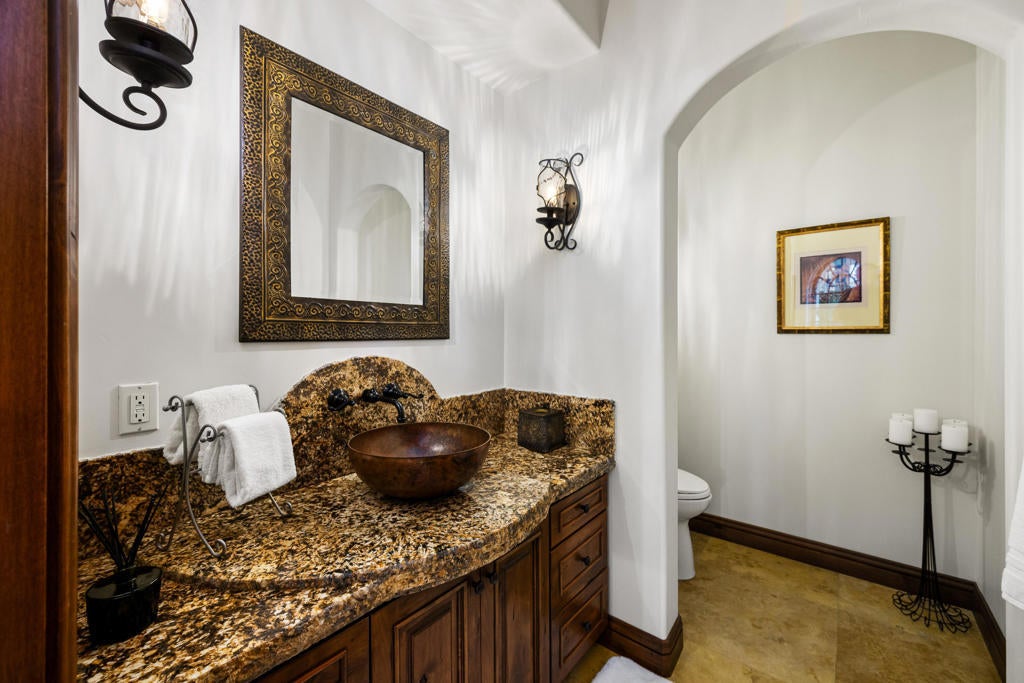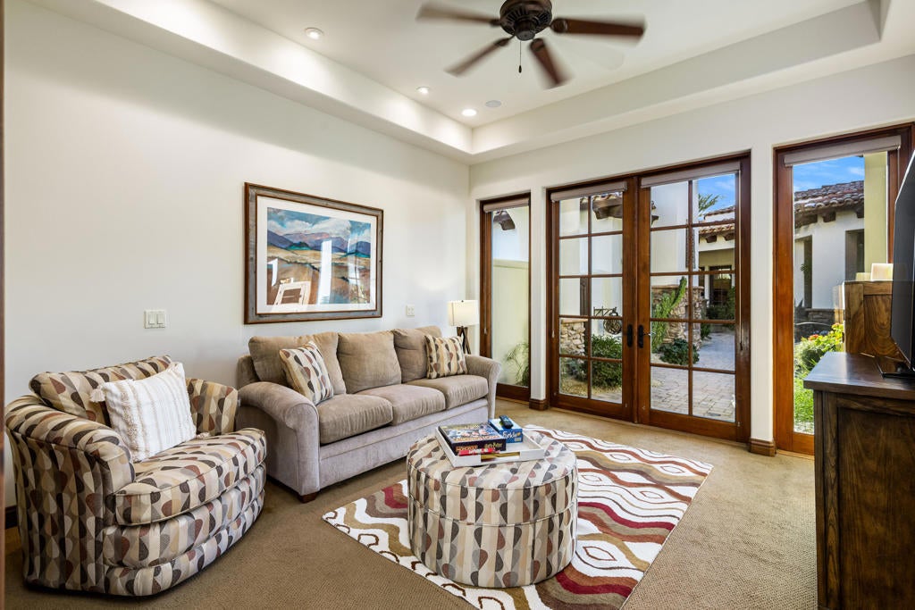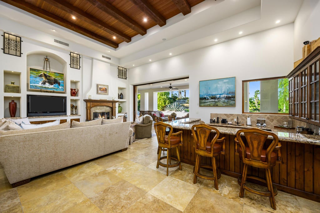 Custom Estate home, situated on a spacious corner lot in the exclusive Hideaway Golf Club in La Quinta! This impressive four bedroom, four bath plus two half-bath home, boasts a magical blend of luxury and comfort. Enter through a welcoming private courtyard with a fireplace, into an imposing great room, that features endless windows framing breathtaking lake and waterfall VIEWS! There is also an temperature-controlled wine room, conveniently located in the graceful dining room, perfect for elegant entertaining. The luxurious primary suite is a tranquil refuge, complete with spa-like bath, and two fireplaces. Further, there are three inviting guest suites, + two half-baths. Additionally there is a functional home office (was originally the third garage, but could be converted back). The backyard is an idyllic haven, featuring a beautiful view of the waterfall and lake, yet offering privacy & tranquility. The entertainment area features an inviting fire pit, living area, dining area, a professional-grade grill station and outdoor heaters ... ideal for our enviable indoor outdoor desert lifestyle! This exceptional home is resplendent with oversized rooms, high ceilings, conscientiously chosen amenities, and exudes a captivating mix of warmth, sophistication and privacy.