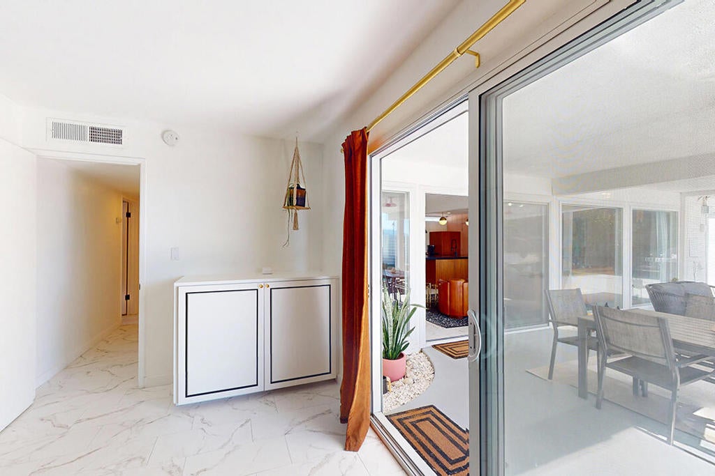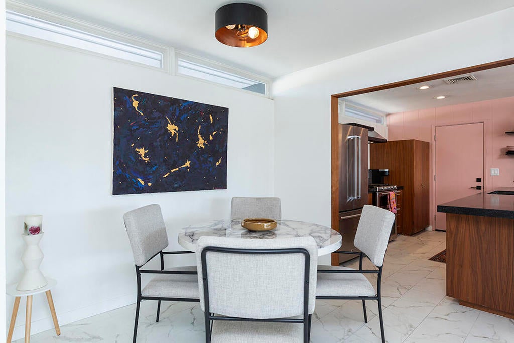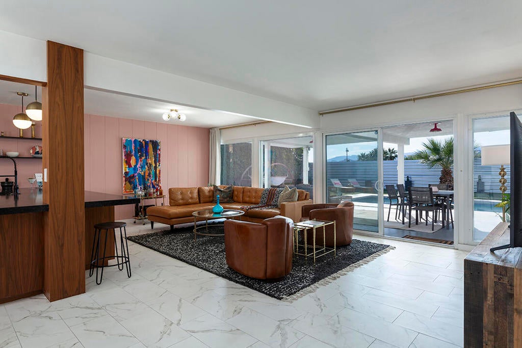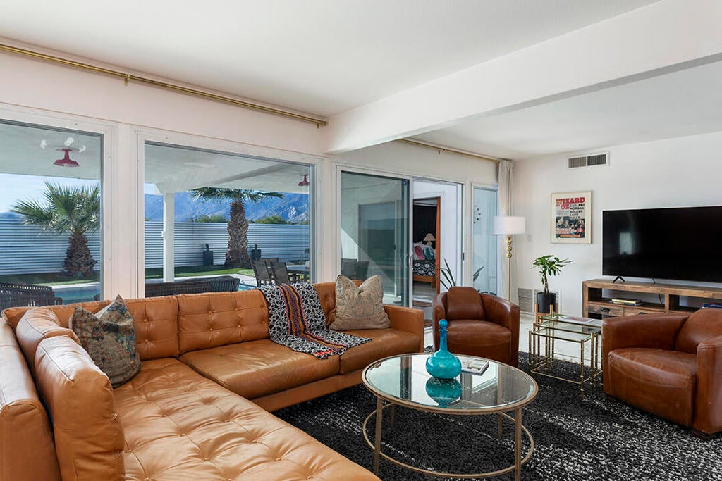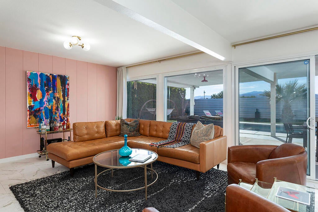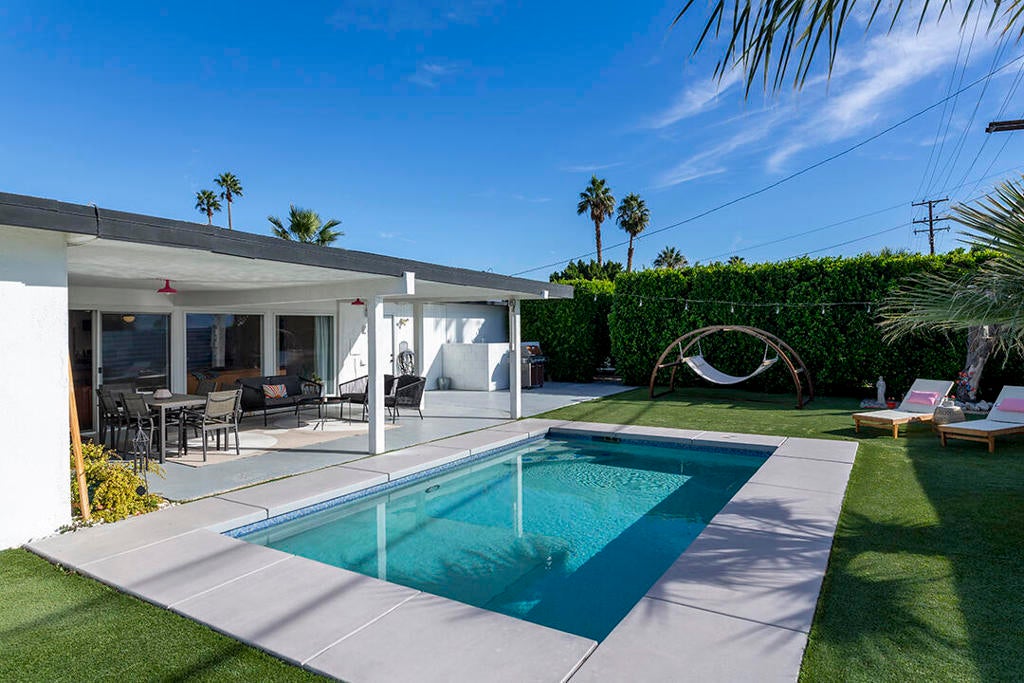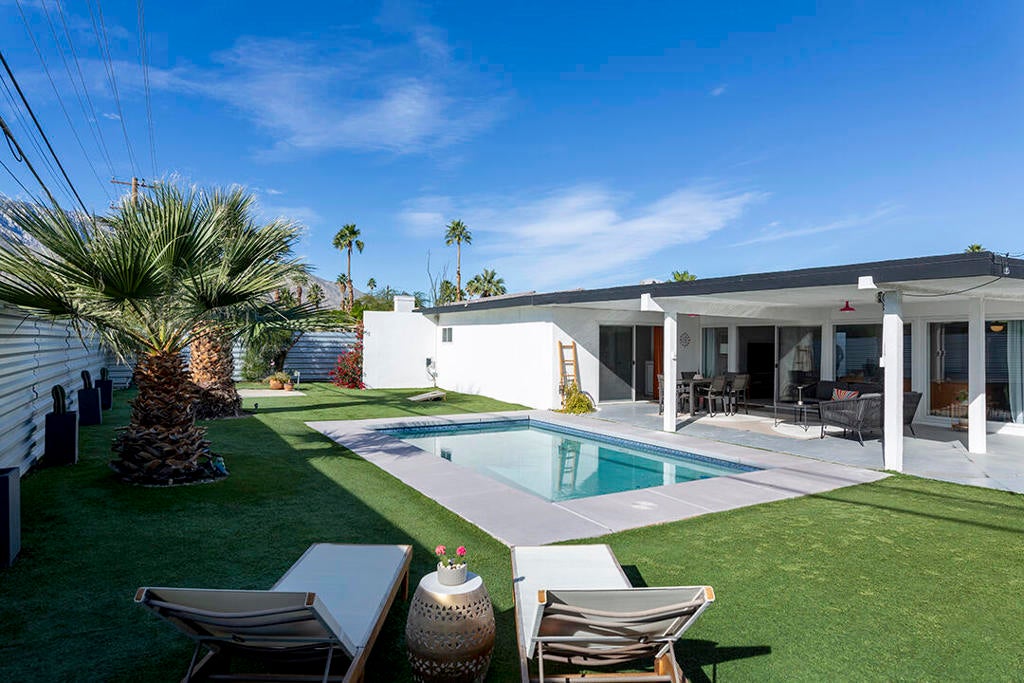 Designed by Hugh Kaptur, AIA, this mid-century modern home in Palm Springs' Desert Park Estates neighborhood reflects Kaptur's enduring design philosophy of clean lines, post-and-beam construction, and a strong connection to nature. Extensively updated in 2018, the home was modernized for everyday livability while preserving its architectural integrity. Improvements abound, even those you wouldn't immediately notice, like added insulation to the roof, commercial-grade dual-pane windows for sound deadening and energy efficiency, and an owned solar system.Located on a corner lot, this classic home's appealing low-profile elevation and iconic breeze-block screening wall lead to its double-door entry. Inside, ceramic tile with a mable matte finish extend throughout the open floor plan, which includes the living room, front dining area, and a beautifully updated open-concept kitchen. From this seamless entertaining area, windows and sliding glass doors provide an effortless indoor-outdoor connection to the covered rear patio and backyard while allowing abundant natural light to fill the space. The private, resort-style backyard features panoramic southern mountain views, low-maintenance artificial turf, desert landscaping, and a refreshed saltwater pool with newer equipment installed in 2023.Interior upgrades include a well-appointed kitchen with dark Slatestone countertops, rich walnut cabinetry, prep island with ample storage, and a suite of stainless steel appliances. The 1,488 sq ft layout offers three bedrooms and two updated bathrooms. The two stylish guest bedrooms share a hallway bath with playful vintage character, highlighted by a clawfoot tub and flamingo wallpaper. The generous primary suite provides direct pool access via sliding doors, abundant built-in storage, and a well-designed bath with a large vanity and step-in shower. Variable speed pool pump and chlorinator installed 2023 | Salt water pool Water heater installed 2024 Updated windows and doors throughout - commercial grade, double paned RV parking on east side of home Hot water tank | 2024 Household gas supplies replaced (pool line remained - no issues) | 2025