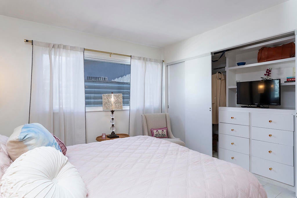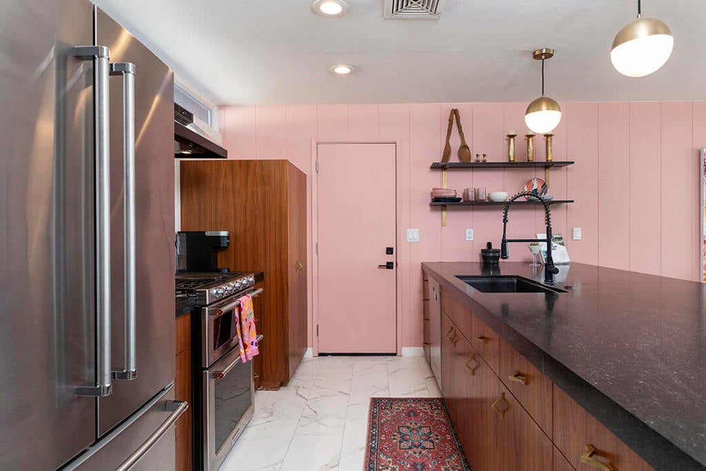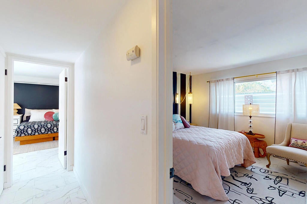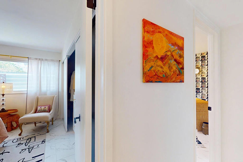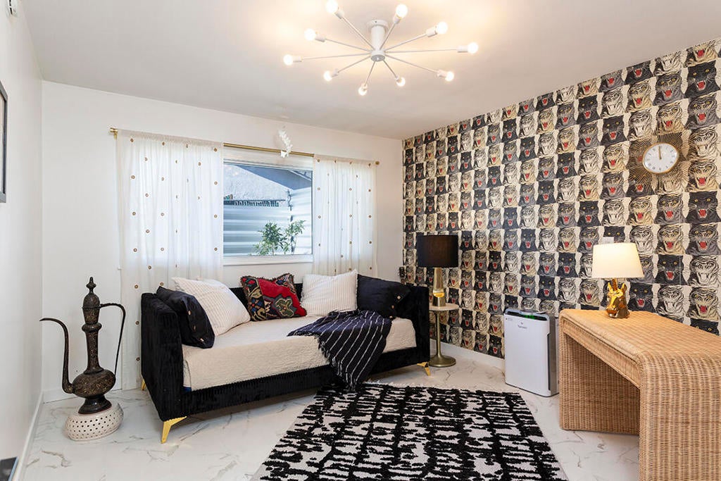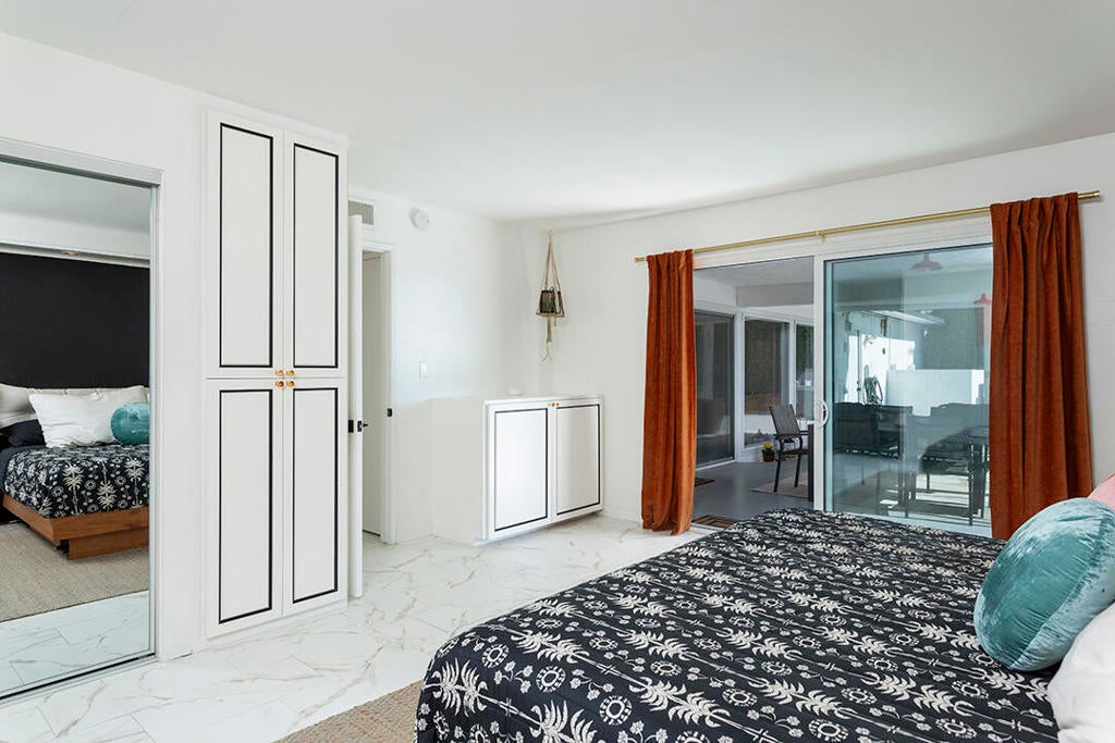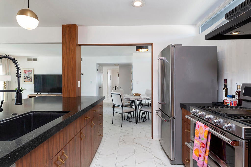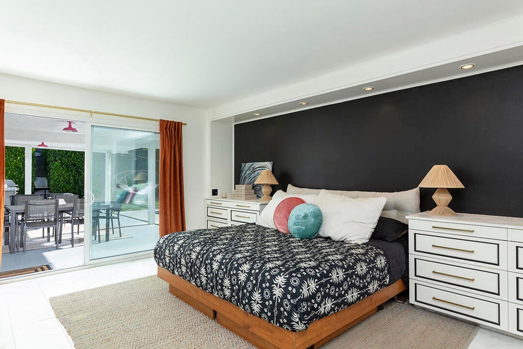 Designed by Hugh Kaptur, AIA, this mid-century modern home in Palm Springs' Desert Park Estates neighborhood reflects Kaptur's enduring design philosophy of clean lines, post-and-beam construction, and a strong connection to nature. Extensively updated in 2018, the home was modernized for everyday livability while preserving its architectural integrity. Improvements abound, even those you wouldn't immediately notice, like added insulation to the roof, commercial-grade dual-pane windows for sound deadening and energy efficiency, and an owned solar system.Located on a corner lot, this classic home's appealing low-profile elevation and iconic breeze-block screening wall lead to its double-door entry. Inside, ceramic tile with a mable matte finish extend throughout the open floor plan, which includes the living room, front dining area, and a beautifully updated open-concept kitchen. From this seamless entertaining area, windows and sliding glass doors provide an effortless indoor-outdoor connection to the covered rear patio and backyard while allowing abundant natural light to fill the space. The private, resort-style backyard features panoramic southern mountain views, low-maintenance artificial turf, desert landscaping, and a refreshed saltwater pool with newer equipment installed in 2023.Interior upgrades include a well-appointed kitchen with dark Slatestone countertops, rich walnut cabinetry, prep island with ample storage, and a suite of stainless steel appliances. The 1,488 sq ft layout offers three bedrooms and two updated bathrooms. The two stylish guest bedrooms share a hallway bath with playful vintage character, highlighted by a clawfoot tub and flamingo wallpaper. The generous primary suite provides direct pool access via sliding doors, abundant built-in storage, and a well-designed bath with a large vanity and step-in shower. Variable speed pool pump and chlorinator installed 2023 | Salt water pool Water heater installed 2024 Updated windows and doors throughout - commercial grade, double paned RV parking on east side of home Hot water tank | 2024 Household gas supplies replaced (pool line remained - no issues) | 2025