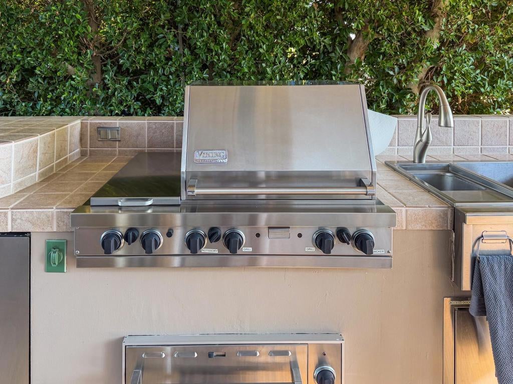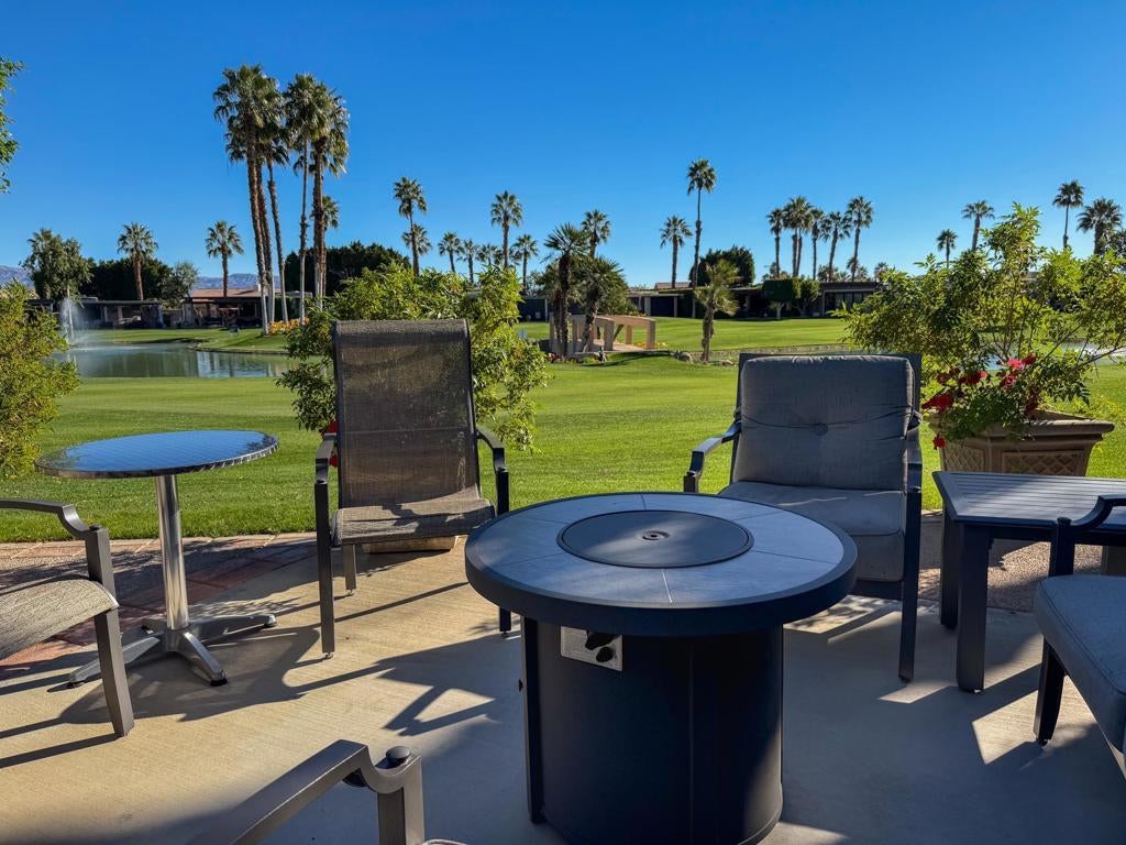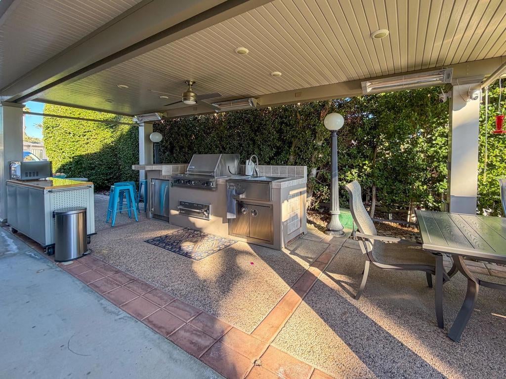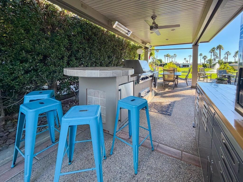 RV Lot #220 at Outdoor Resort Indio offers comfortable outdoor living with scenic views and a prime location near resort amenities. The Alumawood pergola features a solid roof, three radiant heaters, one ceiling fan, and two manual shades, creating a welcoming space for relaxing or entertaining.The outdoor kitchen is well equipped with a Viking grill with two-burner cooktop, Viking warming drawer, under-counter refrigerator, microwave, stainless sink with hot water, and a convenient rolling cart/island. The lot is nicely furnished with Sunvilla seating, including two cushioned chairs, a loveseat, fire table, end table, and a dining table with seating for six. Two storage boxes add practical convenience.Enjoy a beautiful morning view of the golf course, lake, fountains, and bridge, all while being just a short distance from the clubhouse, pool, ballroom, tennis, and pickleball courts. RV Lot 220 combines views, upgrades, and proximity to amenities for easy, enjoyable resort living.Outdoor Resort Indio is a class A RV resort.