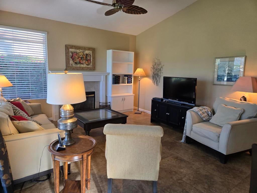 YOU OWN THE LAND! Model Row Home! One of the best view locations at The Desert Princess. This Augusta floor plan, offers two master bedroom suites with ample walk-in closets, and bonus room. All Wood style laminate flooring. Stunning views of the fairway, green and water of the second hole of the Cielo golf course. Wide-open views of the majestic San Jacinto mountain range. Large patio, perfect for entertaining, barbecuing and sunning with the very popular south-western exposure. The kitchen has walk-in pantry and extra cabinets, has the feel of a Great Room and is perfect for social gatherings with its over-sized counter space and bar stool seating. HVAC replaced in 2020, Newer dishwasher, Maytag washer 2024, mister on patio. Outside of home painted in 2020. HOA dues include: 2 DVR or HD cable boxes and service, high-speed internet, grounds maintained to your door by HOA maintenance crews, outside pest control when requested, and outside water. Gated community with 24-hour guarded gate access and regular patrols for added safety and security, health and fitness center membership, tennis, bocce ball, and pickleball courts. Discounts and preferred tee-times for owners at the Desert Princess 27-hole PGA Championship golf course, no initiation fees, rated among the best in the valley by Golf Digest. Don't miss the opportunity to live in luxury with every modern comfort at your fingertips.