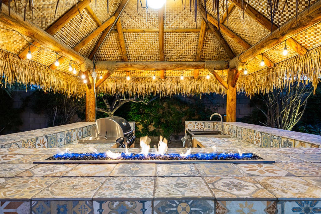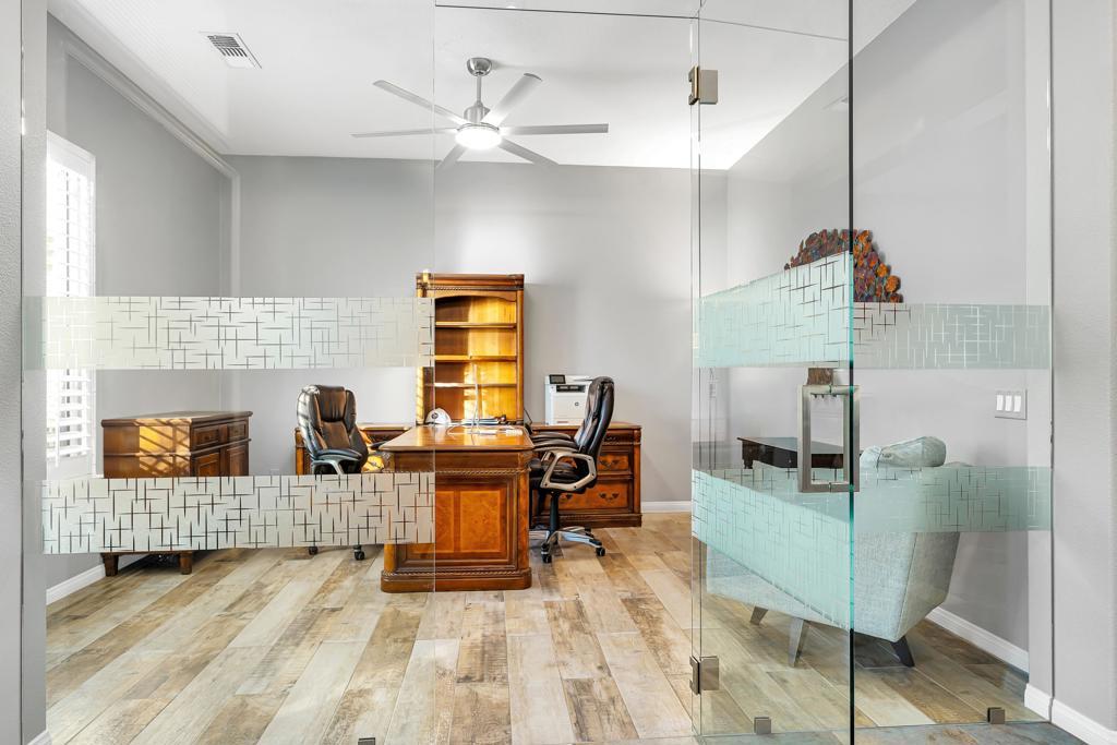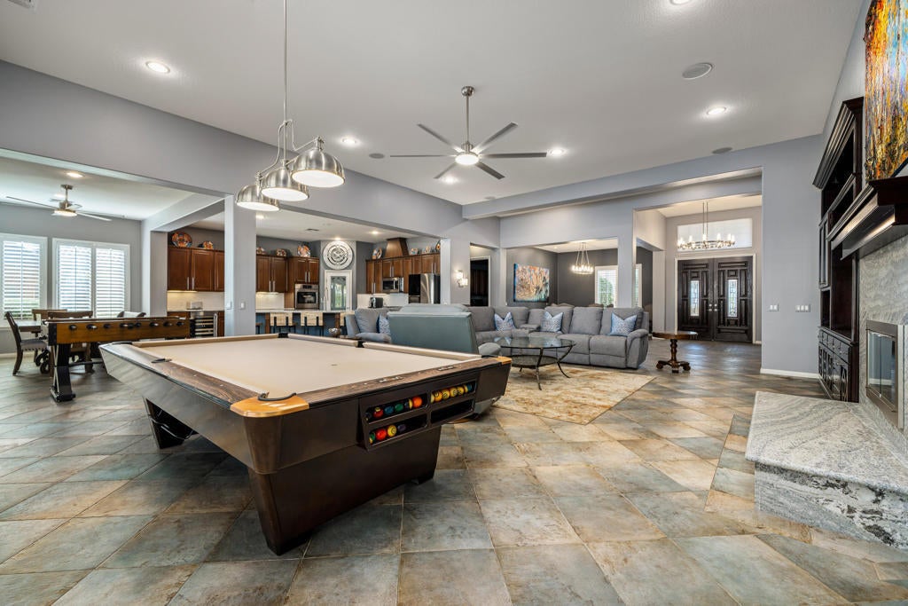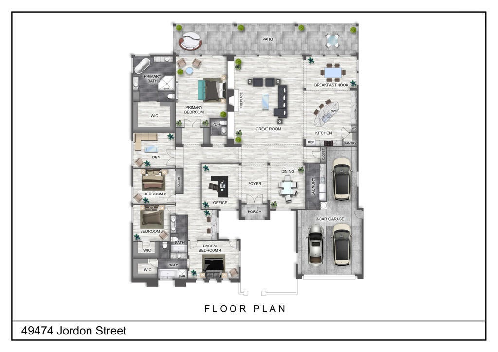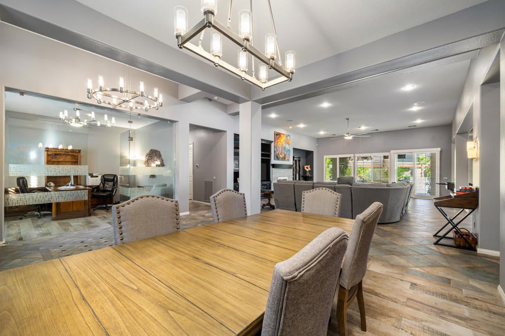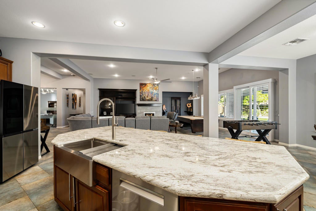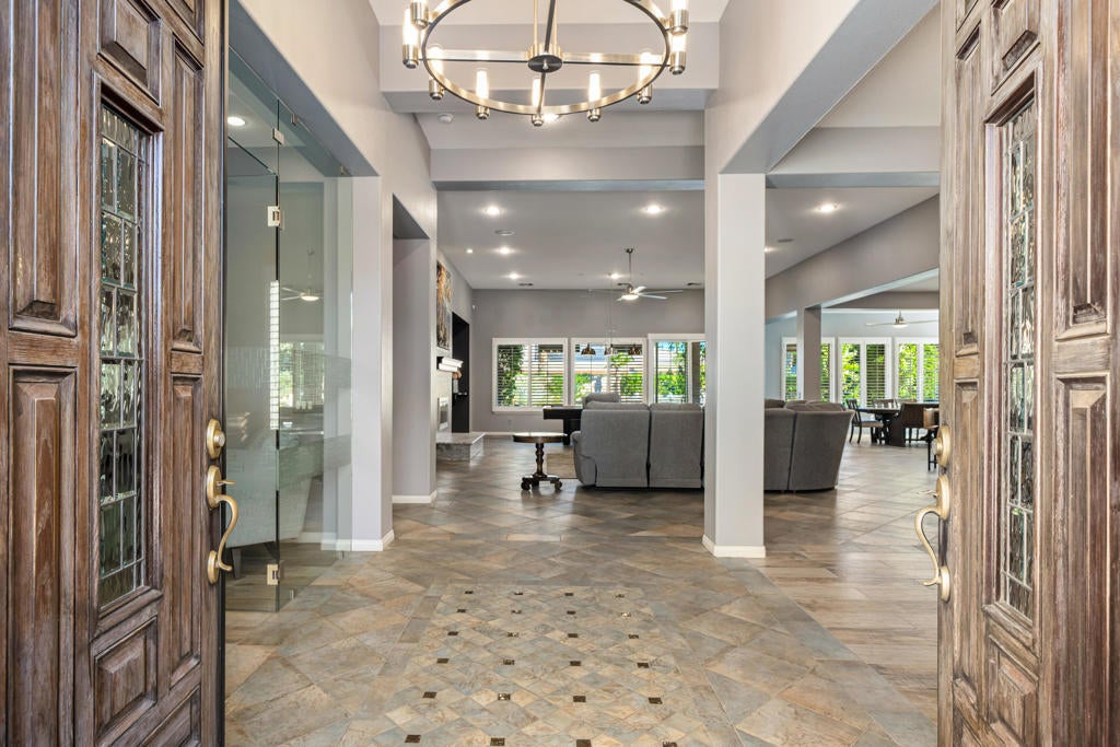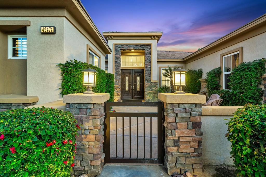 Desert River Estates | Furnished | Casita | Half-Acre Corner Lot | Resort-Style Backyard | La Quinta / Indio BorderLocated in Desert River Estates, a private enclave on the border of La Quinta and Indio, this extensively upgraded residence sits on an approximately half-acre corner lot and offers refined indoor-outdoor desert living with a warm, inviting atmosphere.Spanning approximately 4,056 square feet, the home is offered furnished and includes four bedrooms, including an attached casita, a den, and three and a half bathrooms. The casita features both a private entrance and direct access to the main home, providing flexible use for a variety of living arrangements.The backyard is designed for resort-style living, featuring a saltwater pool and spa with updated equipment, water features, raised seating areas, and a private outdoor sauna. A newly added palapa enhances the outdoor kitchen, while a covered patio with misters, patio heaters, and an 85-inch motorized hideaway television creates a comfortable setting for outdoor living and entertaining. A newly added handrail provides convenient access to the pool area.Inside, 12-foot ceilings and an open-concept layout create a bright and welcoming environment. The great room offers custom built-ins, a fireplace, surround sound, and an adjacent game area. The remodeled kitchen is equipped with Bosch appliances, a Samsung refrigerator, and multiple dining areas, including a breakfast space and formal dining room. A glass-enclosed office near the entry provides a functional and private workspace.The primary suite opens directly to the backyard and features a remodeled bathroom and an oversized closet. Additional upgrades include new flooring in all bedrooms and closets, interior shutters, updated lighting and ceiling fans, two new air conditioning systems, an instant hot water heater, and a whole-home water softening and filtration system.Located near golf, dining, shopping, and major Coachella Valley amenities, this home offers a combination of space, upgrades, and location within Desert River Estates, one of the area's most desirable residential communities.
