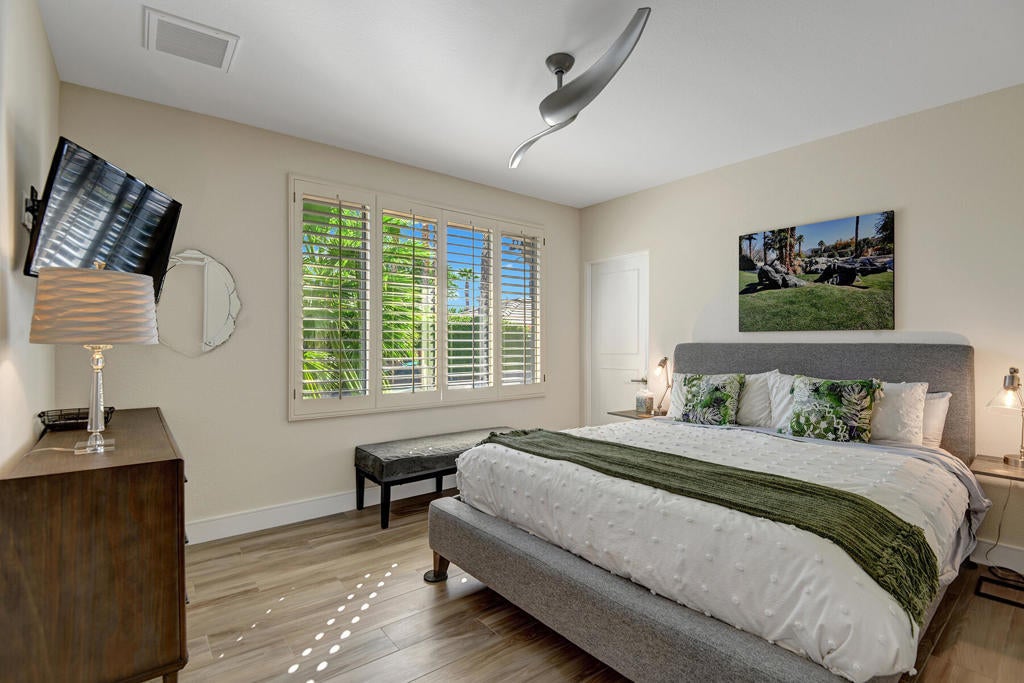 Stunning Acacia 4 - Completely Remodeled on a Rare Oversized Lot in Indian Ridge Country Club in Palm Desert! Step into luxury with this beautifully reimagined Acacia 4, where no detail has been overlooked. Situated on an expansive lot, this home offers an inviting front courtyard featuring a cozy fireplace, built-in BBQ, lush landscaping, and abundant southern sunshine--perfect for year-round outdoor living. Inside, every room has been meticulously updated with Italian wood-look porcelain tile, 6'' baseboards, LED and art lighting, fresh paint, and modernized hardware throughout. The spa-like bathrooms are a true standout, showcasing granite countertops, glass tile backsplashes, refinished cabinetry, frameless glass-enclosed showers with rainfall showerheads, and LED-lit mirrors. Beyond aesthetics, this home is packed with upgrades, including two newer A/C units with heat pump, a newer water heater, an electronic leak detection system, and 30 fully paid solar panels for energy efficiency. When you are tired of the sun, you can enjoy breathtaking views of the 4th hole of the Grove course from your covered back patio, with ample space to build a spa. This is desert living at its finest!Offered furnished per inventory list. Club and Golf Membership options available. Don't miss this exceptional opportunity--schedule your private showing today!