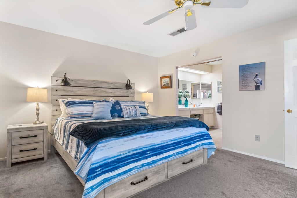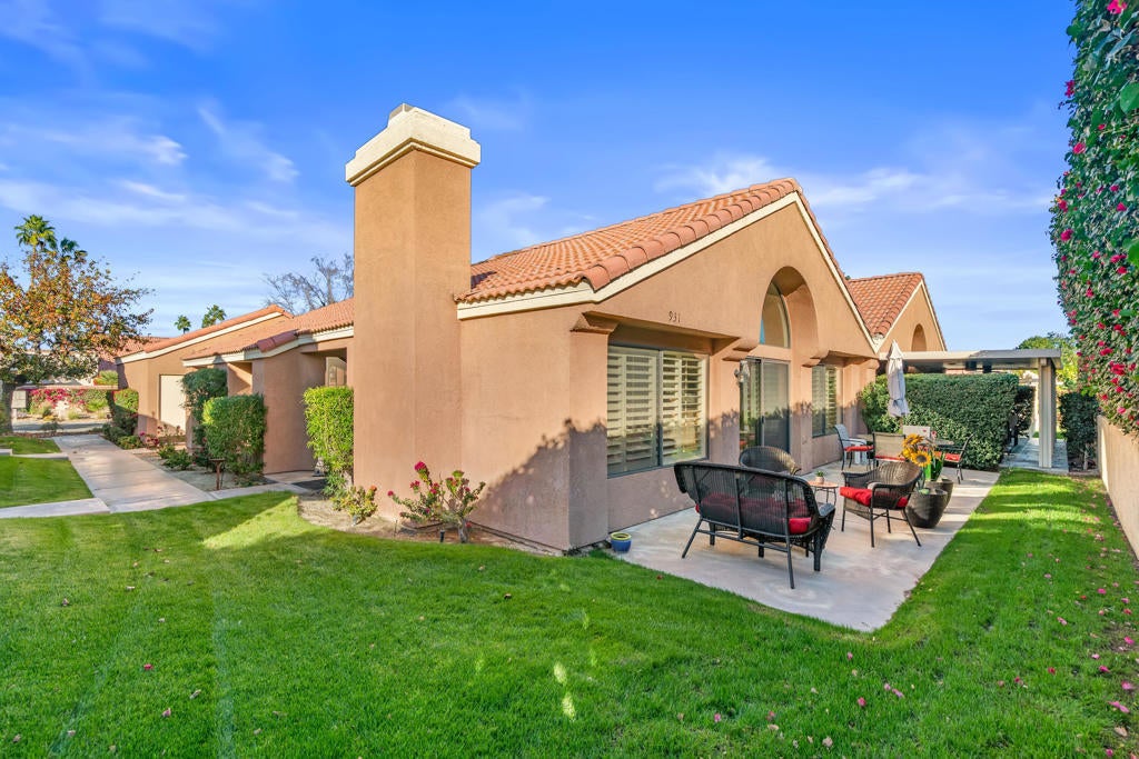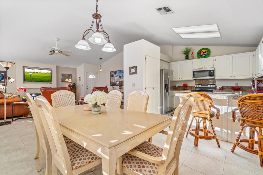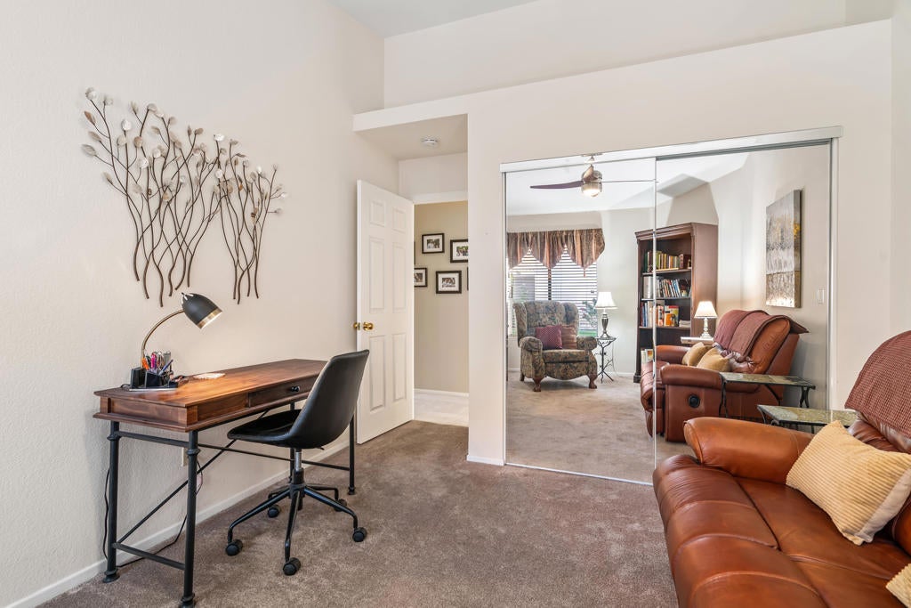 Looking for a desert home that truly fits your lifestyle? This inviting three-bedroom, two-bath residence is ideally situated within the interior of the Oasis Country Club, offering privacy, comfort, and an outstanding community. Vaulted ceilings create an immediate sense of openness, while tile flooring throughout the living room, dining area, kitchen, and hallways enhances the bright atmosphere.The kitchen is designed for both everyday living and entertaining, featuring bar seating and a pantry. The third bedroom, complete with a closet and window, is currently used as an office but easily functions as a true bedroom or den. The guest bedroom is generously sized, offers a walk-in closet, and provides direct access to the second full bath--ideal for visiting family and friends. The primary suite is a peaceful retreat with ample closet space and sliding doors that lead to a private courtyard patio, perfect for morning coffee or a secluded garden space. An attached garage provides room for your vehicle, the washer and dryer, and additional storage or a golf cart.Oasis Country Club is a member-owned community with an on-site HOA and an exceptional array of amenities, including 18 swimming pools and spas, an executive golf course with practice facilities, putting green, and an 18-hole putting course enjoyed by residents and guests alike. Additional offerings include tennis and pickleball courts, a clubhouse with formal dining and lounge, casual dining in the grill room, a pro shop, and a dedicated bark park. Mature landscaping and seasonal citrus trees further enhance the charm of the community.Conveniently located near major freeways, El Paseo, La Quinta, and everyday shopping, this clean and well-maintained home stands out with its flexible floor plan and desirable third bedroom. Opportunity is knocking--come experience the Oasis lifestyle for yourself.
