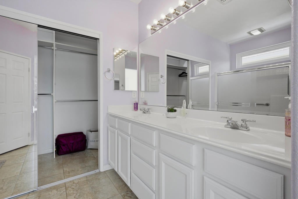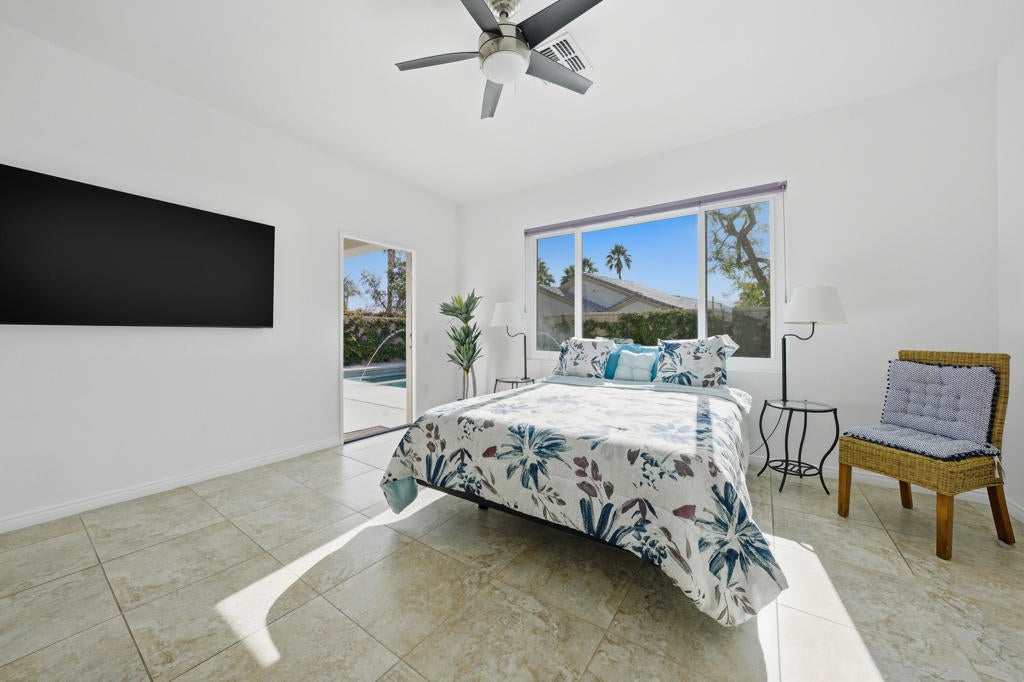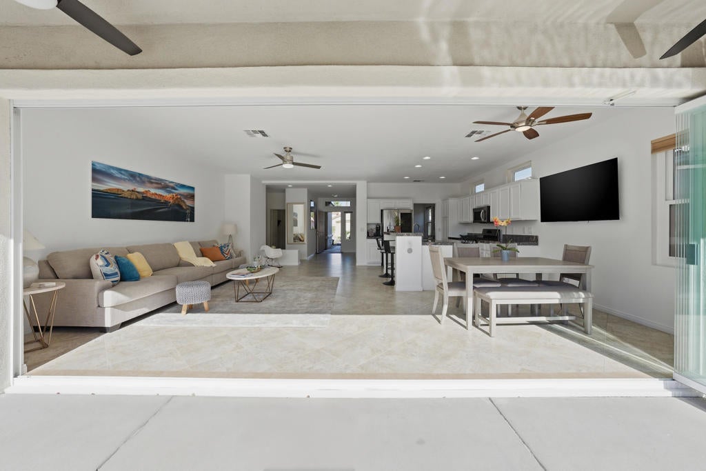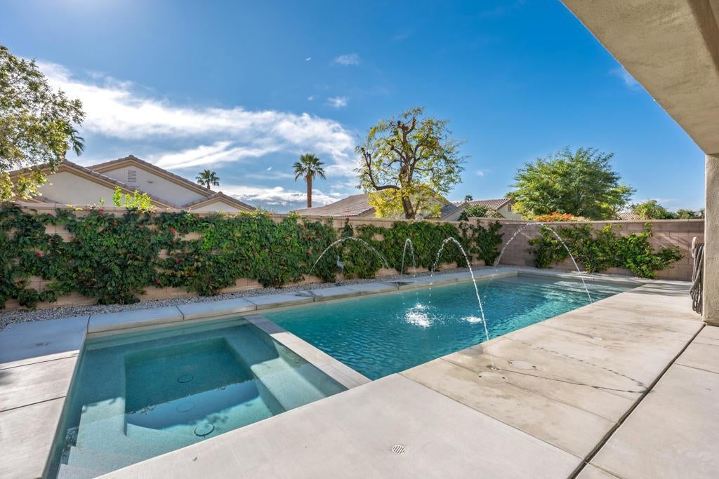 Sun City Palm Desert - Cayman. This popular greatroom home has been transformed into a private resort, featuring a stunning pebbletec pool and spa, a south facing rear yard with peekaboo mountain views, a spacious patio, and a folding glass panel wall that creates a seamless indoor-outdoor living experience. Upgraded windows, HVAC, and owned solar enhance comfort and efficiency. Inside, 20-inch tile flooring runs throughout the home--no carpeting. The upper portion of the wall between the greatroom and hallway has been removed, creating a more open, spacious feel. The kitchen is well appointed with granite countertops, stainless steel appliances, under-cabinet lighting, a chef's island, and a breakfast bar. Double pocket-doors off the greatroom open to a versatile den or office. The primary suite offers direct patio access and a walk-in closet with built-in storage. The en-suite bath includes dual sinks and a stall shower with textured glass doors. The guest bathroom features a tub/shower combination. The garage is finished with an epoxy floor, hanging rack storage, and a utility sink.