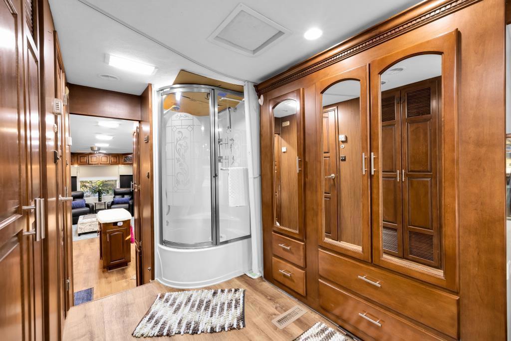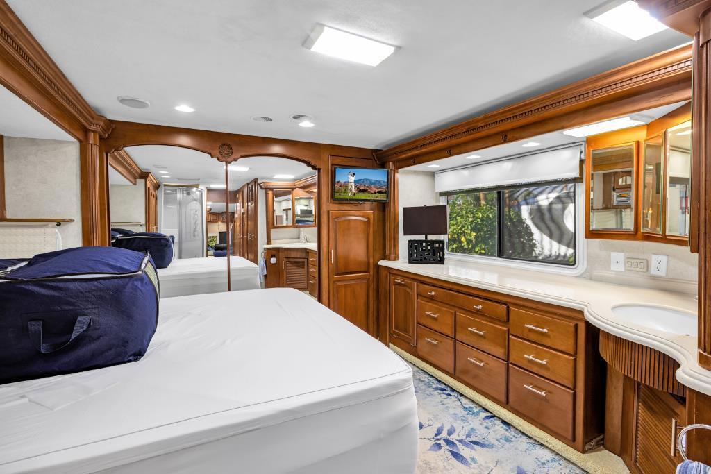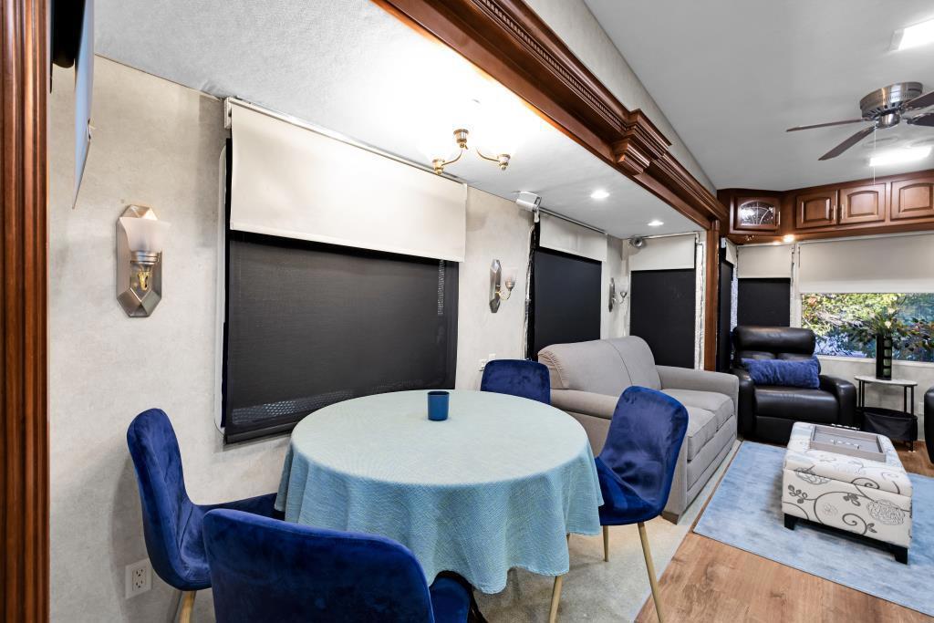Exceptional 2005 Grand Teton Limited RV and lot package, available in a fun, active community. Located on a convenient street -walking distance to our ES clubhouse. Across from the back nine course. Enjoy luxurious, turnkey living with an upgraded outdoor space featuring a shaded pergola and outdoor TV. The impeccably maintained interior boasts ample storage, a living room with fireplace and bar, a gourmet kitchen with a large island, and a master suite with a new queen bed and private bath.
