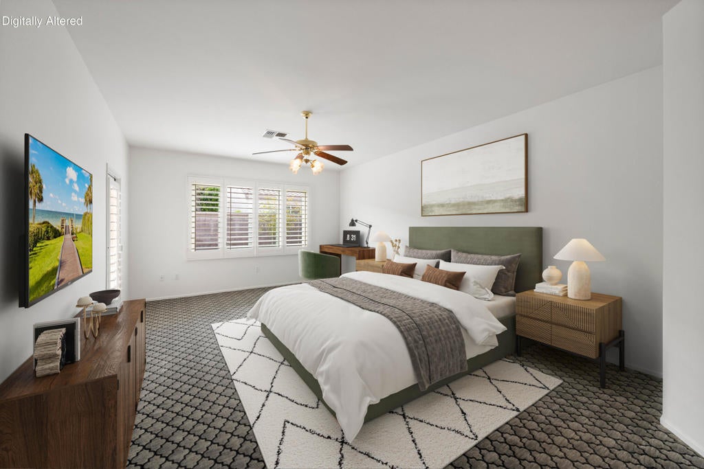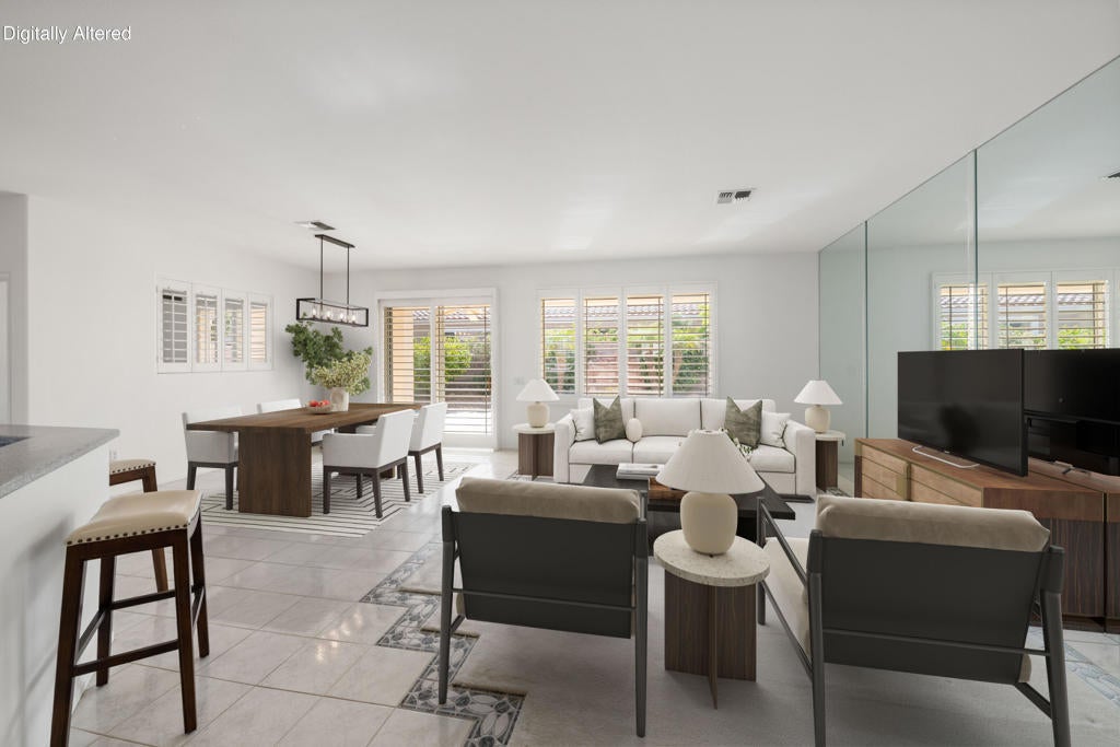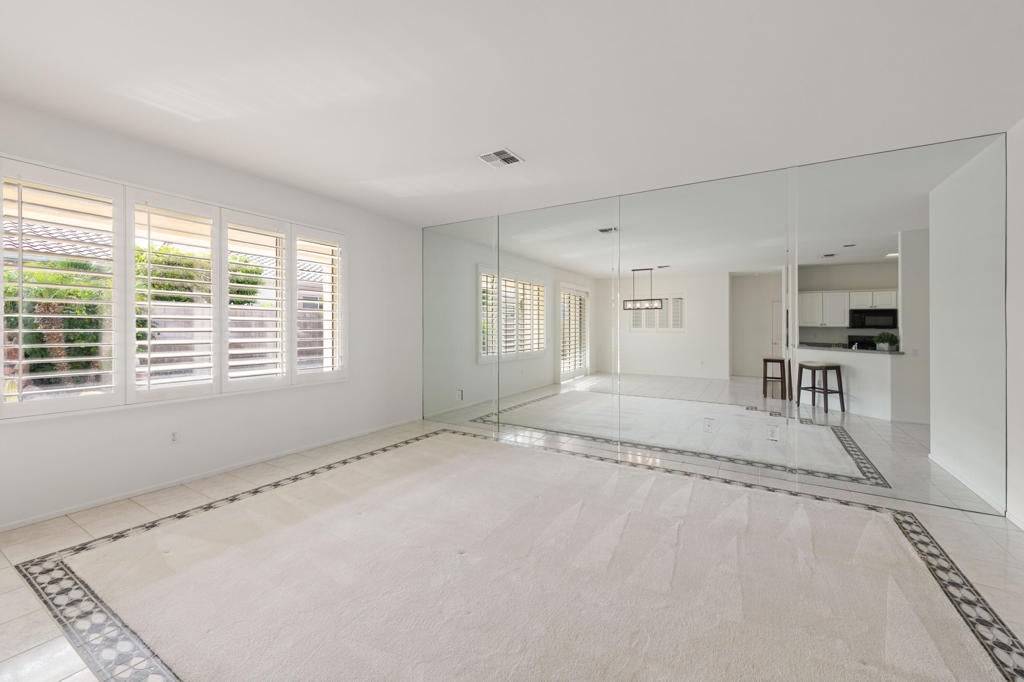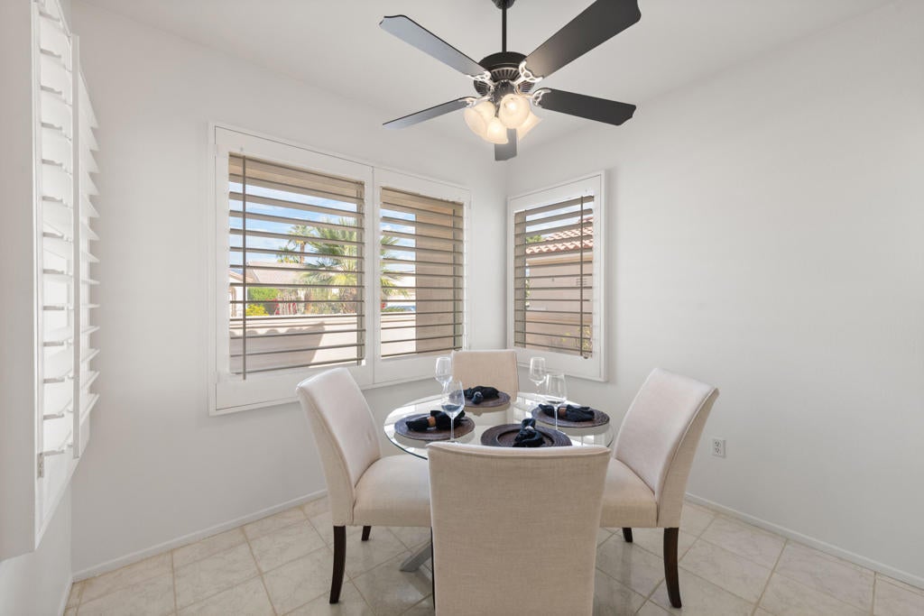 Sun City Palm Desert popular great room Montego floor plan shows pride of ownership and has been meticulously maintained. Most Desirable south facing backyard with 1858 sq.Ft. of living space, 2 bedrooms, 2 full baths, +den can be converted to a 3rd bedroom. Kitchen is spacious with an eating area, upgraded kitchen cabinets, pull out shelves, brushed nickel pulls and desk and matching black appliances. Separate laundry room & 2 car attached garage is fully lined with storage cabinets. The extended primary suite has a French door leading to patio, a step-in shower, double cultured marble vanity and large walk-in closet . The guest bedroom & full bathroom are on the opposite side of the home for privacy. This home has a lot to offer with fresh paint and plantation shutters through-out, custom lighting, lighted ceiling fans, beveled mirror wall, custom tile w/entry medallion design, custom carpet borders and separate dinning area. 2 car garage has Epoxy floors and lined with storage cabinets. Private gated courtyard, and all concrete walk-ways have epoxy, desert landscaping and Sedona rock water fall in rear yard, covered patio so you can enjoy evening dinners or morning coffee. Gated front courtyard. Come enjoy the the Sun City Lifestyle with many clubs and activities.