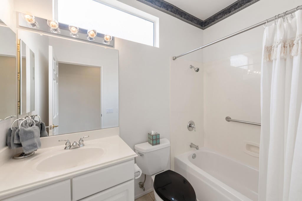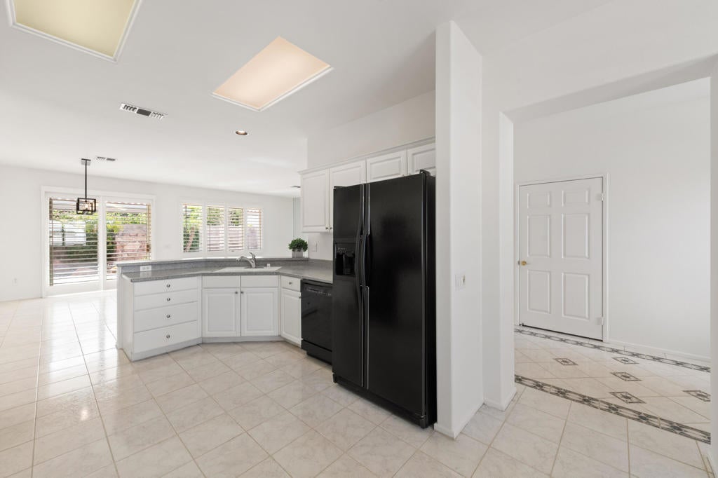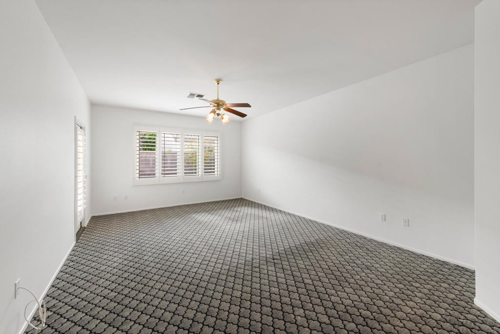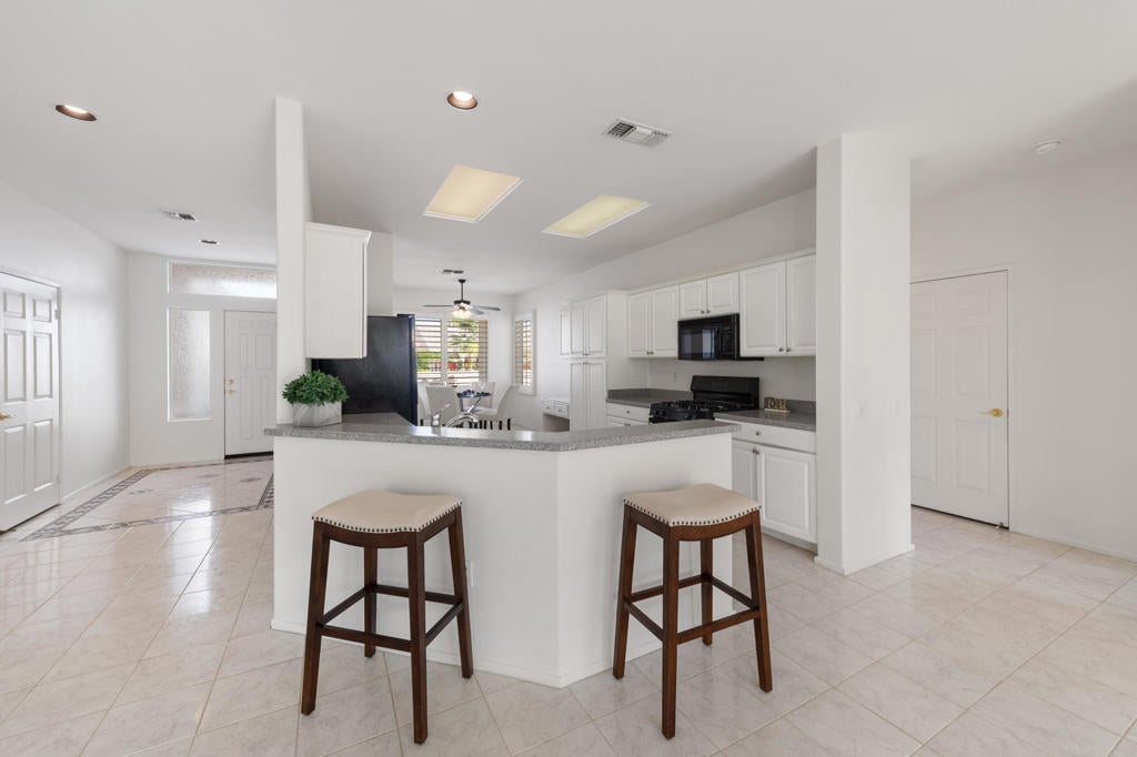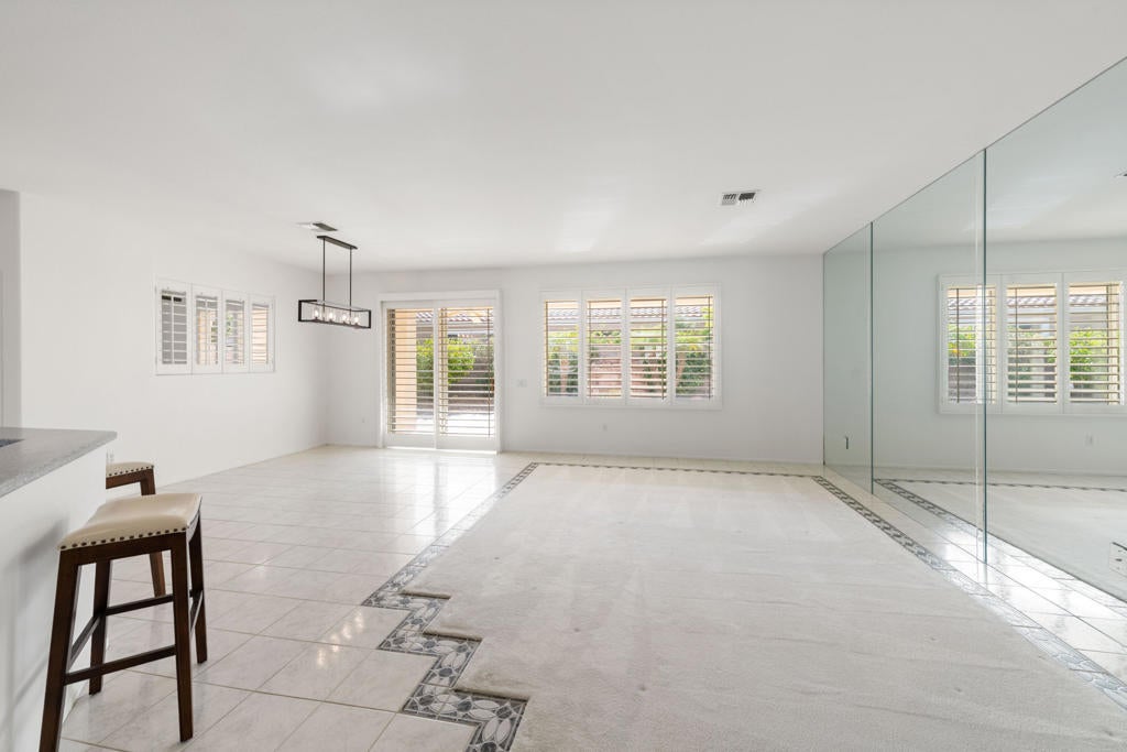 Sun City Palm Desert popular great room Montego floor plan shows pride of ownership and has been meticulously maintained. Most Desirable south facing backyard with 1858 sq.Ft. of living space, 2 bedrooms, 2 full baths, +den can be converted to a 3rd bedroom. Kitchen is spacious with an eating area, upgraded kitchen cabinets, pull out shelves, brushed nickel pulls and desk and matching black appliances. Separate laundry room & 2 car attached garage is fully lined with storage cabinets. The extended primary suite has a French door leading to patio, a step-in shower, double cultured marble vanity and large walk-in closet . The guest bedroom & full bathroom are on the opposite side of the home for privacy. This home has a lot to offer with fresh paint and plantation shutters through-out, custom lighting, lighted ceiling fans, beveled mirror wall, custom tile w/entry medallion design, custom carpet borders and separate dinning area. 2 car garage has Epoxy floors and lined with storage cabinets. Private gated courtyard, and all concrete walk-ways have epoxy, desert landscaping and Sedona rock water fall in rear yard, covered patio so you can enjoy evening dinners or morning coffee. Gated front courtyard. Come enjoy the the Sun City Lifestyle with many clubs and activities.